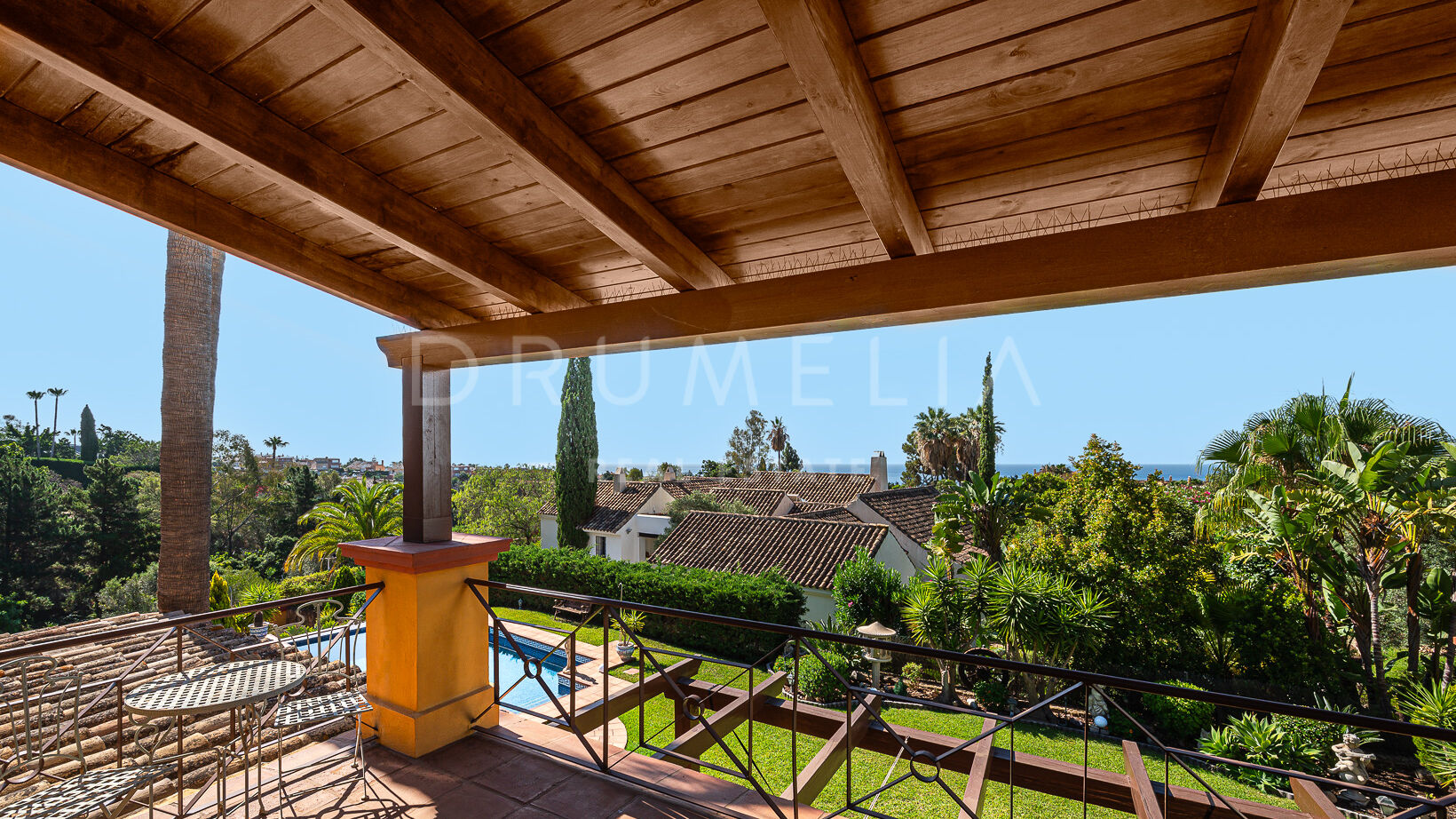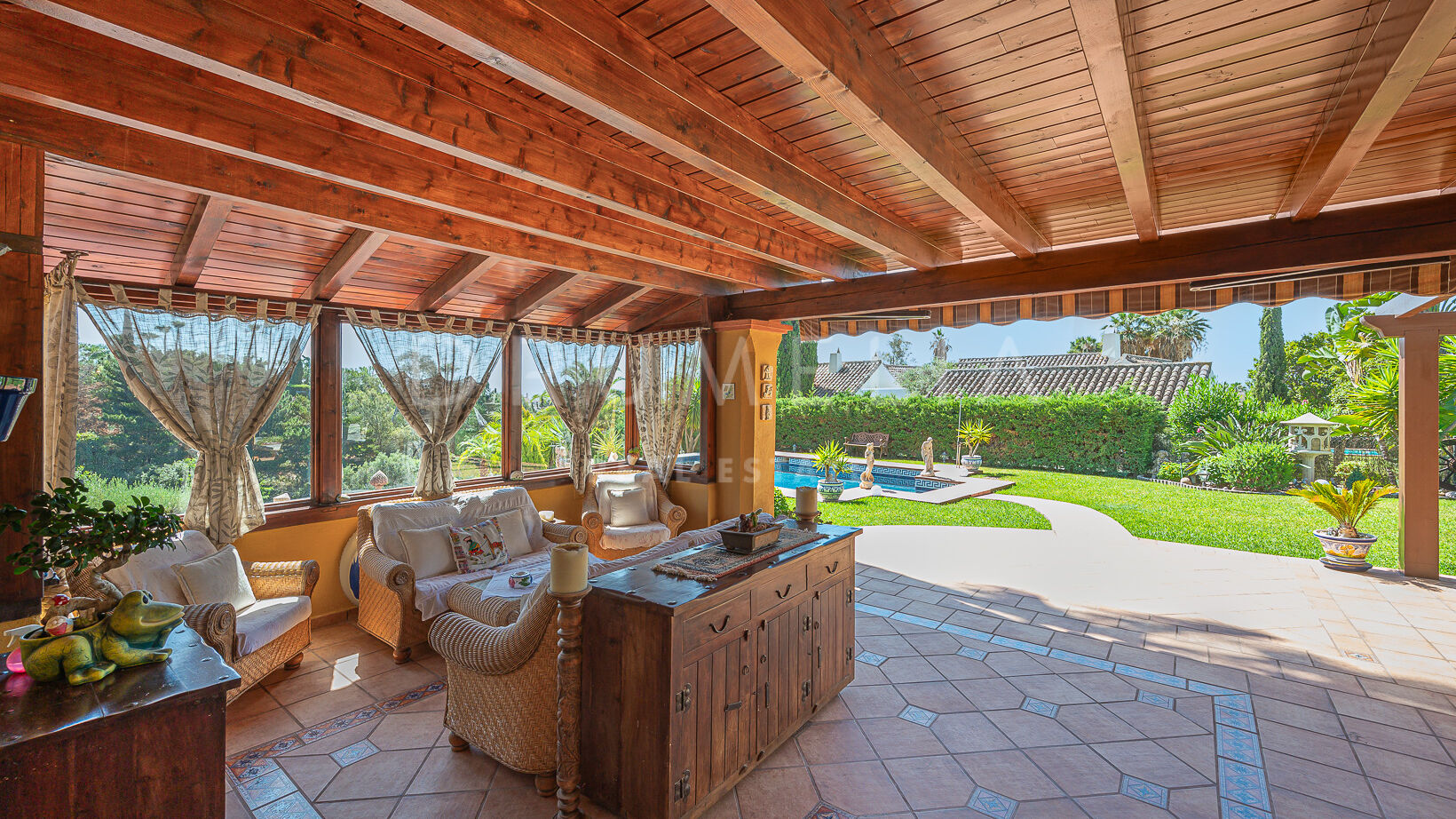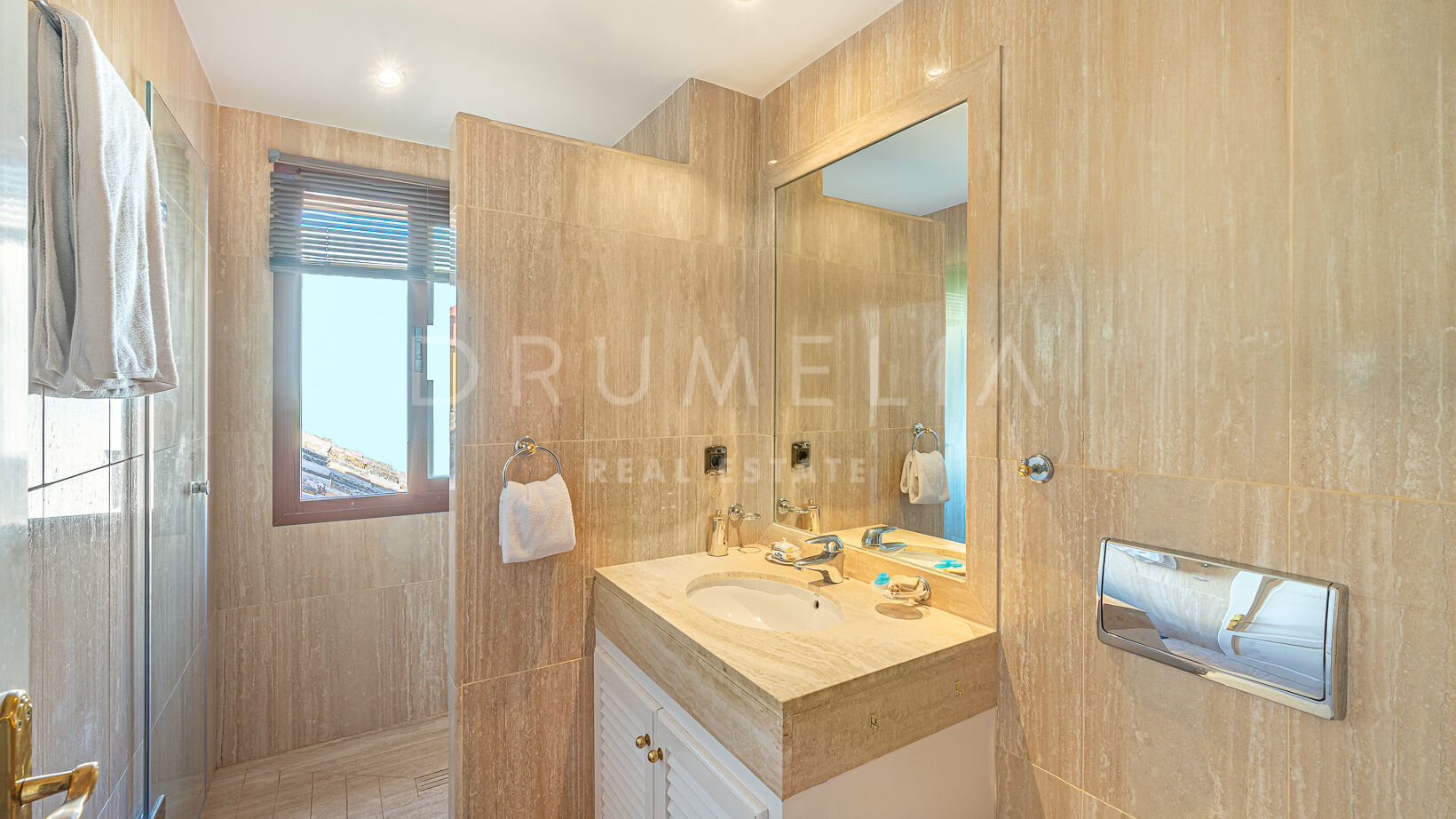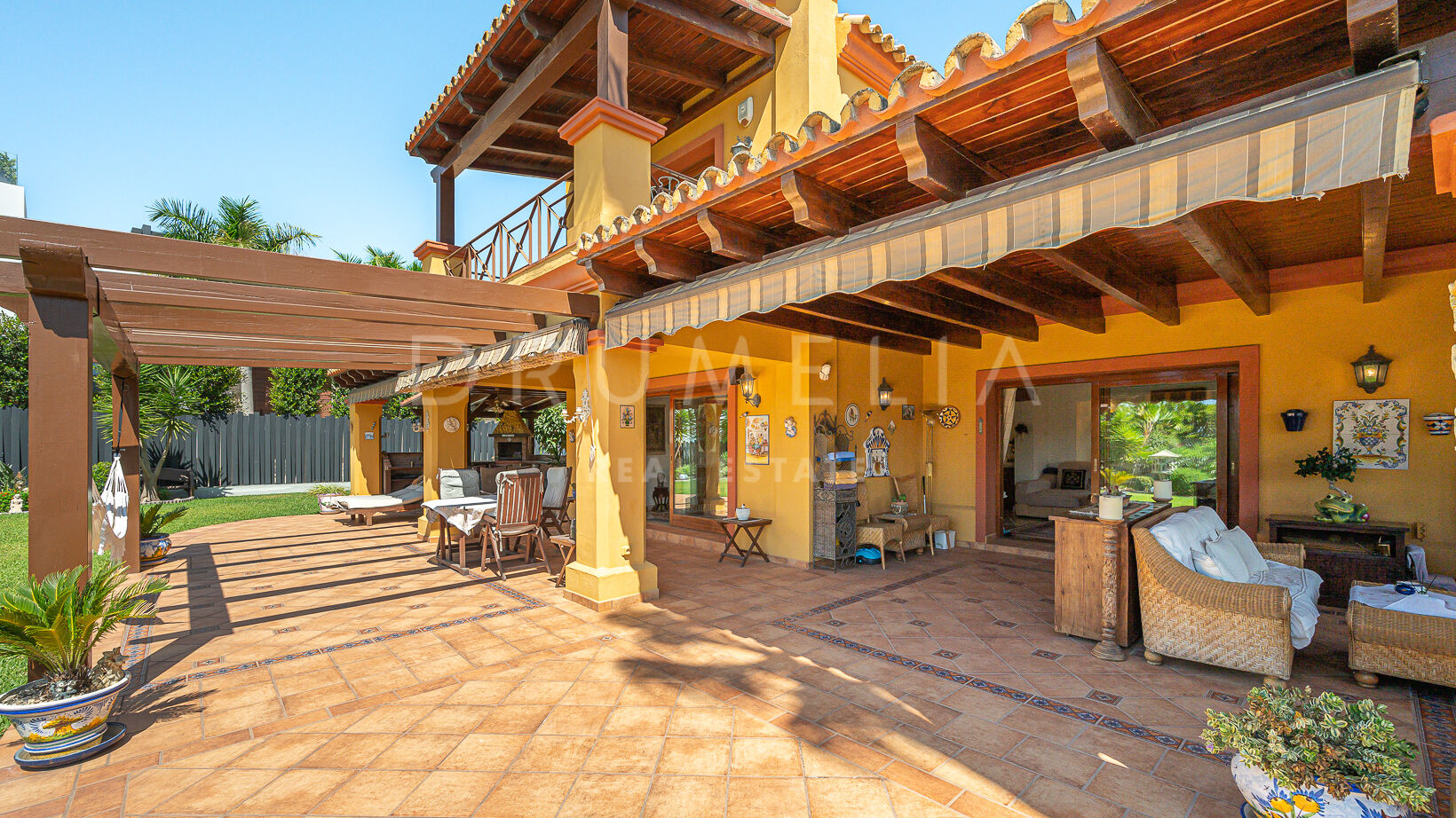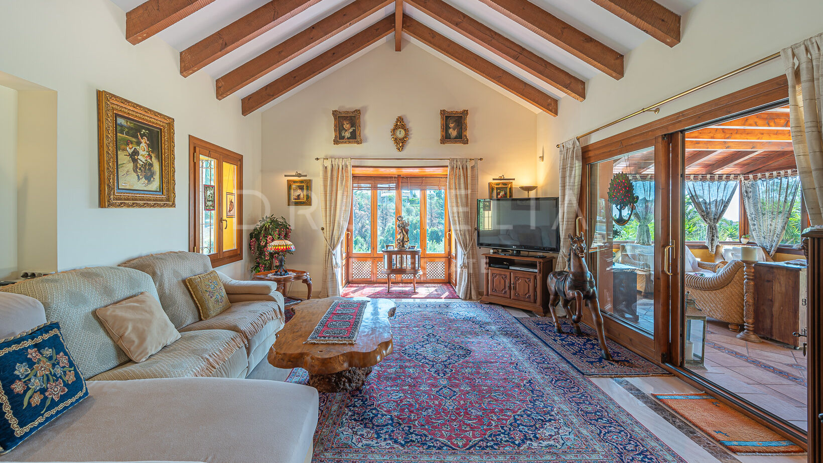 Entourée d’une nature luxuriante et des propriétés haut de gamme du Golden Mile, cette extraordinaire maison de 726 m² avec 40 m² de terrasses et un terrain pittoresque de 1 480 m² illustre l’élégance et le style méditerranéens. Exposée au sud, elle bénéficie d’une lumière naturelle abondante et d’une vue imprenable sur la mer et la légendaire montagne de La Concha, parfaitement complétée par une vue agréable sur le jardin avec une piscine à débordement. Impeccablement conçue sur 3 niveaux, la villa dégage une grâce intemporelle avec son marbre blanc immaculé et ses finitions en bois de qualité supérieure. Dès l’entrée, un grand hall avec double hauteur de plafond vous invite à pénétrer dans l’aile centrale de la salle de séjour, qui a pour point d’ancrage une cheminée et qui dégage un véritable chic classique. Le salon mène à la magnifique terrasse principale et aux jardins subtropicaux magnifiquement aménagés avec des pelouses vertes et de grands palmiers. Cette maison offre plusieurs espaces extérieurs et terrasses, couvertes ou ensoleillées, ainsi qu’un charmant patio avec une fontaine de style traditionnel. Idéal pour profiter de la vie méditerranéenne la plus agréable, organiser des soirées sous les étoiles, des barbecues entre amis et d’inoubliables dîners en famille à la belle étoile ! Sur la gauche, un charmant gazebo vous attend, et la terrasse couverte avec ses plafonds en bois marie harmonieusement l’intérieur et l’extérieur. L’espace de vie spacieux fusionne avec la salle à manger, qui s’étend jusqu’à un charmant espace barbecue. La cuisine rustique à la mode, avec un coin repas intégré, des appareils Siemens et Gaggenau, et une buanderie adjacente, est également reliée à une terrasse extérieure. Cet étage comprend une suite de chambre à coucher.