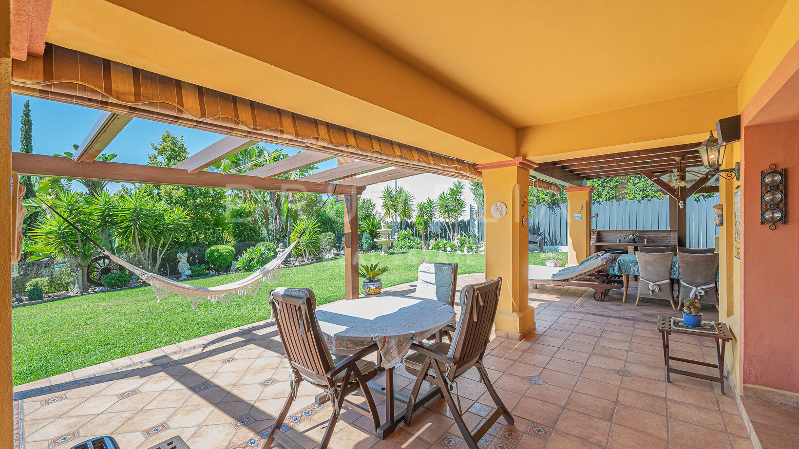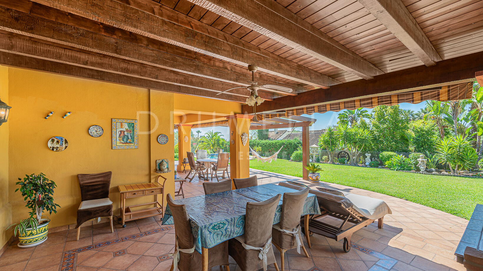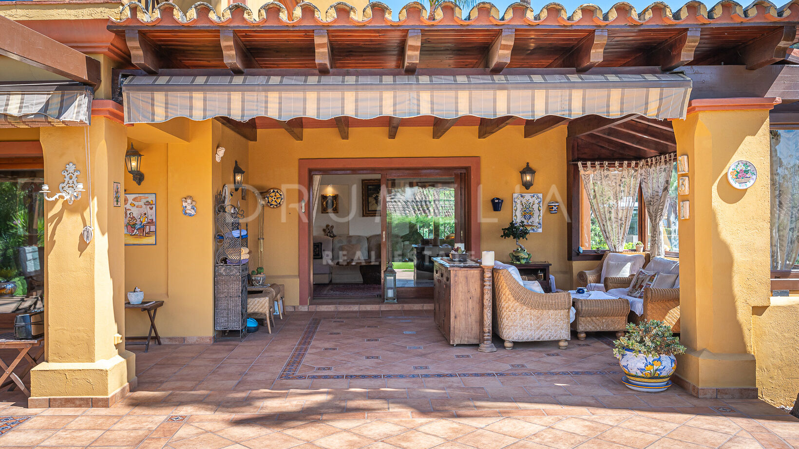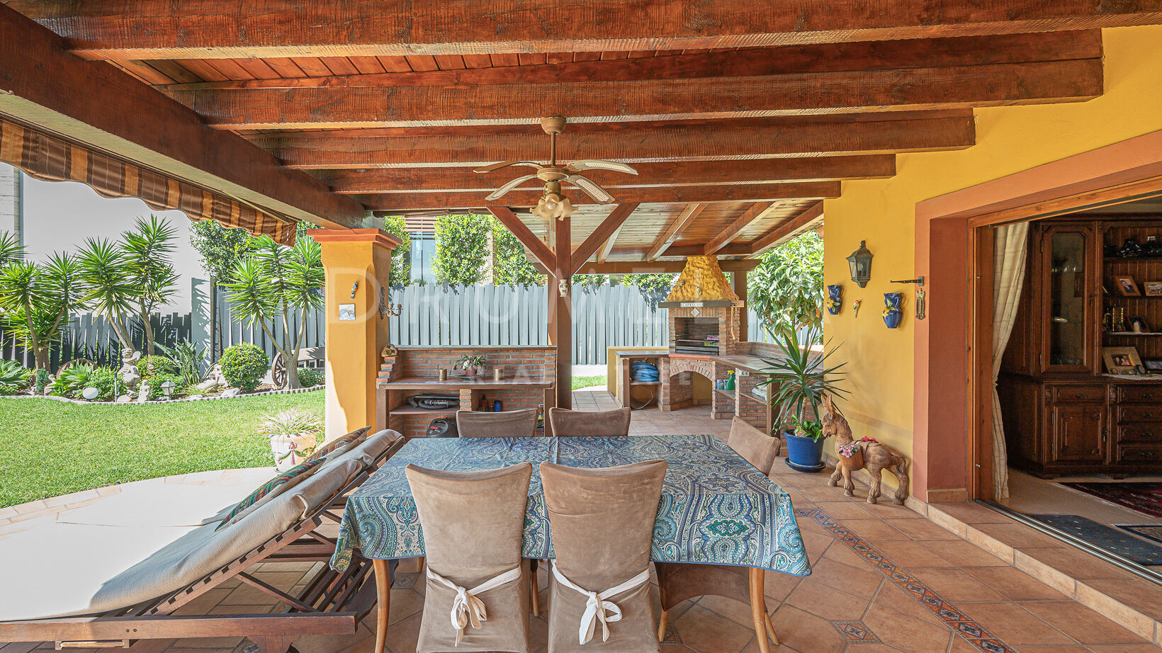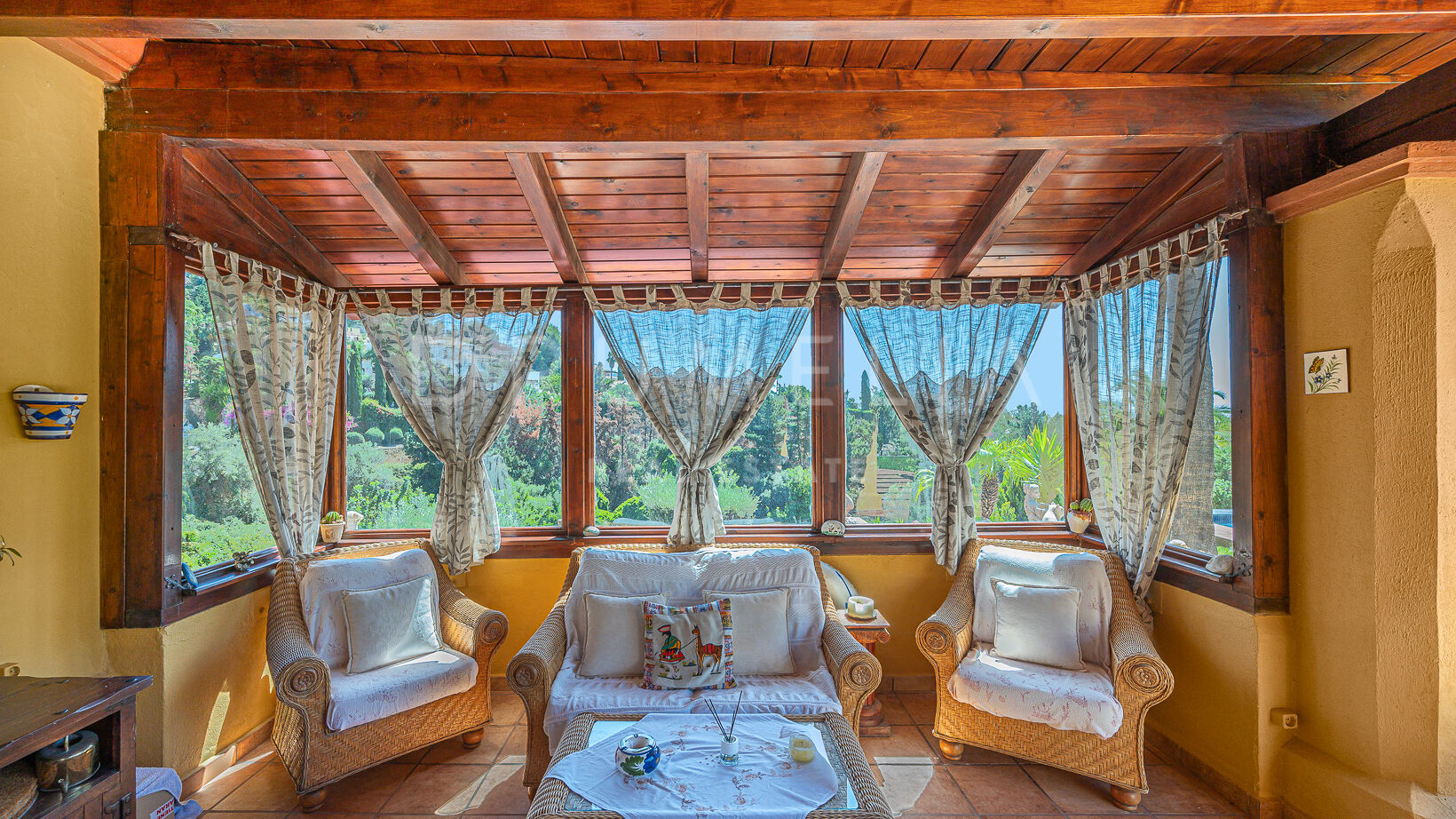 Entourée d’une nature luxuriante et des propriétés haut de gamme du Golden Mile, cette extraordinaire maison de 726 m² avec 40 m² de terrasses et un terrain pittoresque de 1 480 m² illustre l’élégance et le style méditerranéens. Exposée au sud, elle bénéficie d’une lumière naturelle abondante et d’une vue imprenable sur la mer et la légendaire montagne de La Concha, parfaitement complétée par une vue agréable sur le jardin avec une piscine à débordement. Impeccablement conçue sur 3 niveaux, la villa dégage une grâce intemporelle avec son marbre blanc immaculé et ses finitions en bois de qualité supérieure. Dès l’entrée, un grand hall avec double hauteur de plafond vous invite à pénétrer dans l’aile centrale de la salle de séjour, qui a pour point d’ancrage une cheminée et qui dégage un véritable chic classique. Le salon mène à la magnifique terrasse principale et aux jardins subtropicaux magnifiquement aménagés avec des pelouses vertes et de grands palmiers. Cette maison offre plusieurs espaces extérieurs et terrasses, couvertes ou ensoleillées, ainsi qu’un charmant patio avec une fontaine de style traditionnel. Idéal pour profiter de la vie méditerranéenne la plus agréable, organiser des soirées sous les étoiles, des barbecues entre amis et d’inoubliables dîners en famille à la belle étoile ! Sur la gauche, un charmant gazebo vous attend, et la terrasse couverte avec ses plafonds en bois marie harmonieusement l’intérieur et l’extérieur. L’espace de vie spacieux fusionne avec la salle à manger, qui s’étend jusqu’à un charmant espace barbecue. La cuisine rustique à la mode, avec un coin repas intégré, des appareils Siemens et Gaggenau, et une buanderie adjacente, est également reliée à une terrasse extérieure. Cet étage comprend une suite de chambre à coucher.