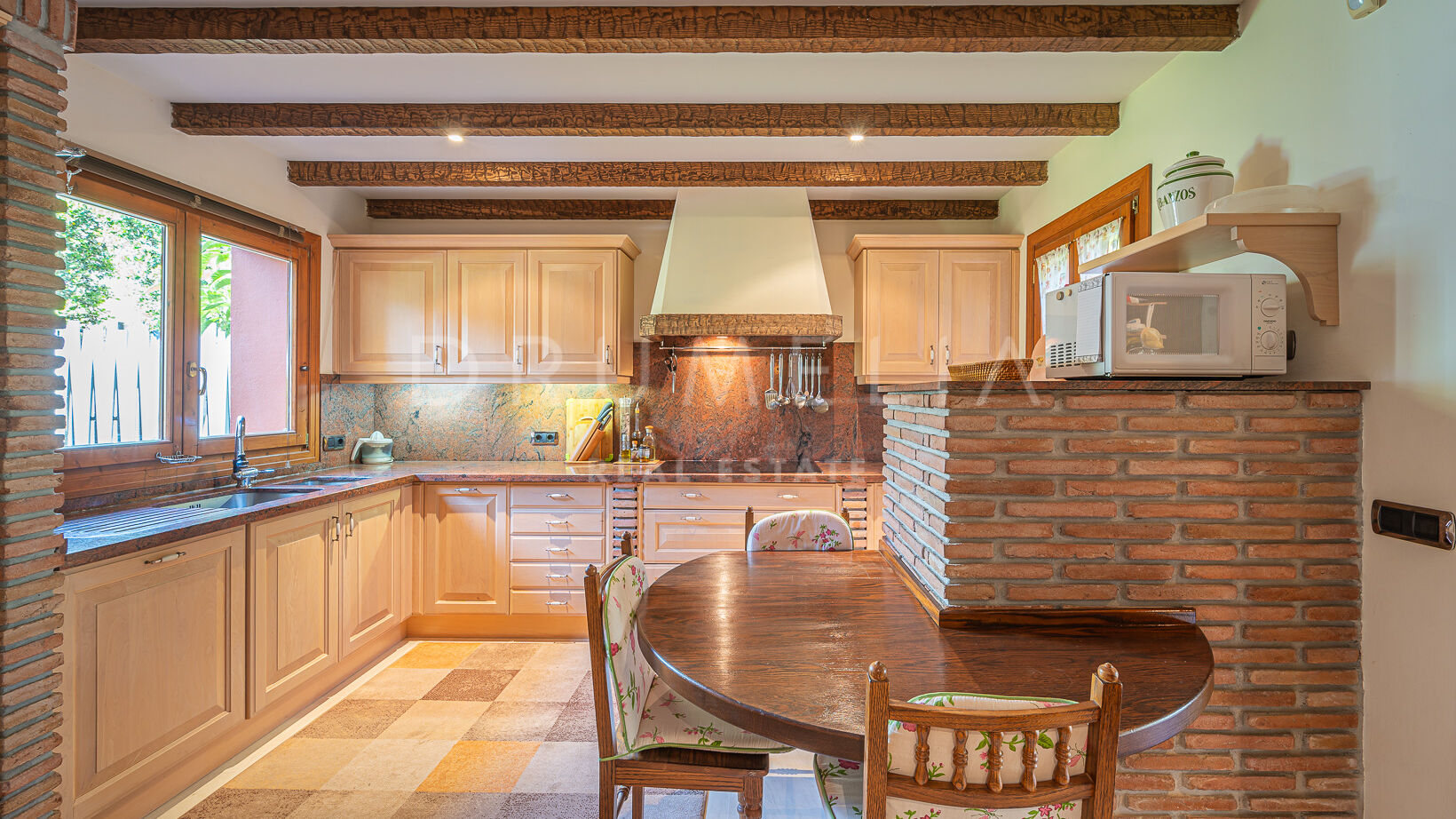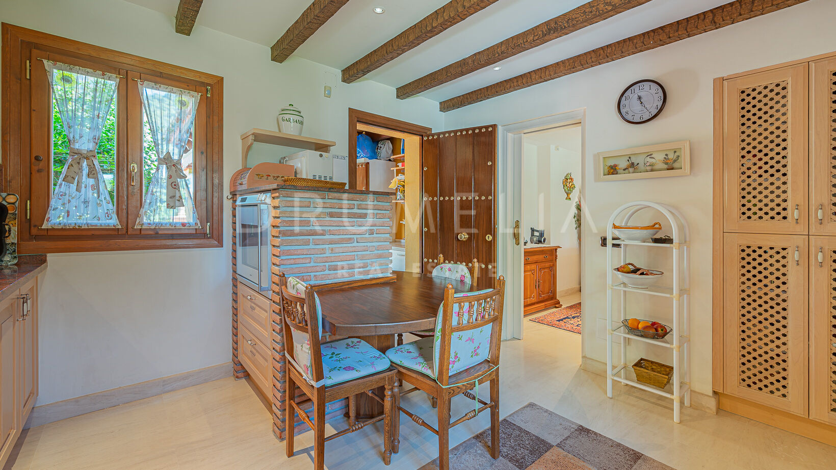 En montant au premier étage par un élégant escalier, vous découvrirez l’impressionnante suite parentale avec un plafond à poutres apparentes. Elle dispose d’une terrasse privée avec vue panoramique sur la mer et de deux dressings séparés. La somptueuse salle de bains en marbre, avec baignoire d’hydromassage et douche séparée, offre de superbes vues sur la mer. La deuxième chambre, la suite d’invités, offre également aux résidents des vues panoramiques impressionnantes, cette fois-ci sur les montagnes. Le niveau inférieur de la maison offre un havre de divertissement, avec notamment une grande cave à vin climatisée pouvant contenir plus de 1 000 bouteilles, qui peut également être utilisée comme salle de cinéma. Un sauna finlandais attenant avec salle de bains invite à la détente. De plus, un bureau spacieux avec une entrée privée et une salle de bains pour les invités, un généreux garage de 60 m², un entrepôt et une salle des machines pratique ajoutent à la commodité et à la fonctionnalité.