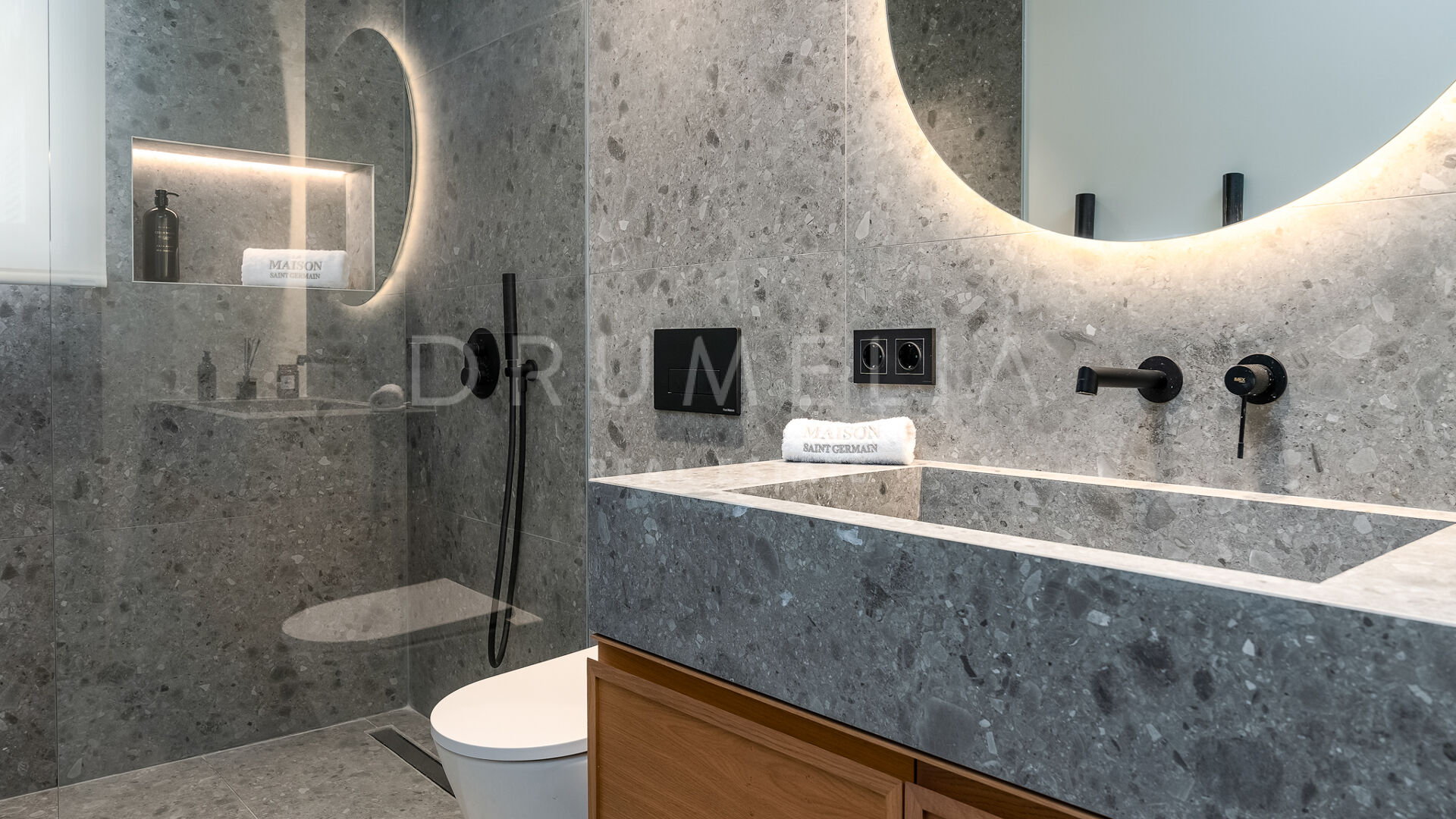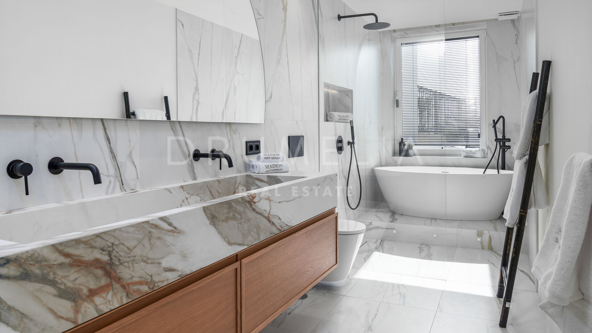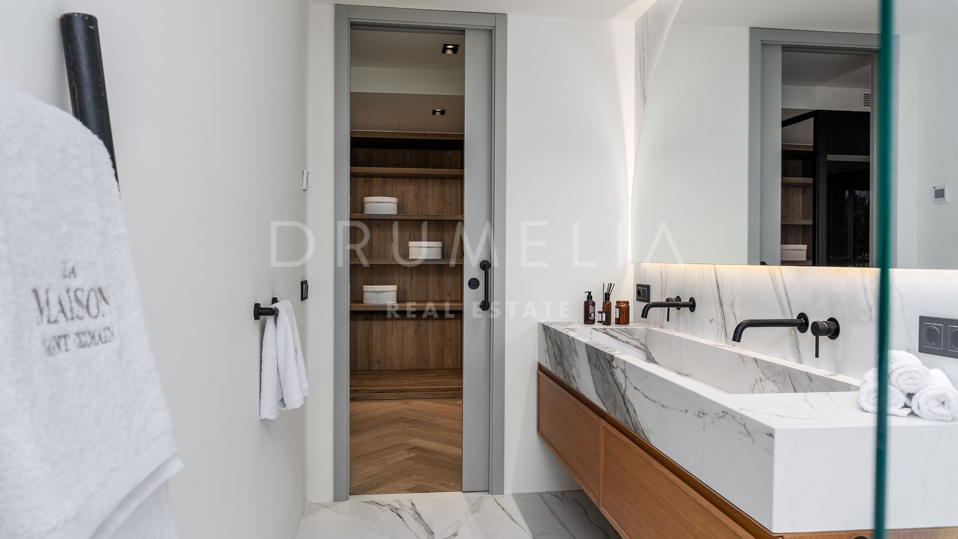 La maison de 294 m² orientée au sud offre un design andalou spectaculaire et des vues ravissantes sur les environs verdoyants et la mer (partielle). Conçue pour un style de vie des plus confortables, elle maximise le sens de l’intimité et se fond dans l’environnement naturel avec élégance et grâce. Elle comprend 3 chambres, 3 salles de bains (toutes en-suite) et 1 toilette pour les invités. En entrant dans la propriété, on découvre de magnifiques espaces de vie et de repas avec un sol en bois à chevrons et une palette de couleurs naturelles, une cuisine ouverte entièrement équipée Gaggenau avec accès à un patio privé, une suite parentale avec un superbe dressing pour accueillir les collections des designers, et une baignoire autoportante. Elle donne sur la terrasse principale avec vue sur la mer, tandis que la deuxième chambre donne sur le patio.