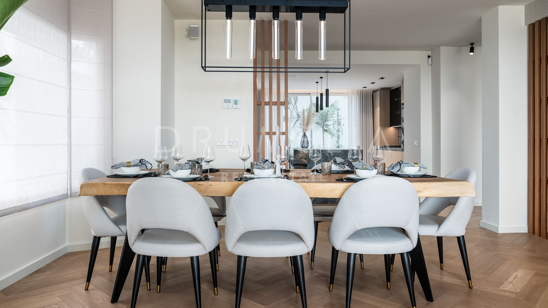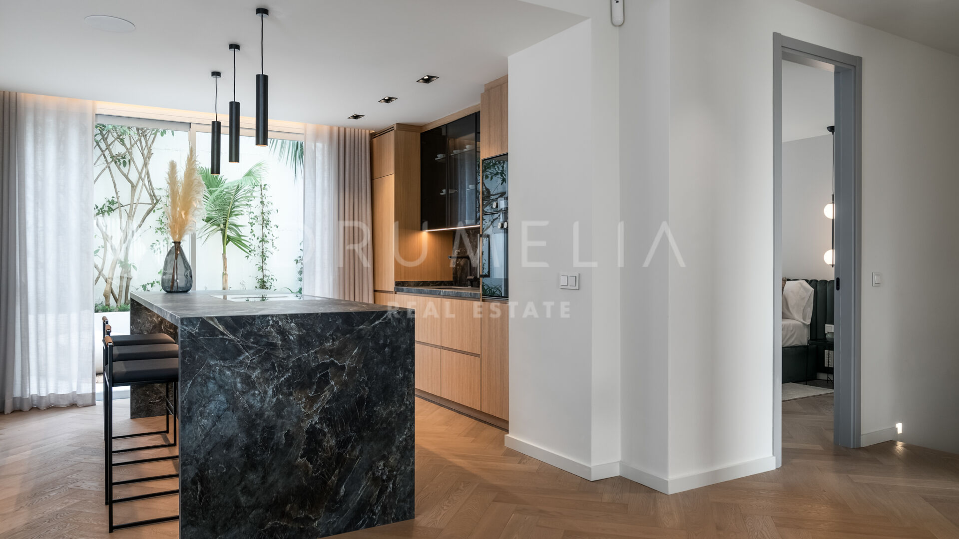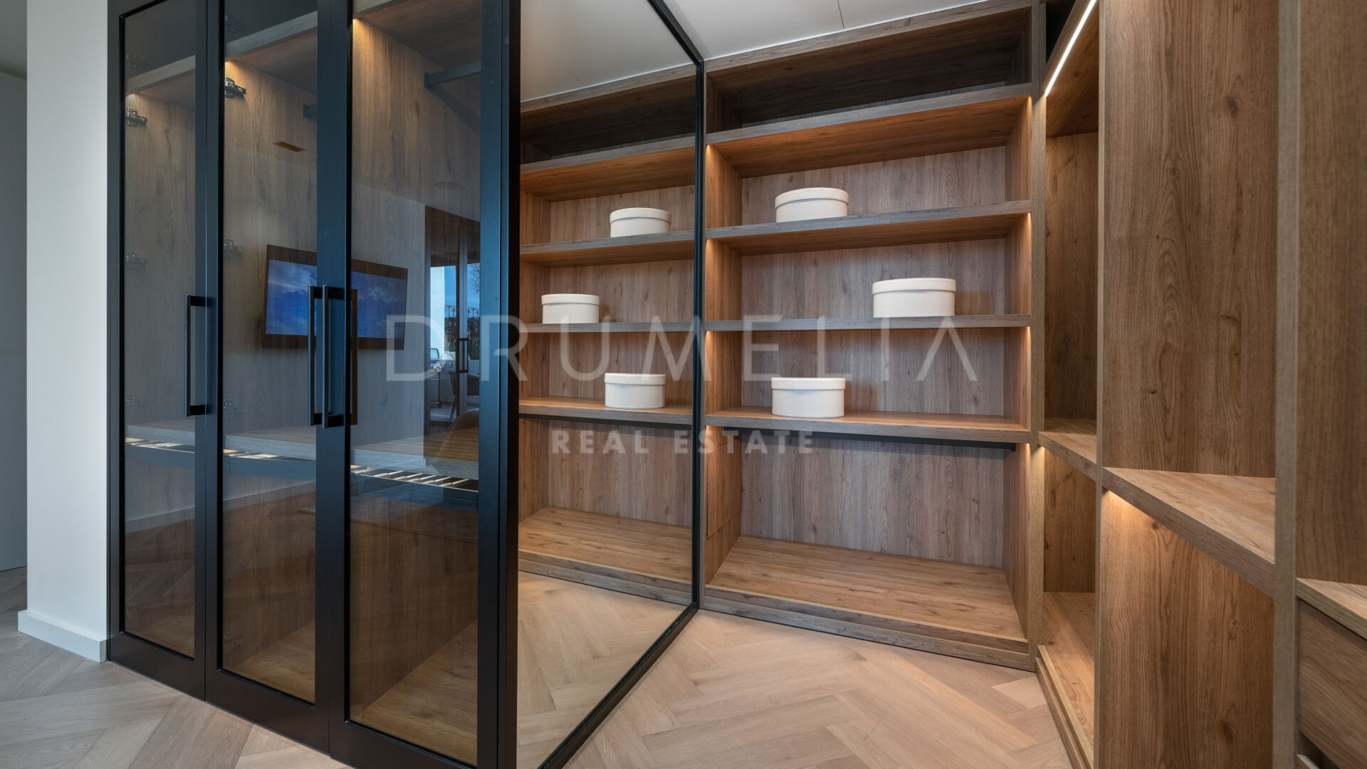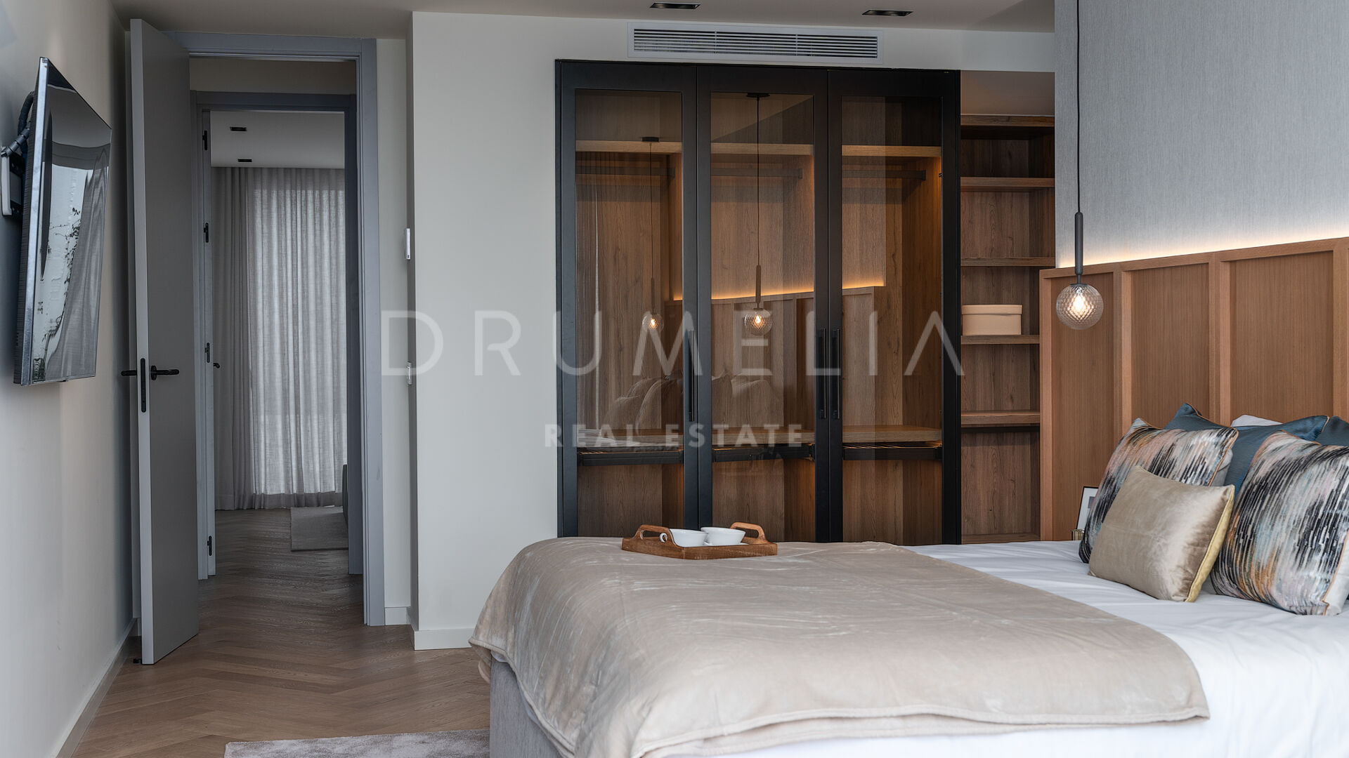 La maison de 294 m² orientée au sud offre un design andalou spectaculaire et des vues ravissantes sur les environs verdoyants et la mer (partielle). Conçue pour un style de vie des plus confortables, elle maximise le sens de l’intimité et se fond dans l’environnement naturel avec élégance et grâce. Elle comprend 3 chambres, 3 salles de bains (toutes en-suite) et 1 toilette pour les invités. En entrant dans la propriété, on découvre de magnifiques espaces de vie et de repas avec un sol en bois à chevrons et une palette de couleurs naturelles, une cuisine ouverte entièrement équipée Gaggenau avec accès à un patio privé, une suite parentale avec un superbe dressing pour accueillir les collections des designers, et une baignoire autoportante. Elle donne sur la terrasse principale avec vue sur la mer, tandis que la deuxième chambre donne sur le patio.