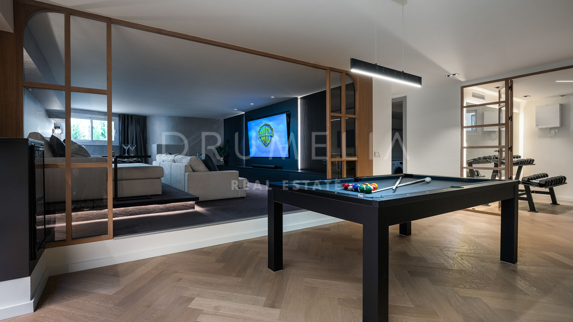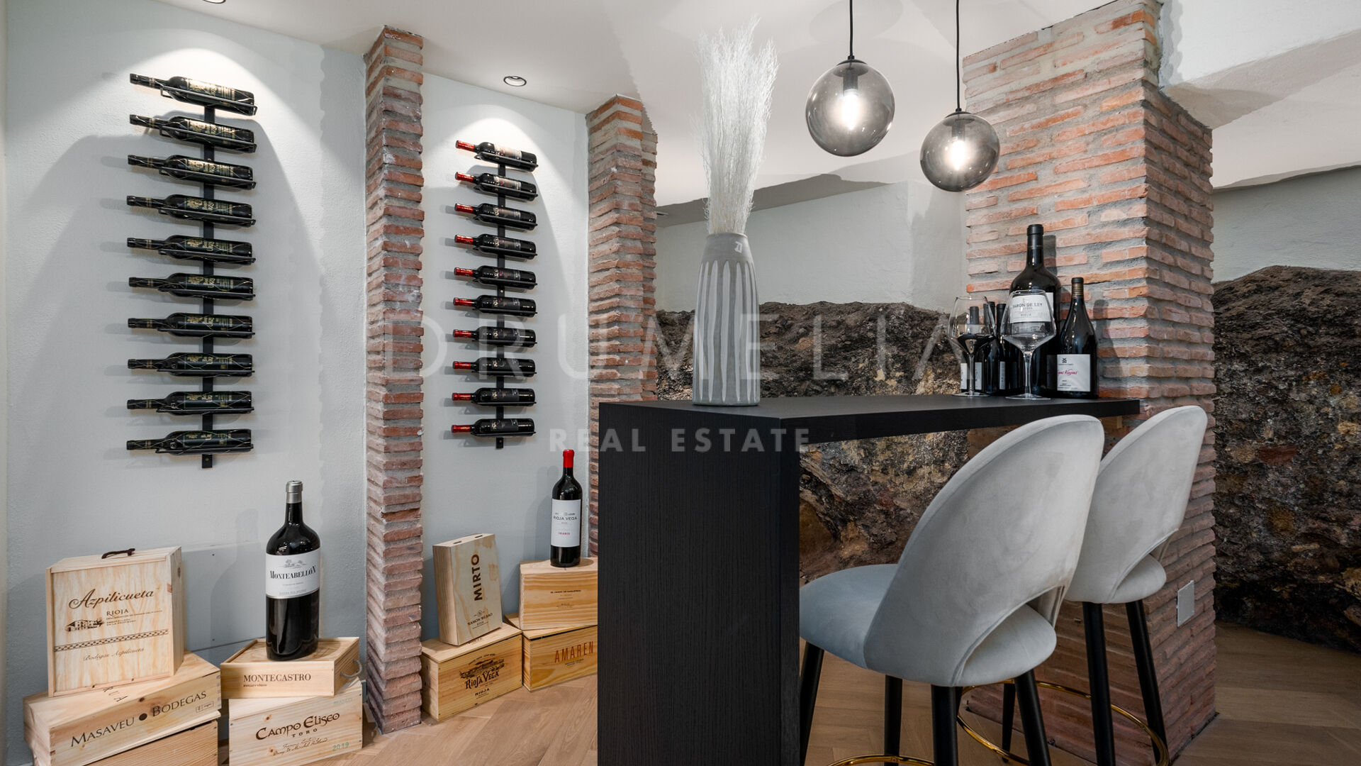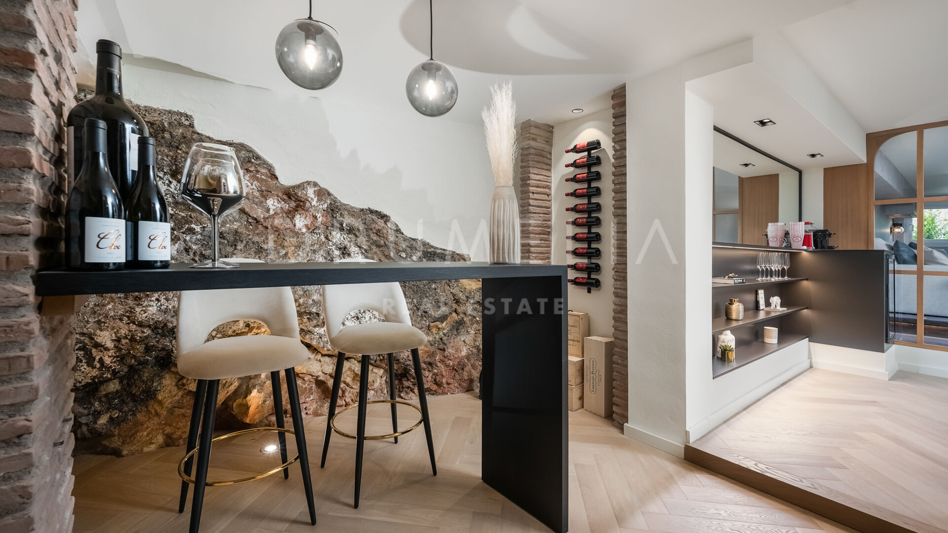 Le rez-de-chaussée inférieur offre une grande utilisation de l’espace. On y trouve un espace de divertissement avec un billard et un bar, ainsi qu’un home cinéma, une salle de sport et une cave à vin unique où la roche naturelle a été laissée intacte comme un élément de valeur. En outre, il y a des toilettes pour les invités, une buanderie spacieuse et la troisième chambre à coucher. La propriété dispose de terrasses agréables de 63 m² avec de belles vues, des espaces de détente, de barbecue et de repas en plein air, ainsi qu’un accès au jardin avec douche extérieure. La maison de ville haut de gamme a été rénovée selon les normes les plus strictes, avec des matériaux de qualité supérieure et une technologie innovante, et se vend en excellent état et avec un confort moderne. Cette fabuleuse propriété combine parfaitement le charme andalou, une décoration intérieure sophistiquée et des équipements entièrement fonctionnels et bien pensés. C’est ce que tu cherches ?