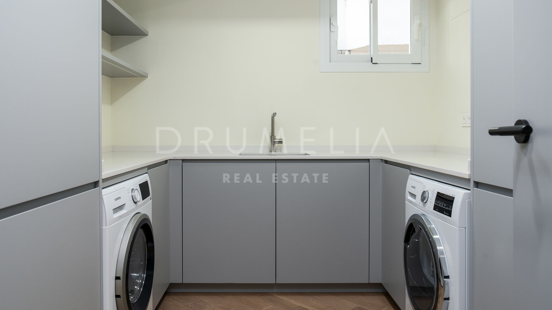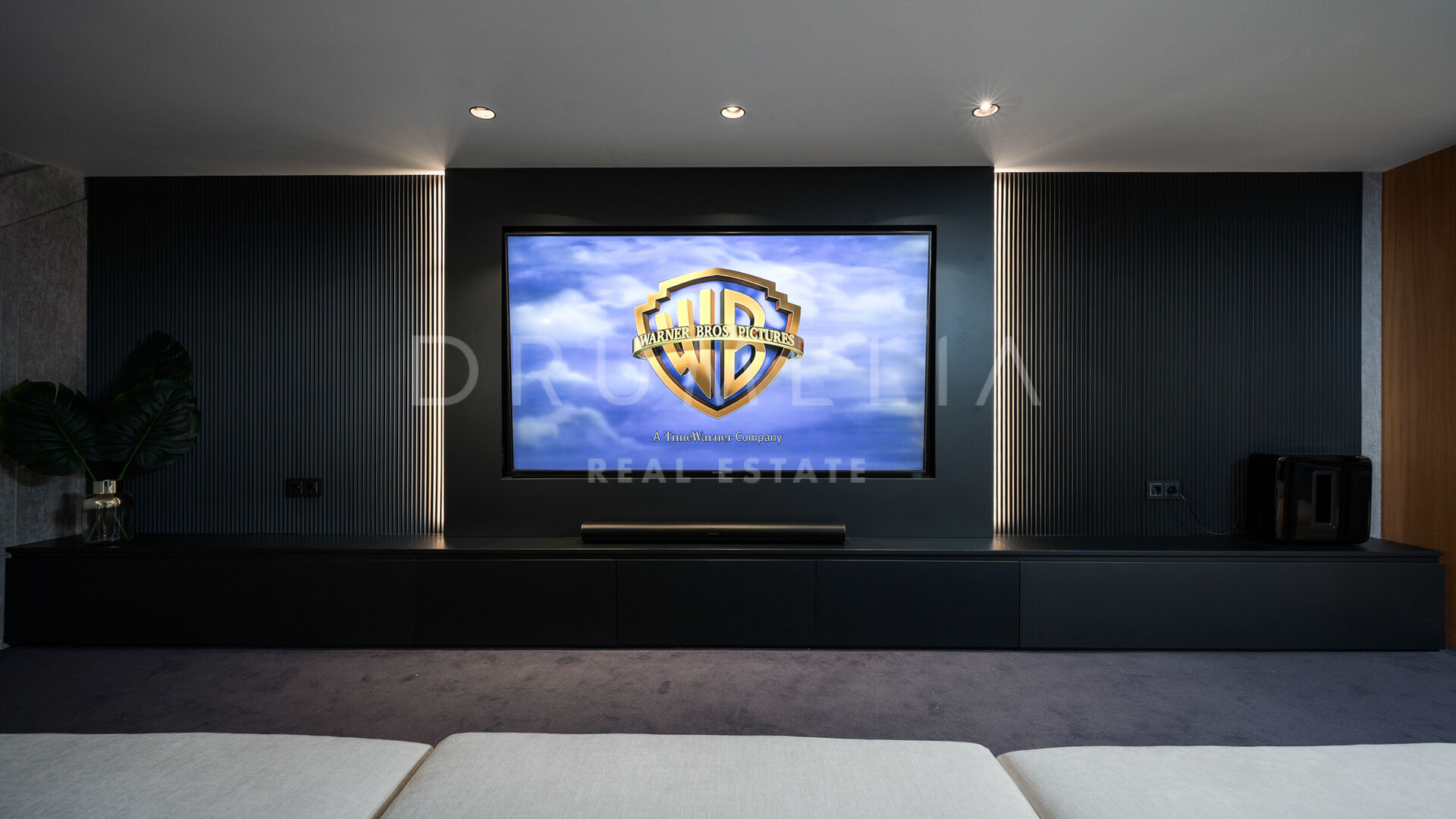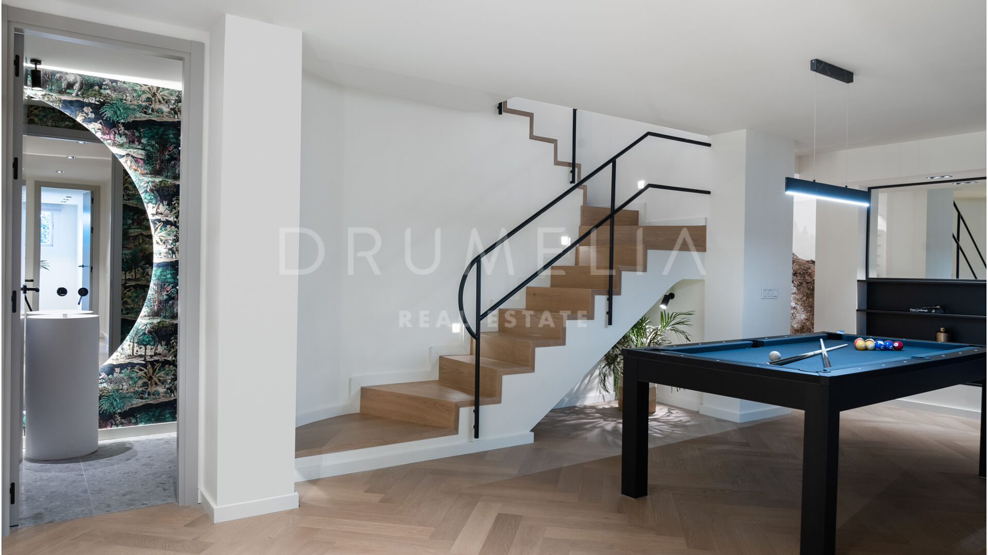 Le rez-de-chaussée inférieur offre une grande utilisation de l’espace. On y trouve un espace de divertissement avec un billard et un bar, ainsi qu’un home cinéma, une salle de sport et une cave à vin unique où la roche naturelle a été laissée intacte comme un élément de valeur. En outre, il y a des toilettes pour les invités, une buanderie spacieuse et la troisième chambre à coucher. La propriété dispose de terrasses agréables de 63 m² avec de belles vues, des espaces de détente, de barbecue et de repas en plein air, ainsi qu’un accès au jardin avec douche extérieure. La maison de ville haut de gamme a été rénovée selon les normes les plus strictes, avec des matériaux de qualité supérieure et une technologie innovante, et se vend en excellent état et avec un confort moderne. Cette fabuleuse propriété combine parfaitement le charme andalou, une décoration intérieure sophistiquée et des équipements entièrement fonctionnels et bien pensés. C’est ce que tu cherches ?