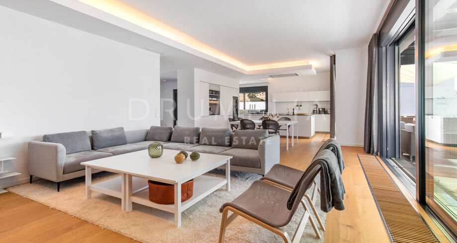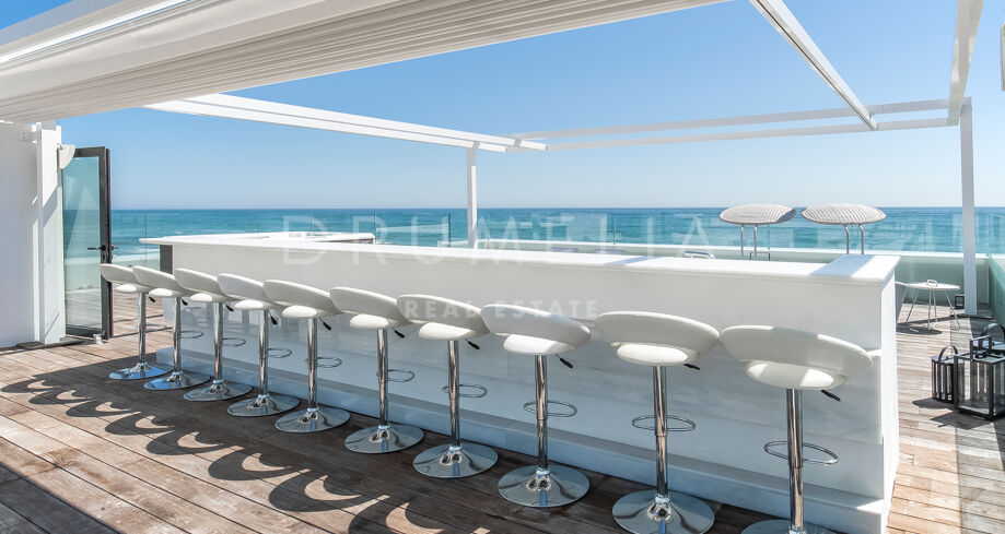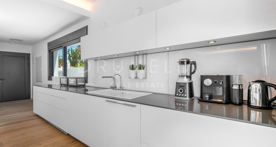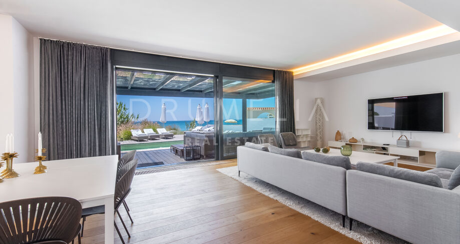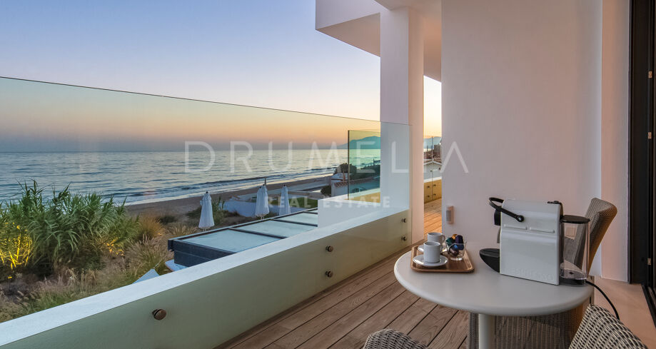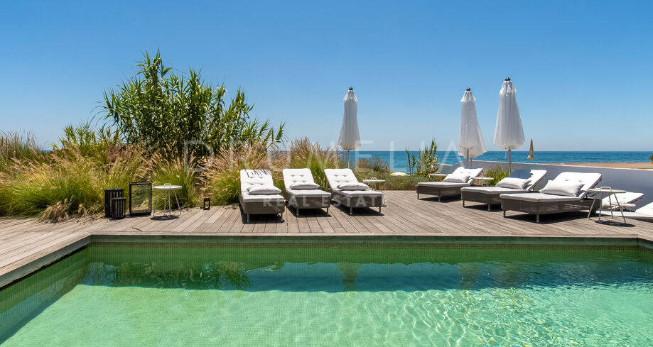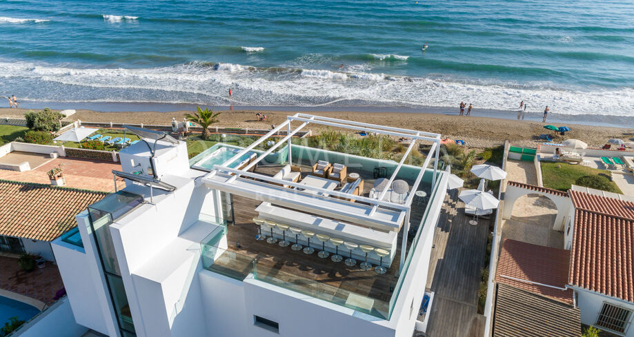 Elle a été conçue de manière exquise par l’architecte Jose Carlos Moya, l’un des meilleurs de Marbella, et construite selon les normes les plus élevées dans un environnement naturel fascinant. Cette propriété de style contemporain de 558 m² impressionne par son sens de l’intimité, sa sophistication moderne et son élégance. La porte d’entrée s’ouvre sur un hall d’entrée spacieux à double hauteur, menant à un vaste salon avec une salle à manger et une grande et intelligente cuisine ouverte, entièrement et superbement équipée avec les derniers appareils modernes. Au niveau de l’entrée, il y a également une chambre d’amis avec un placard et une salle de bains. De la cuisine et du salon, de grandes portes coulissantes avec des stores de sécurité électriques mènent à une terrasse élégante et à une piscine chauffée. Un chemin pittoresque partant de la zone de la piscine mène à travers les dunes de sable directement à la plage ! La mer fera définitivement partie de votre maison ici.