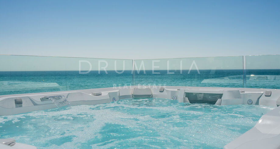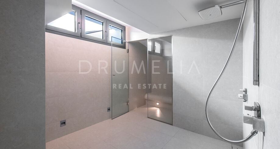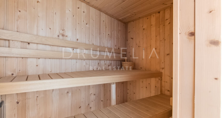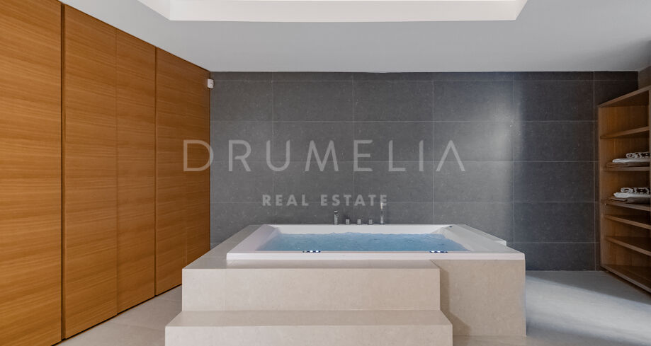 A l’étage, il y a 3 chambres : Suite principale avec 2 armoires, salle de bain et terrasse, et 2 chambres partageant une salle de bain, chacune avec un accès direct à la terrasse offrant des vues incroyables sur la mer. Le niveau inférieur bénéficie de la lumière naturelle et accueille 2 autres chambres avec placards et une salle de bain, ainsi qu’un espace SPA avec jacuzzi, bain de vapeur, sauna et douches ; un espace de rangement et une buanderie. Un fabuleux solarium/terrasse sur le toit avec pergola et jacuzzi est parfait pour profiter de vues à 360 degrés et de magnifiques couchers de soleil. Il dispose également d’un équipement de fitness.