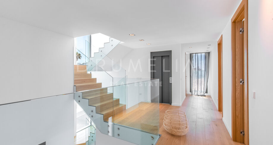 Chaque étage est desservi par un ascenseur moderne et un bel escalier en chêne avec des rampes en verre. L’intérieur est composé de matériaux et de finitions de qualité supérieure provenant de fabricants internationaux. Les armoires en chêne de haute qualité, les sols en marbre et en parquet ajoutent du charme, les éléments de fenêtres et de portes en aluminium impressionnent par leurs détails élégants dans un look mince et à la mode. L’éclairage LED offre une efficacité énergétique incroyable. La combinaison merveilleuse de bois naturel, de verre, de pierre et de béton a permis de créer une maison au style exceptionnel.