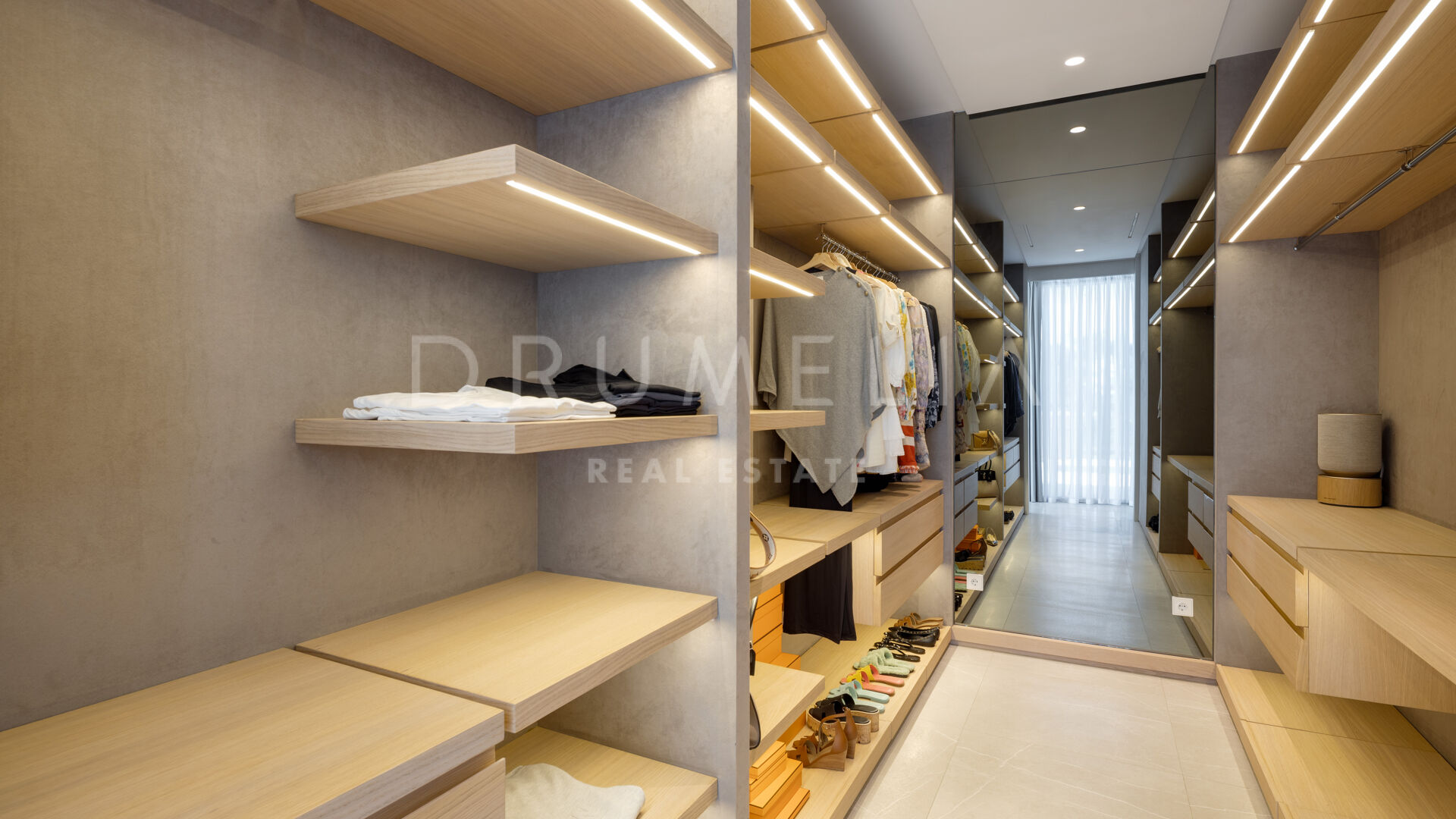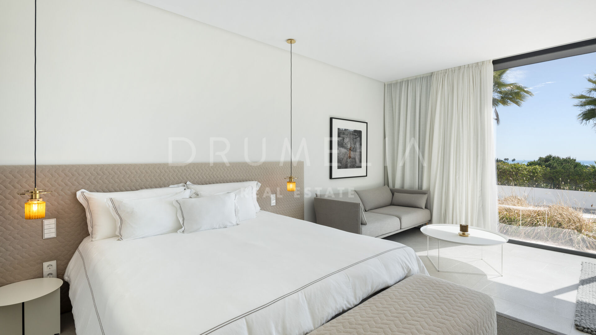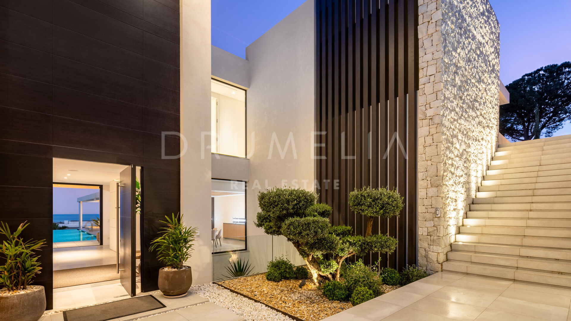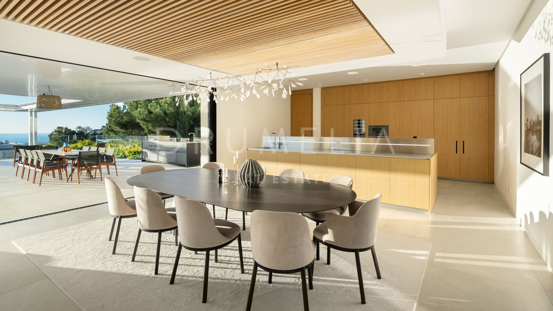 Avec ses huit chambres spacieuses avec salle de bains privative et ses deux salles de bains supplémentaires pour les invités, cette maison est conçue pour offrir un cadre de vie confortable et accueillir facilement vos invités. Le plan d’étage ouvert relie harmonieusement les élégants espaces de vie et de salle à manger à une cuisine Gaggenau ultramoderne, équipée des appareils électroménagers les plus avancés. Les hauts plafonds et les baies vitrées baignent l’intérieur de lumière naturelle, créant une atmosphère lumineuse et aérée tout en offrant une vue imprenable sur la mer. Une cheminée contemporaine et élégante sert de point central, insufflant à l’espace une chaleur et un luxe discret.