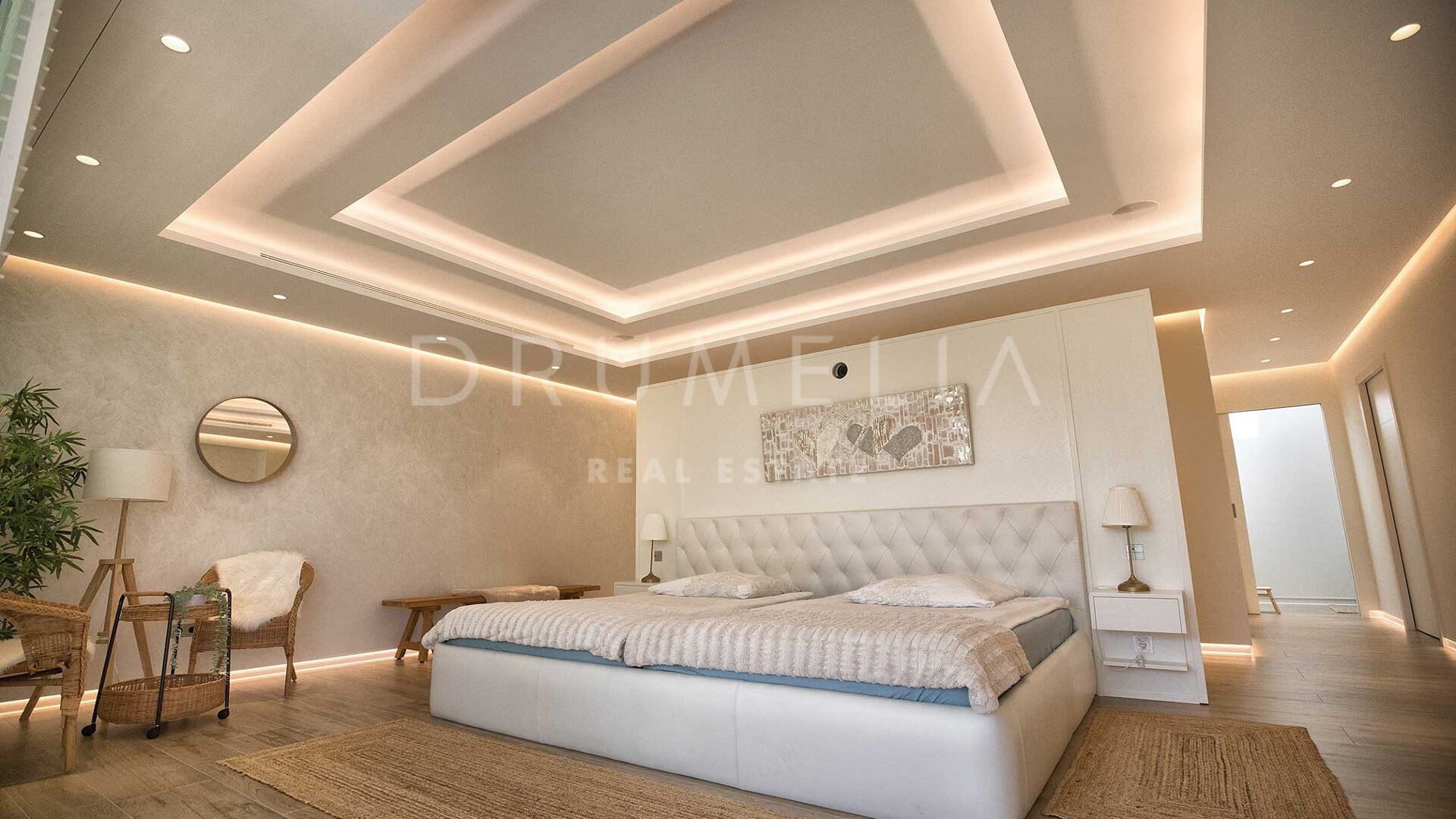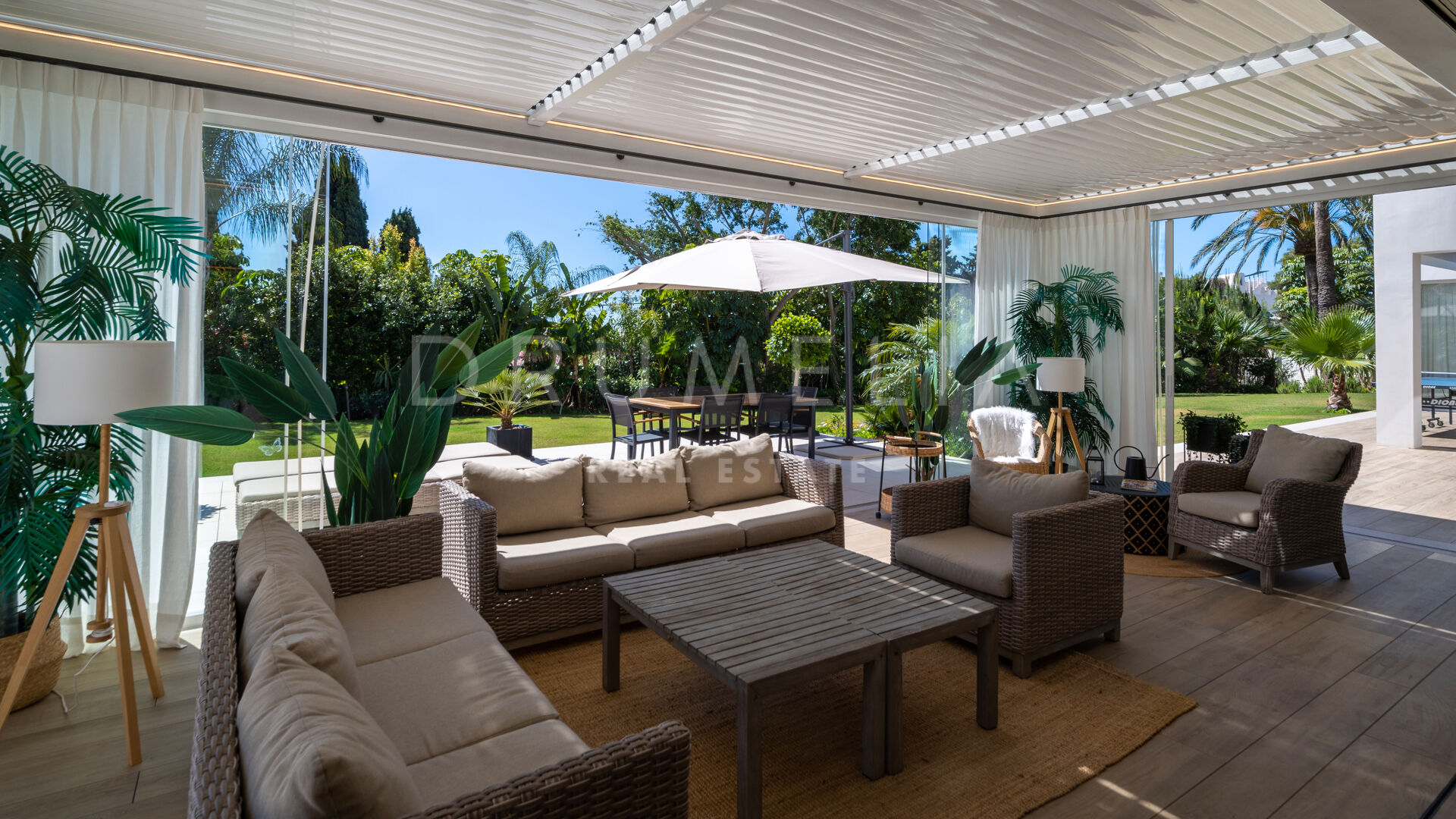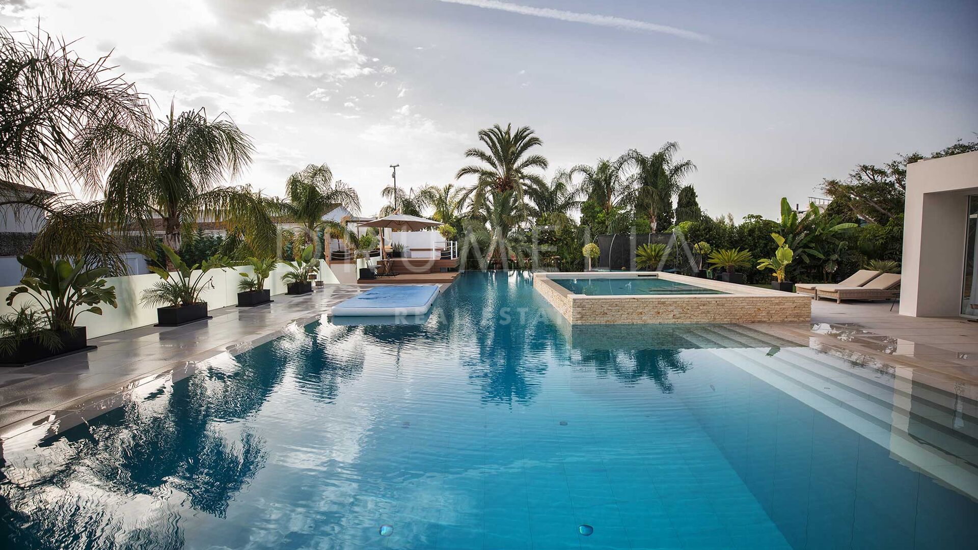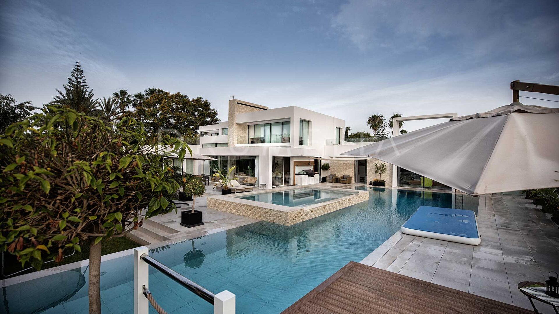 Située sur un grand terrain de 3.397 m² avec un beau jardin paysager, des pelouses vertes, un court de tennis/paddle et une imposante piscine privée, la grande villa de style contemporain de 1.757 m² bénéficie d’un design et de finitions simples mais élégantes, d’équipements de pointe et d’intérieurs exquis. Entourée de propriétés de luxe similaires et de la belle nature de la région d’Estepona, la maison dispose de vastes espaces de vie, de salle à manger et de réception menant à de remarquables terrasses où l’on peut admirer des vues sereines sur le jardin et les montagnes.