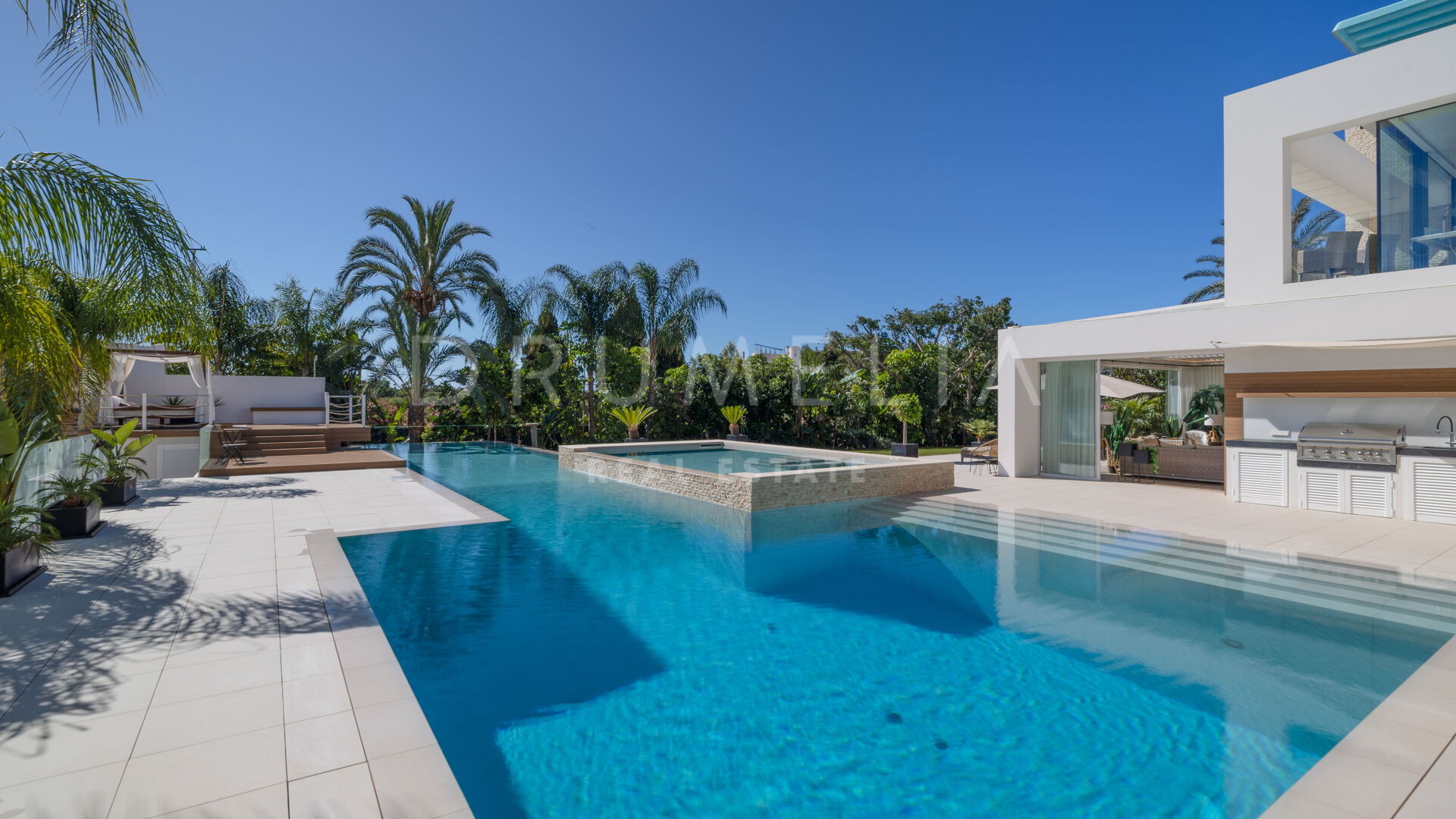 Cette nouvelle et spectaculaire demeure moderne de 7 chambres à coucher, dotée de superbes équipements, est proposée à la vente à El Paraiso, sur le nouveau Golden Mile d’Estepona. L’emplacement est privilégié, à proximité de plusieurs terrains de golf, de plages de sable fin, d’écoles internationales, de restaurants et de bars, de supermarchés et de magasins, d’un centre équestre réputé et de tout ce dont on peut avoir besoin pour un style de vie des plus exclusifs. Quelques minutes suffisent pour se rendre à San Pedro, au légendaire Puerto Banus, à la vallée du golf de Nueva Andalucia, au centre d’Estepona et à Marbella.