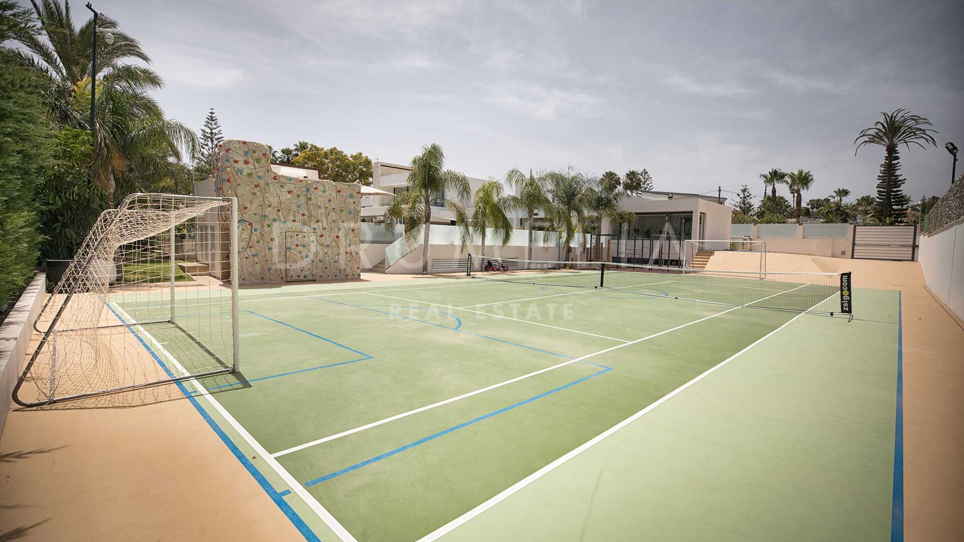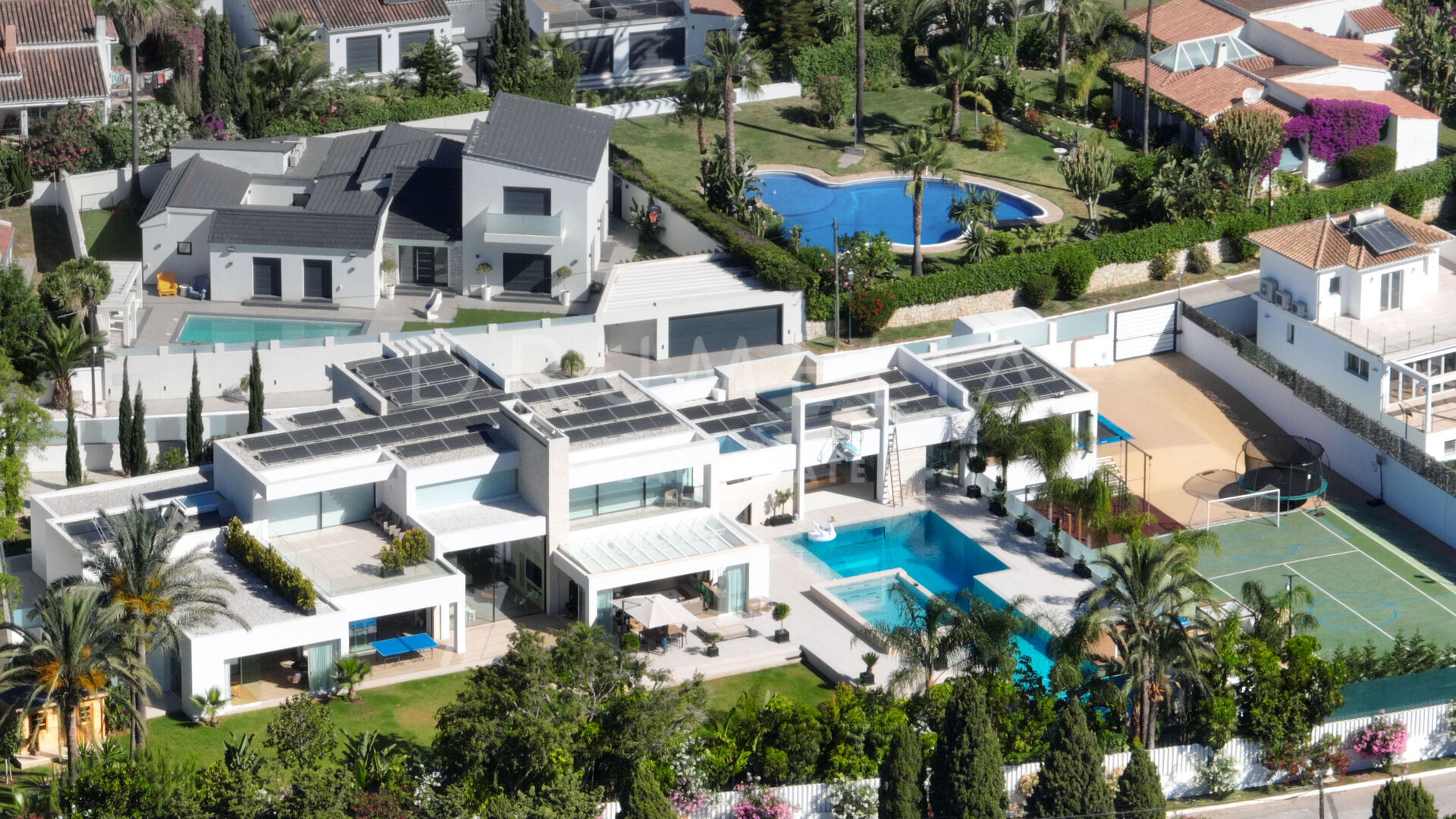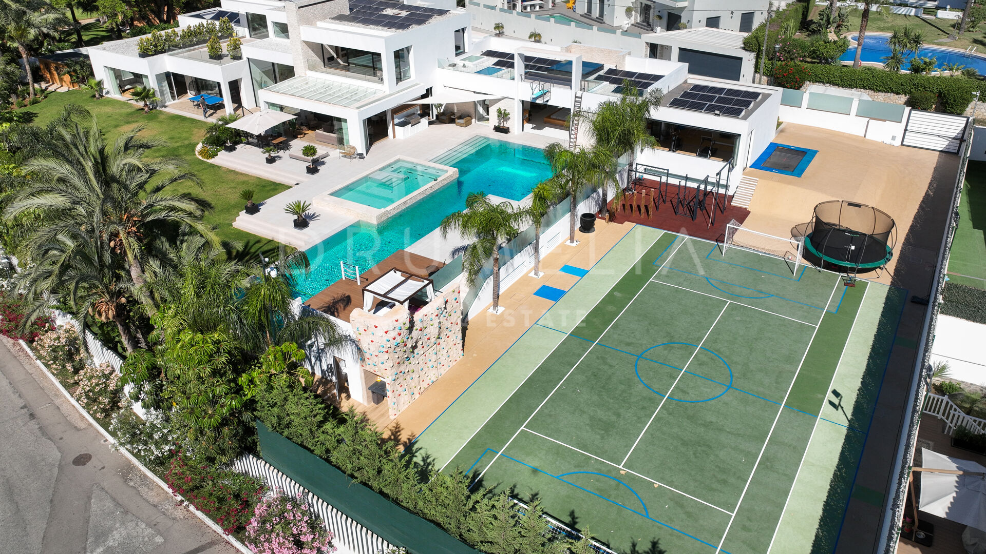 Les terrasses ensoleillées et couvertes et les espaces extérieurs exceptionnels offrent beaucoup d’espace pour se détendre, dîner en plein air, prendre un bain de soleil, faire un barbecue et jouer au tennis. Cette propriété extraordinaire dispose également d’une piscine de 25 m de long et de 4 m de profondeur, d’une piscine à débordement avec jacuzzi et d’une nage à contre-courant, offrant une expérience de plein air rafraîchissante et luxueuse. Le terrain de sport de haute qualité, le trampoline professionnel, la maison en bois, le barbecue à gaz et l’espace de détente avec un lit balinais viennent s’ajouter aux options de divertissement en plein air. Tout est réuni pour profiter du glorieux style de vie méditerranéen ! De plus, la propriété comprend une maison d’hôtes sur 2 niveaux avec un terrain de 500m2, comprenant une terrasse privée avec une piscine, 2 chambres avec dressing et salle de bains, un fantastique salon avec une cuisine, et un garage. Idéale pour vos invités ou comme logement de fonction.