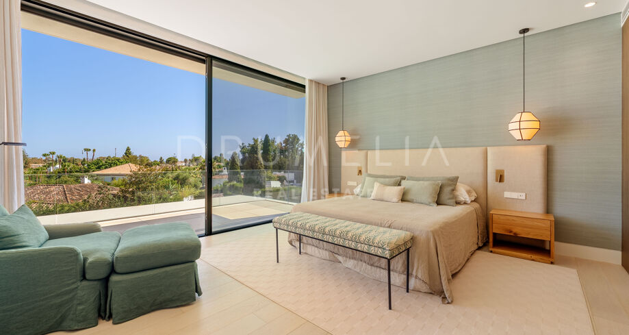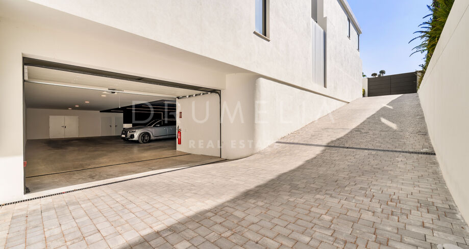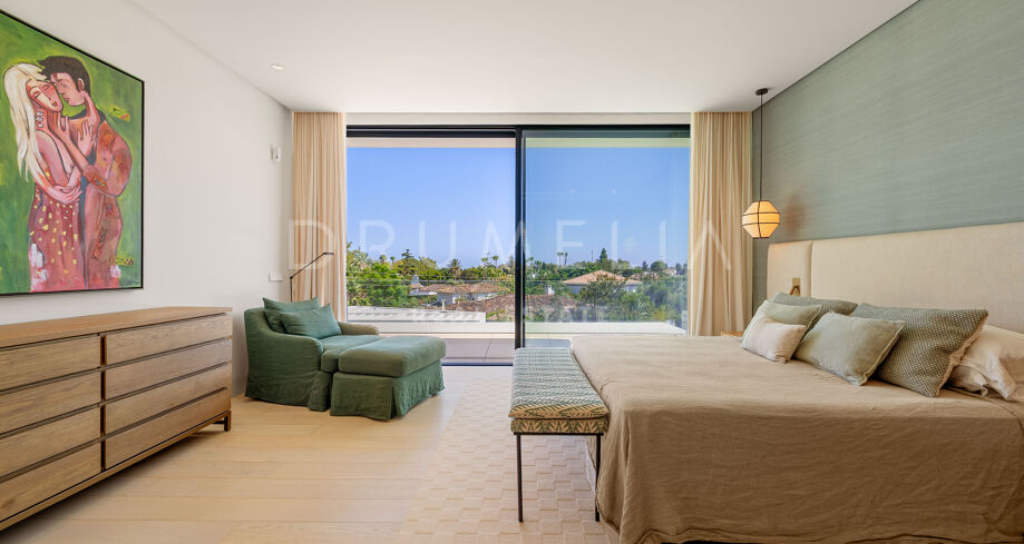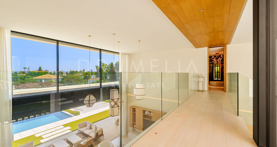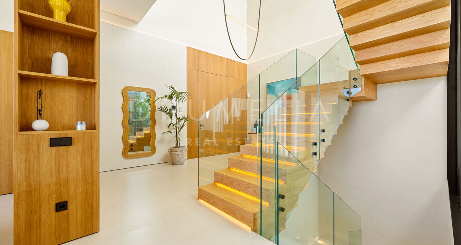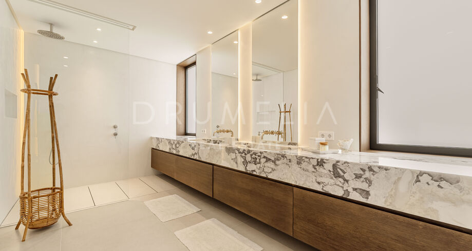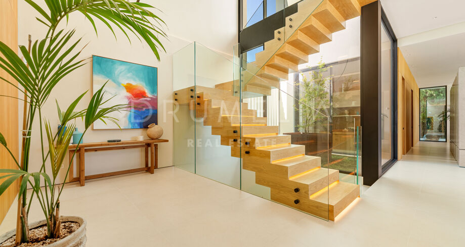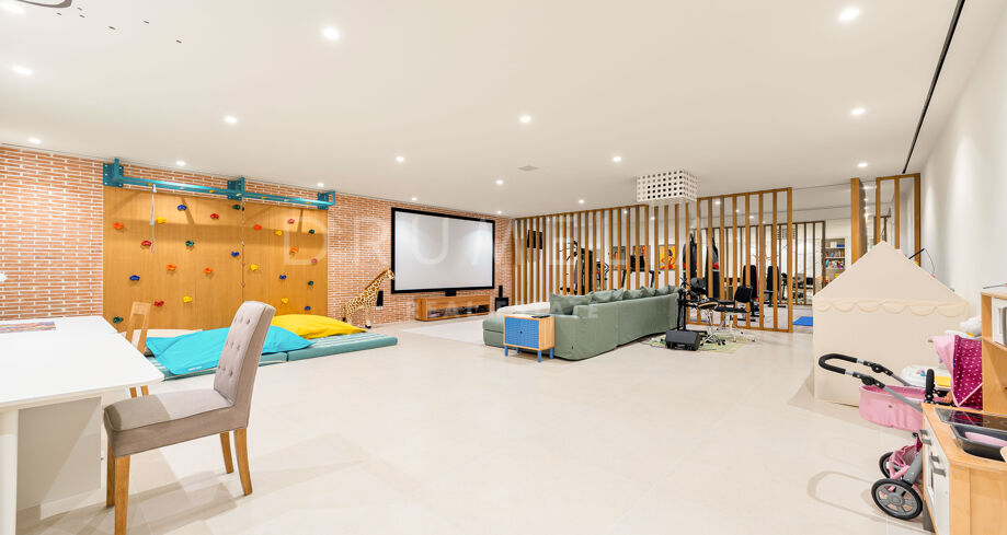 La zone nuit comprend six chambres, dont une suite parentale avec dressing et salle de bain privative. Un bureau indépendant et un étage dédié aux loisirs avec salle de sport, salle de cinéma et espaces de détente offrent polyvalence et fonctionnalité. À l’extérieur, la propriété dispose de jardins privés, d’une piscine, de terrasses ensoleillées et ombragées, ainsi que de systèmes intégrés de climatisation et d’éclairage. Cette propriété représente une combinaison parfaite de design, de confort et d’emplacement privilégié – idéale pour ceux qui recherchent une maison de luxe à Marbella.