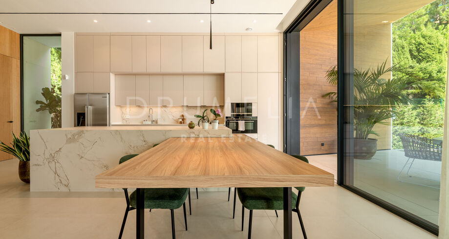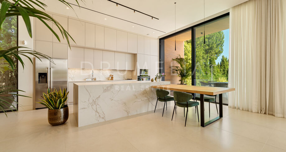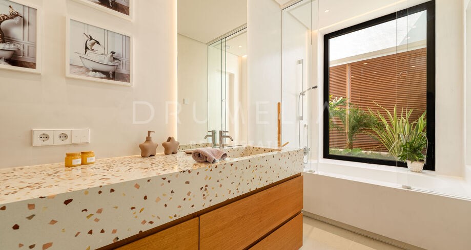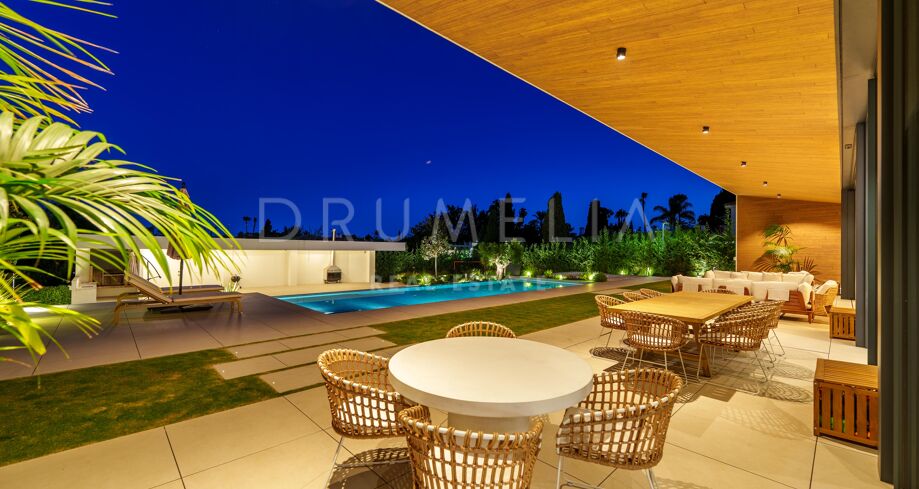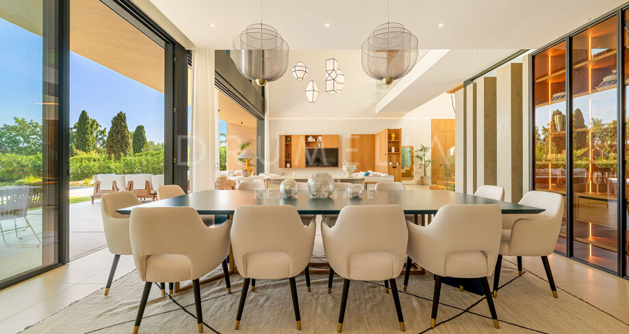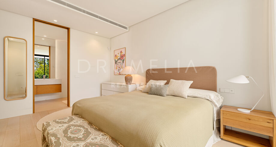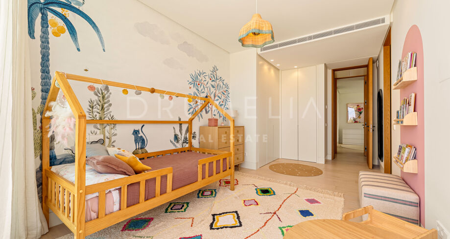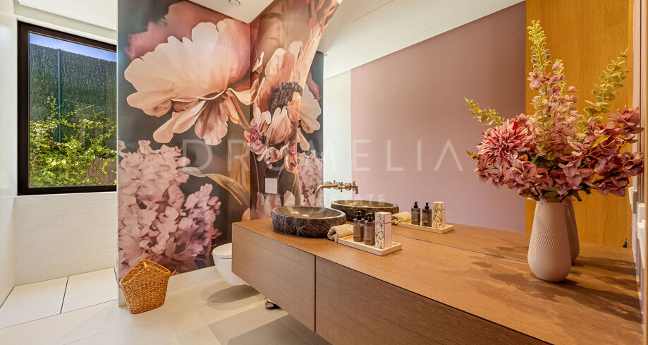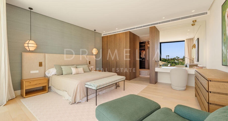 La zone nuit comprend six chambres, dont une suite parentale avec dressing et salle de bain privative. Un bureau indépendant et un étage dédié aux loisirs avec salle de sport, salle de cinéma et espaces de détente offrent polyvalence et fonctionnalité. À l’extérieur, la propriété dispose de jardins privés, d’une piscine, de terrasses ensoleillées et ombragées, ainsi que de systèmes intégrés de climatisation et d’éclairage. Cette propriété représente une combinaison parfaite de design, de confort et d’emplacement privilégié – idéale pour ceux qui recherchent une maison de luxe à Marbella.