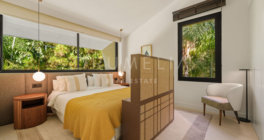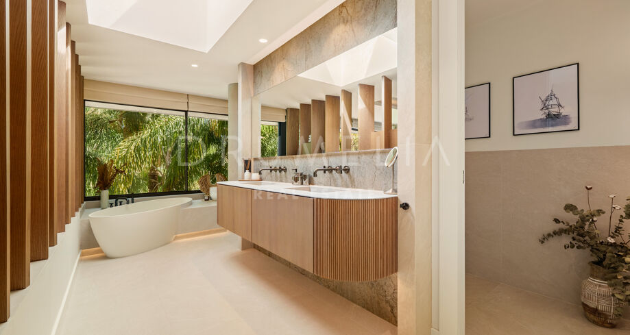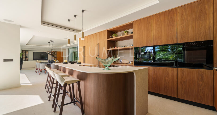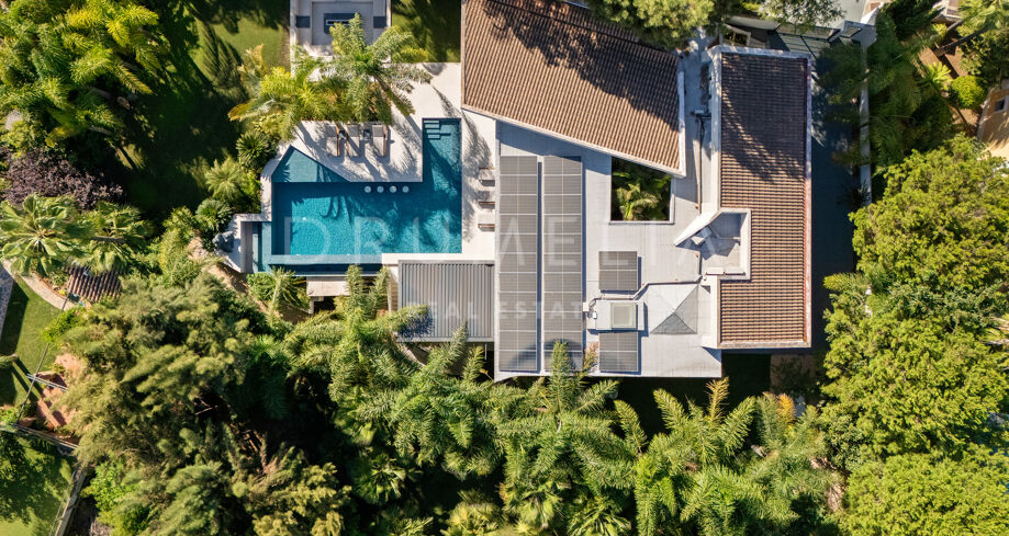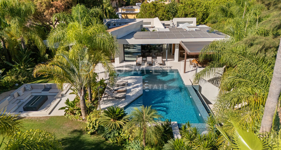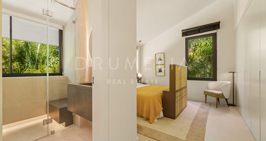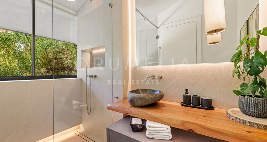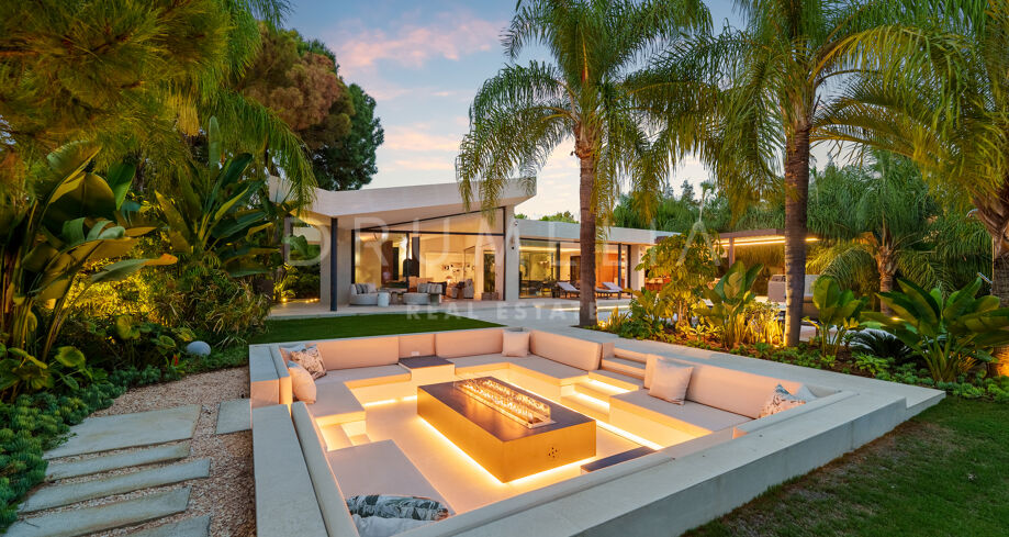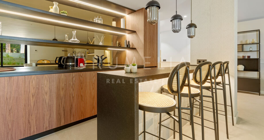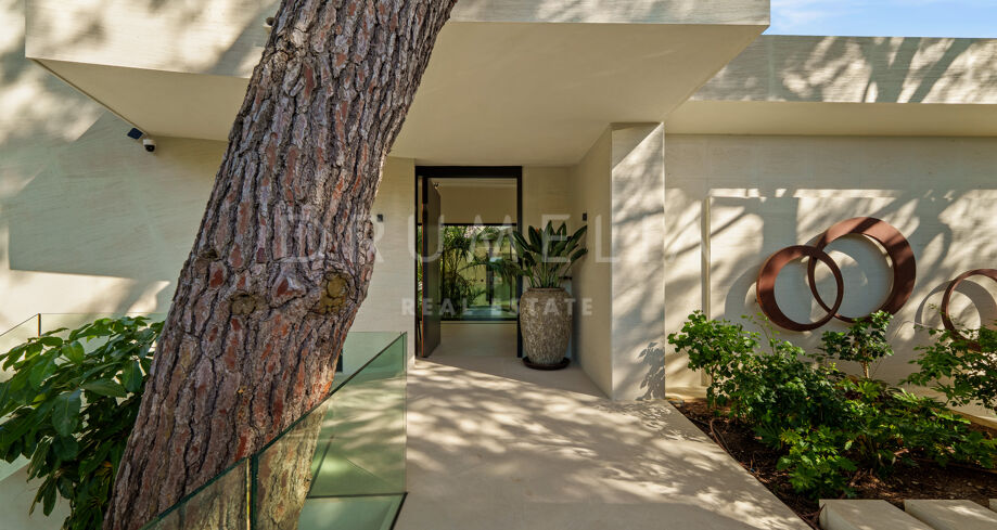 Située dans la prestigieuse communauté fermée d’Hacienda Las Chapas, cette villa de cinq chambres récemment rénovée offre un équilibre parfait entre intimité, confort et design moderne. Située sur un vaste terrain de 1 562 m² avec de magnifiques jardins paysagers, la villa s’étend sur 717 m² d’espace de vie lumineux et aéré. La cuisine ouverte se connecte parfaitement avec la salle à manger et le salon, avec des finitions contemporaines et des appareils haut de gamme. De grandes baies vitrées inondent les intérieurs de lumière naturelle et s’ouvrent sur plusieurs terrasses, créant une transition harmonieuse entre les espaces intérieurs et extérieurs.