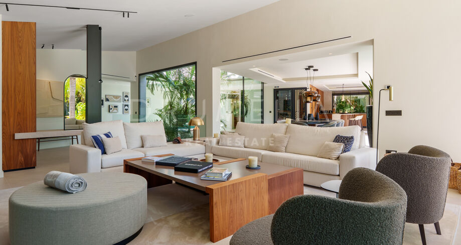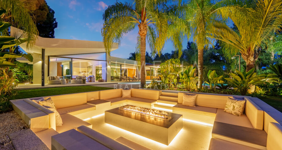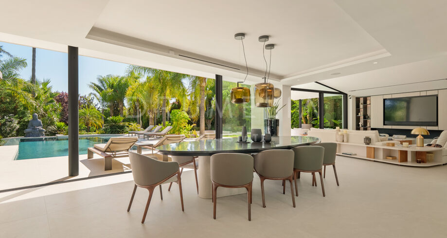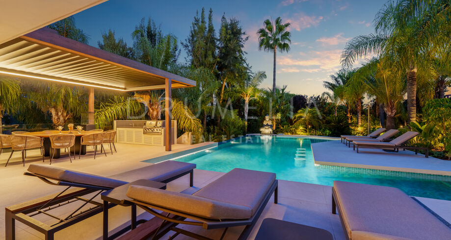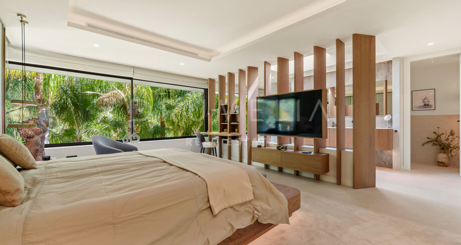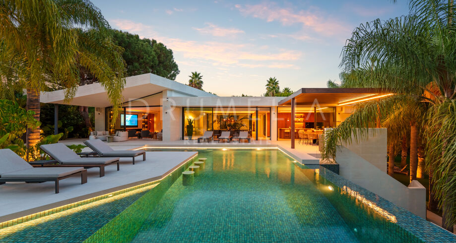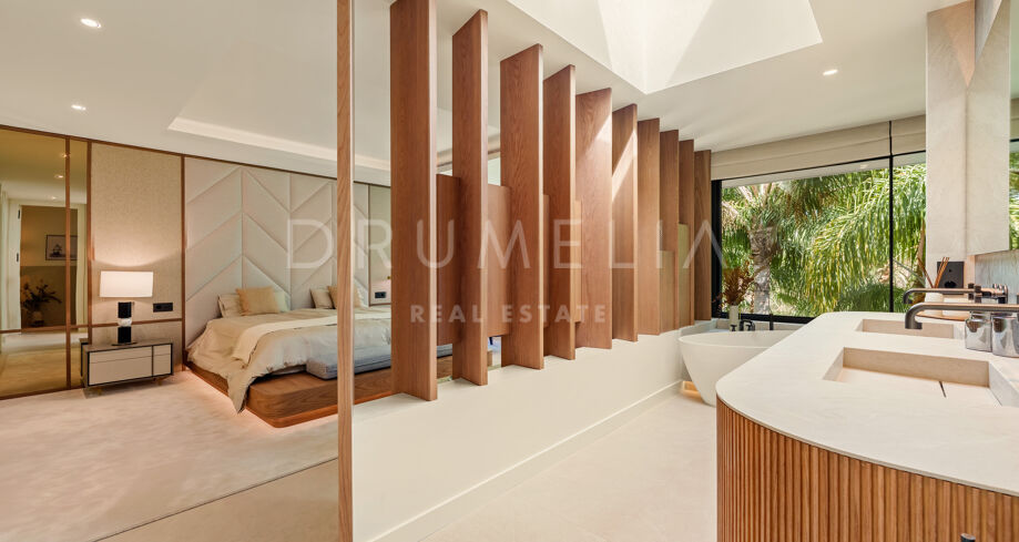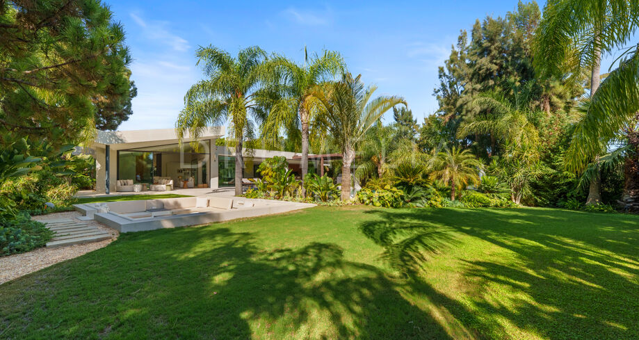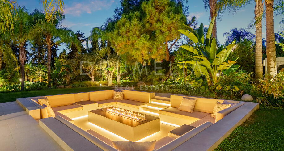 Située dans la prestigieuse communauté fermée d’Hacienda Las Chapas, cette villa de cinq chambres récemment rénovée offre un équilibre parfait entre intimité, confort et design moderne. Située sur un vaste terrain de 1 562 m² avec de magnifiques jardins paysagers, la villa s’étend sur 717 m² d’espace de vie lumineux et aéré. La cuisine ouverte se connecte parfaitement avec la salle à manger et le salon, avec des finitions contemporaines et des appareils haut de gamme. De grandes baies vitrées inondent les intérieurs de lumière naturelle et s’ouvrent sur plusieurs terrasses, créant une transition harmonieuse entre les espaces intérieurs et extérieurs.