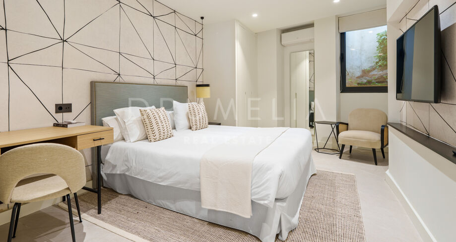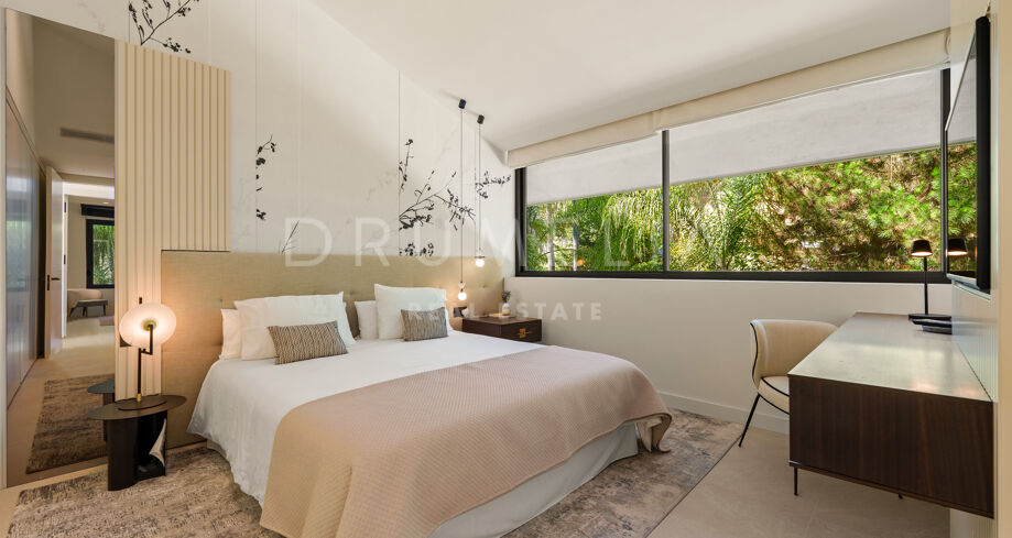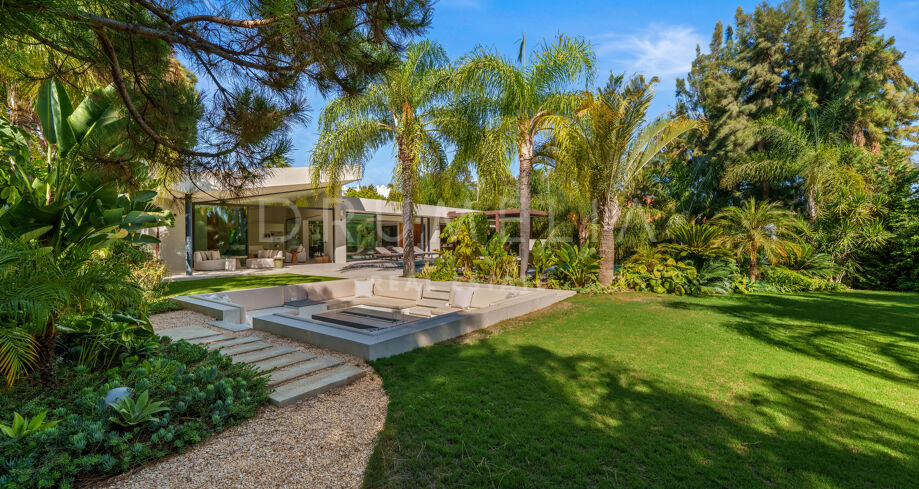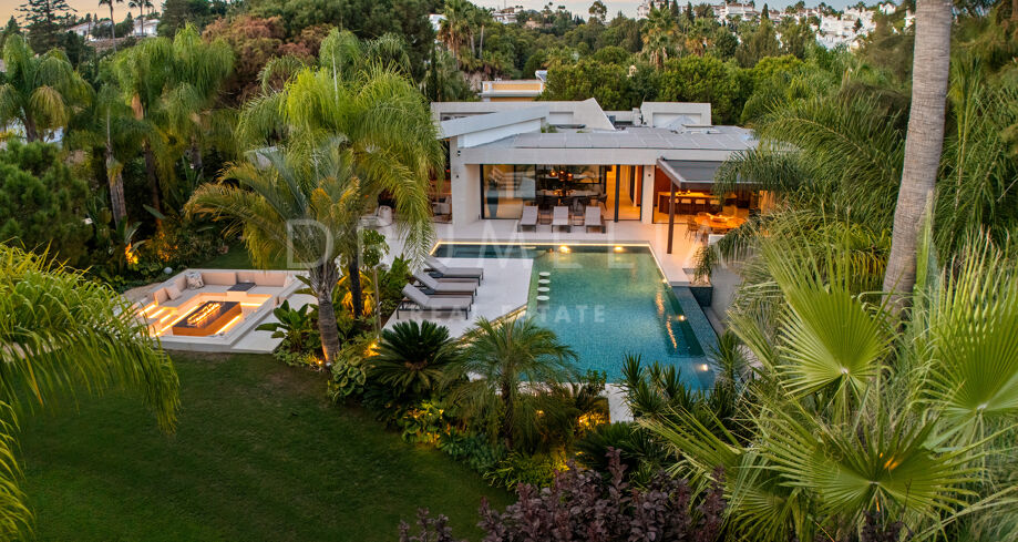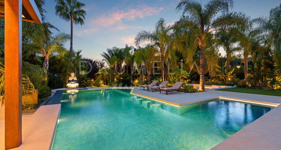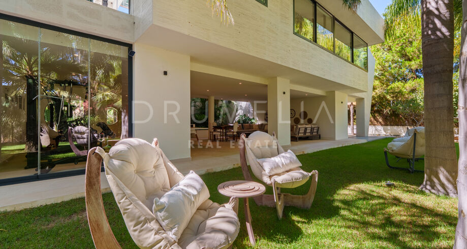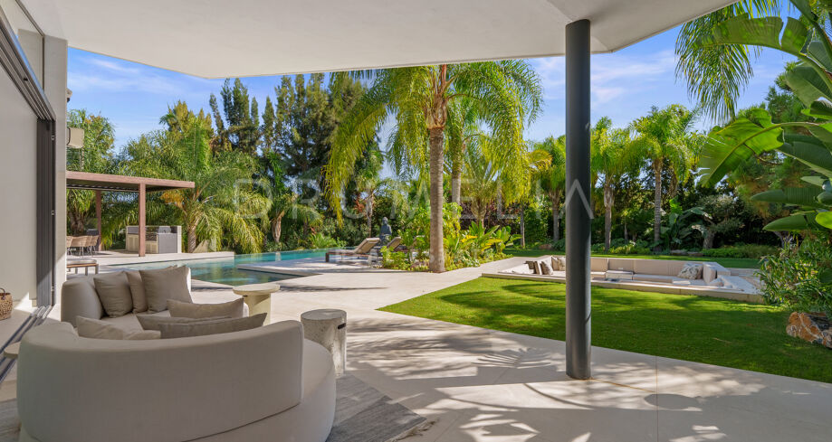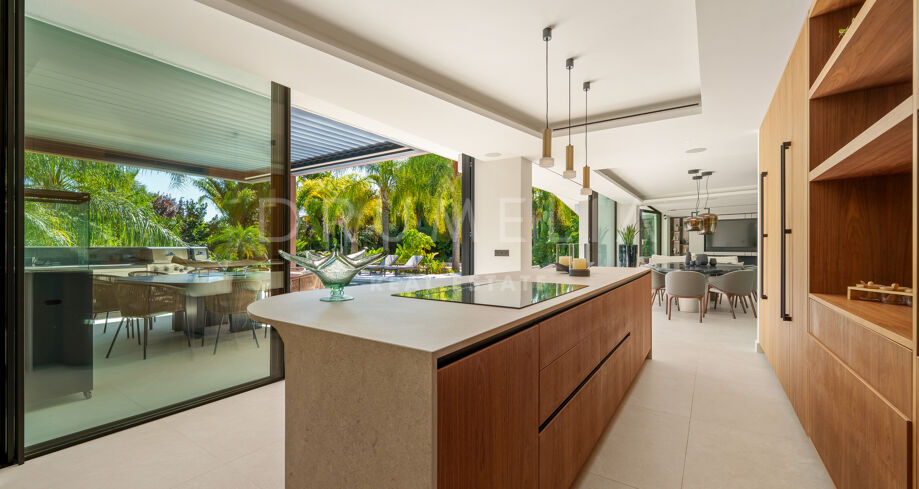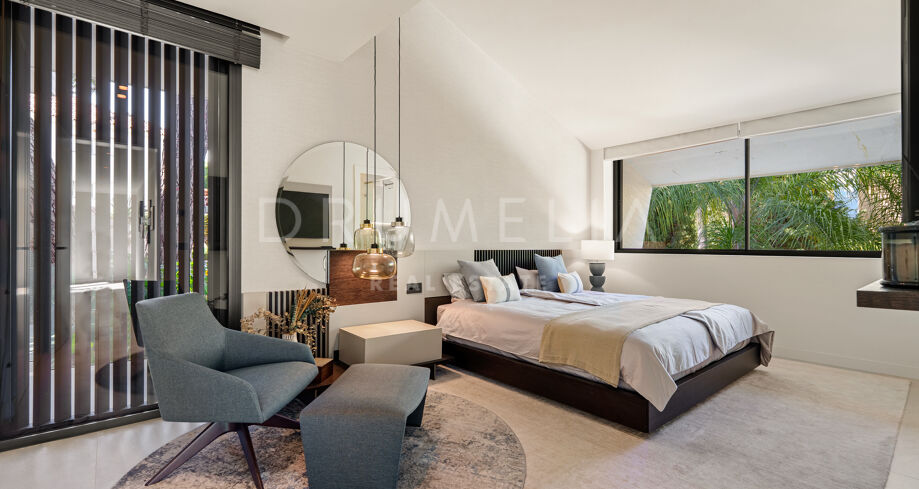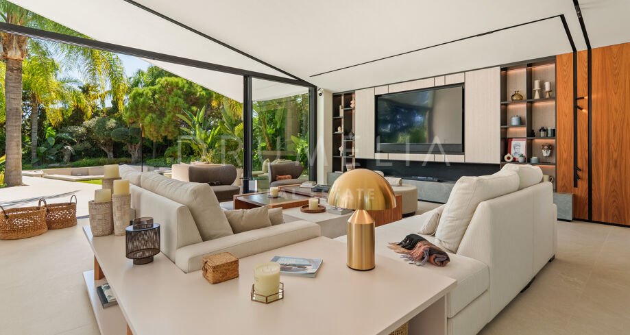 Située dans la prestigieuse communauté fermée d’Hacienda Las Chapas, cette villa de cinq chambres récemment rénovée offre un équilibre parfait entre intimité, confort et design moderne. Située sur un vaste terrain de 1 562 m² avec de magnifiques jardins paysagers, la villa s’étend sur 717 m² d’espace de vie lumineux et aéré. La cuisine ouverte se connecte parfaitement avec la salle à manger et le salon, avec des finitions contemporaines et des appareils haut de gamme. De grandes baies vitrées inondent les intérieurs de lumière naturelle et s’ouvrent sur plusieurs terrasses, créant une transition harmonieuse entre les espaces intérieurs et extérieurs.