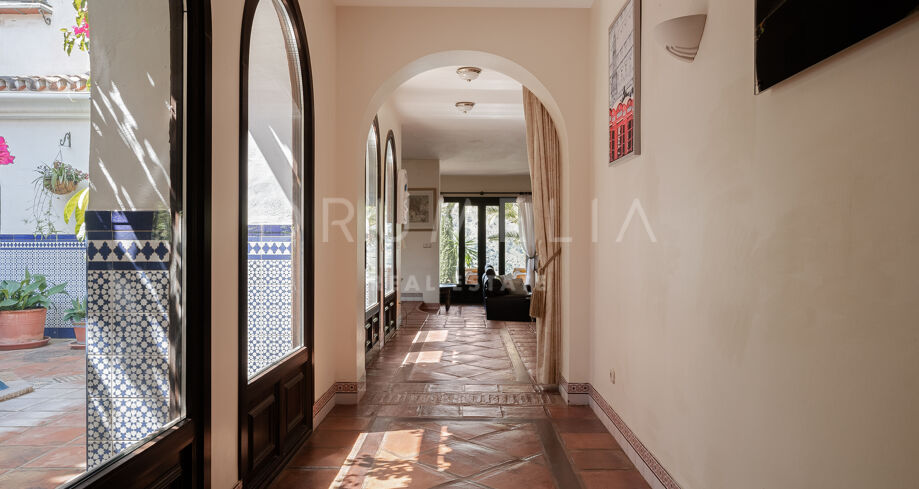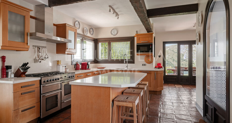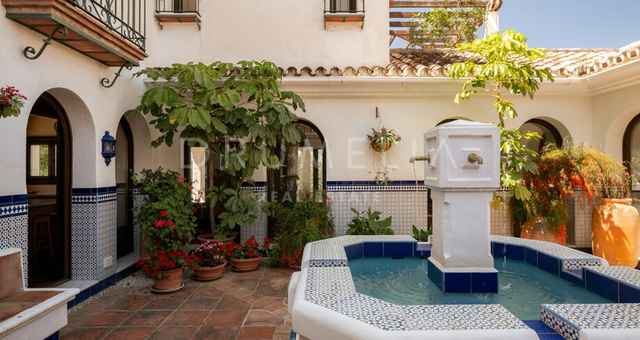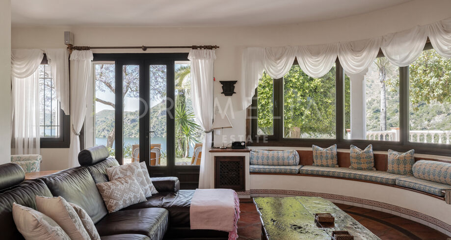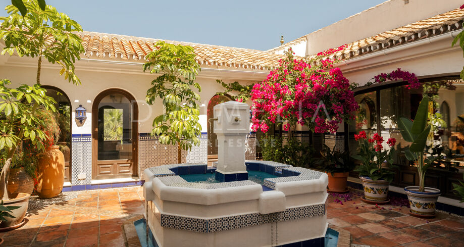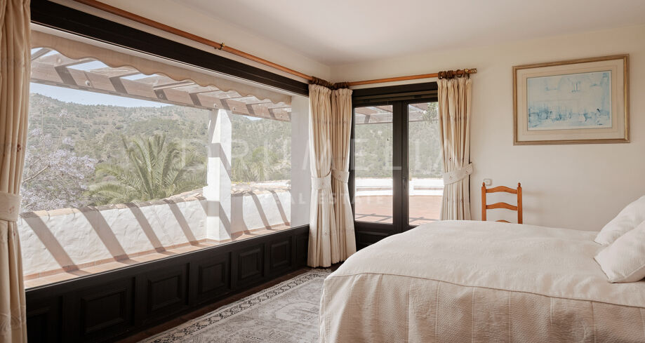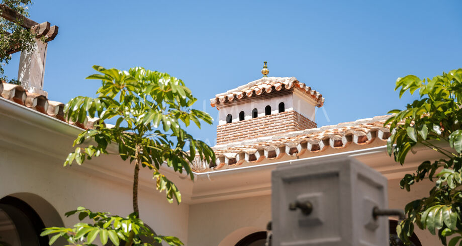 La propriété comprend six chambres spacieuses et une tour pouvant être aménagée en chambre supplémentaire, bureau ou espace créatif. Le salon et la salle à manger à aire ouverte se distinguent par leurs élégantes fenêtres cintrées qui baignent les intérieurs de lumière naturelle et s’ouvrent sur une vaste terrasse offrant une vue panoramique sur le lac et les montagnes environnantes. Au cœur de la maison, un patio andalou traditionnel avec fontaine et sculptures artistiques ajoute du caractère et de la sérénité.