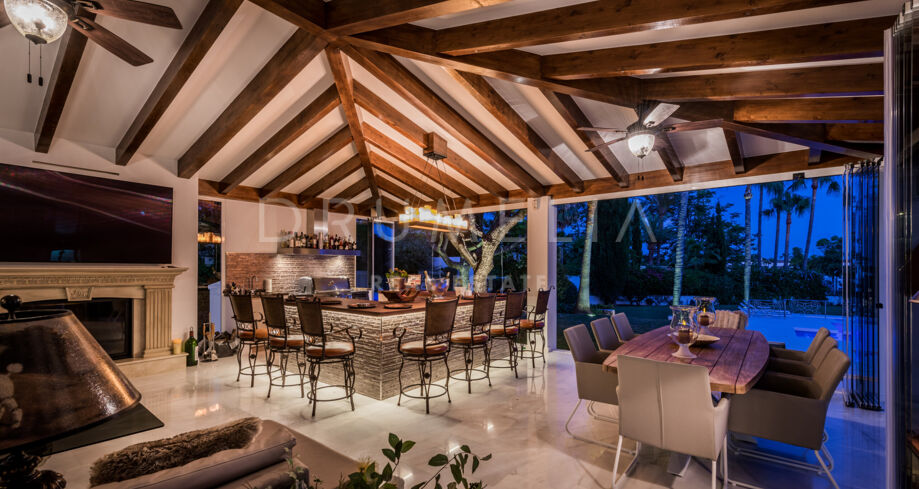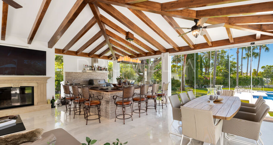 Le salon principal, décoré dans des tons doux, dispose d’un canapé courbé et d’une cheminée contemporaine qui apportent chaleur et raffinement. La salle à manger formelle et la cuisine moderne avec îlot central et coin petit-déjeuner s’ouvrent directement sur les terrasses. Un salon privé avec poutres apparentes, bar et cheminée en pierre se prolonge naturellement vers la piscine et le jardin, offrant un cadre parfait pour se détendre ou recevoir.