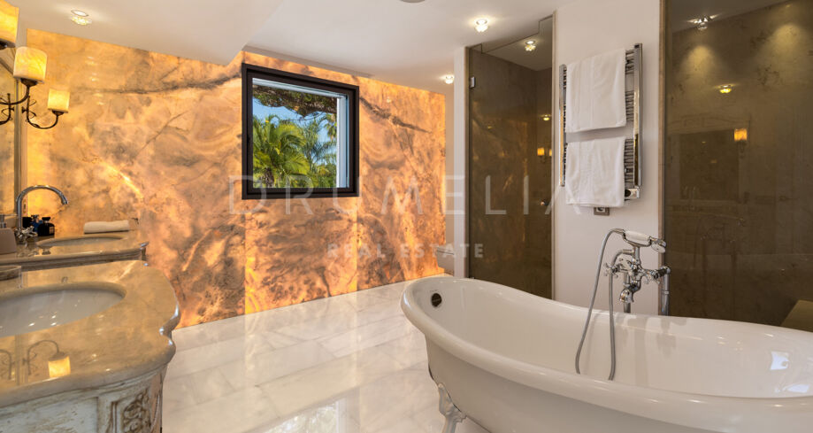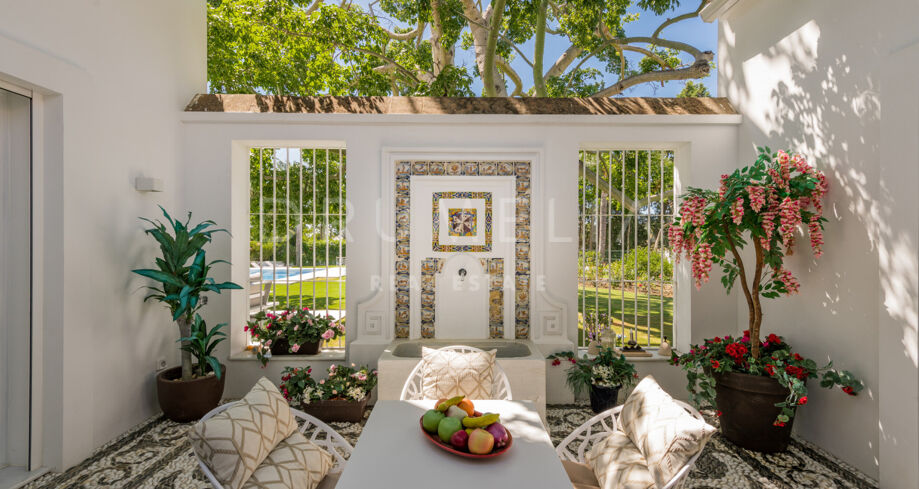 À l’extérieur, des jardins paysagers entourent une grande piscine avec cascade et plusieurs terrasses pour dîner ou se relaxer. Un patio andalou avec fontaine ajoute une touche d’authenticité. La villa bénéficie également d’un accès direct au parcours de golf Los Naranjos par des allées privées. Domotique, climatisation par zones et chauffage au sol assurent un confort absolu dans cette magnifique propriété à La Cerquilla, Nueva Andalucía.