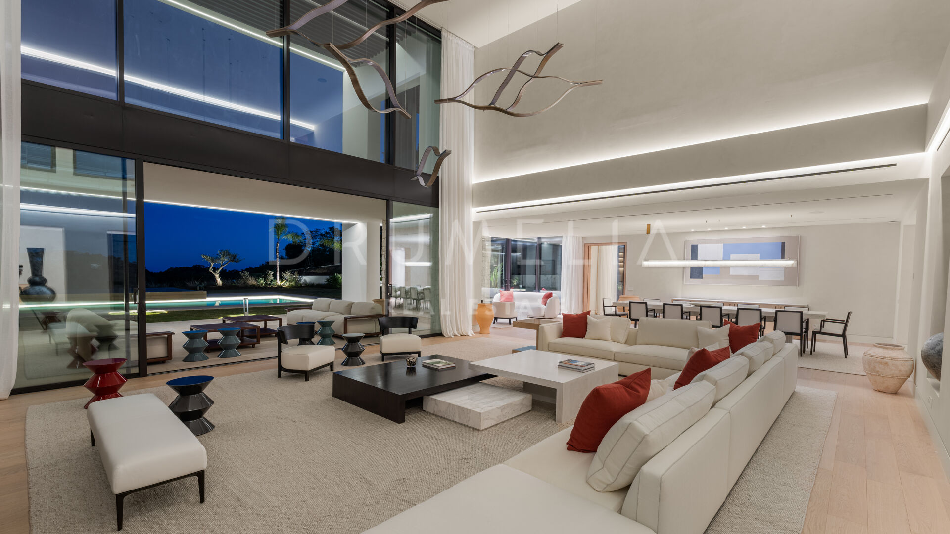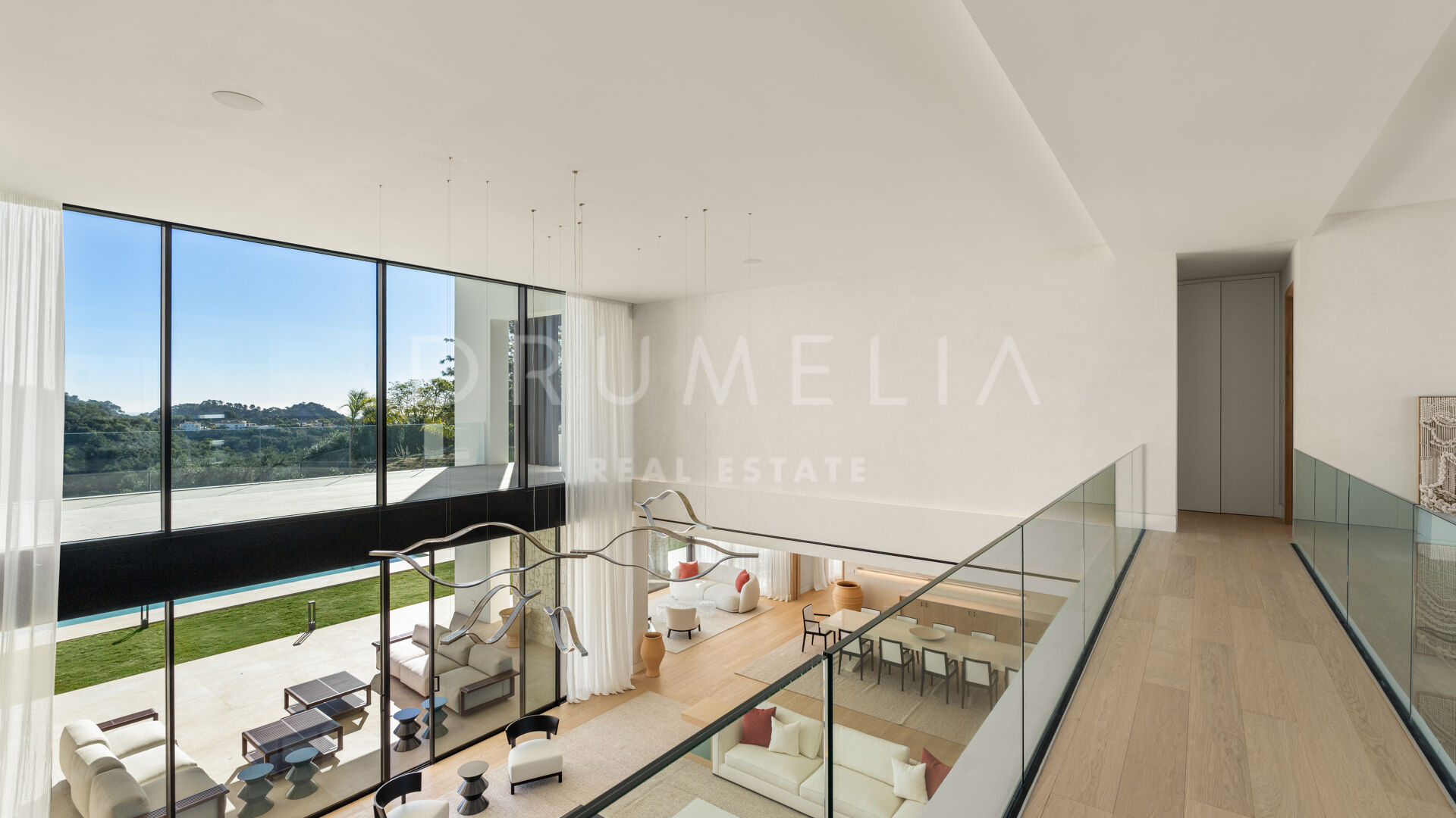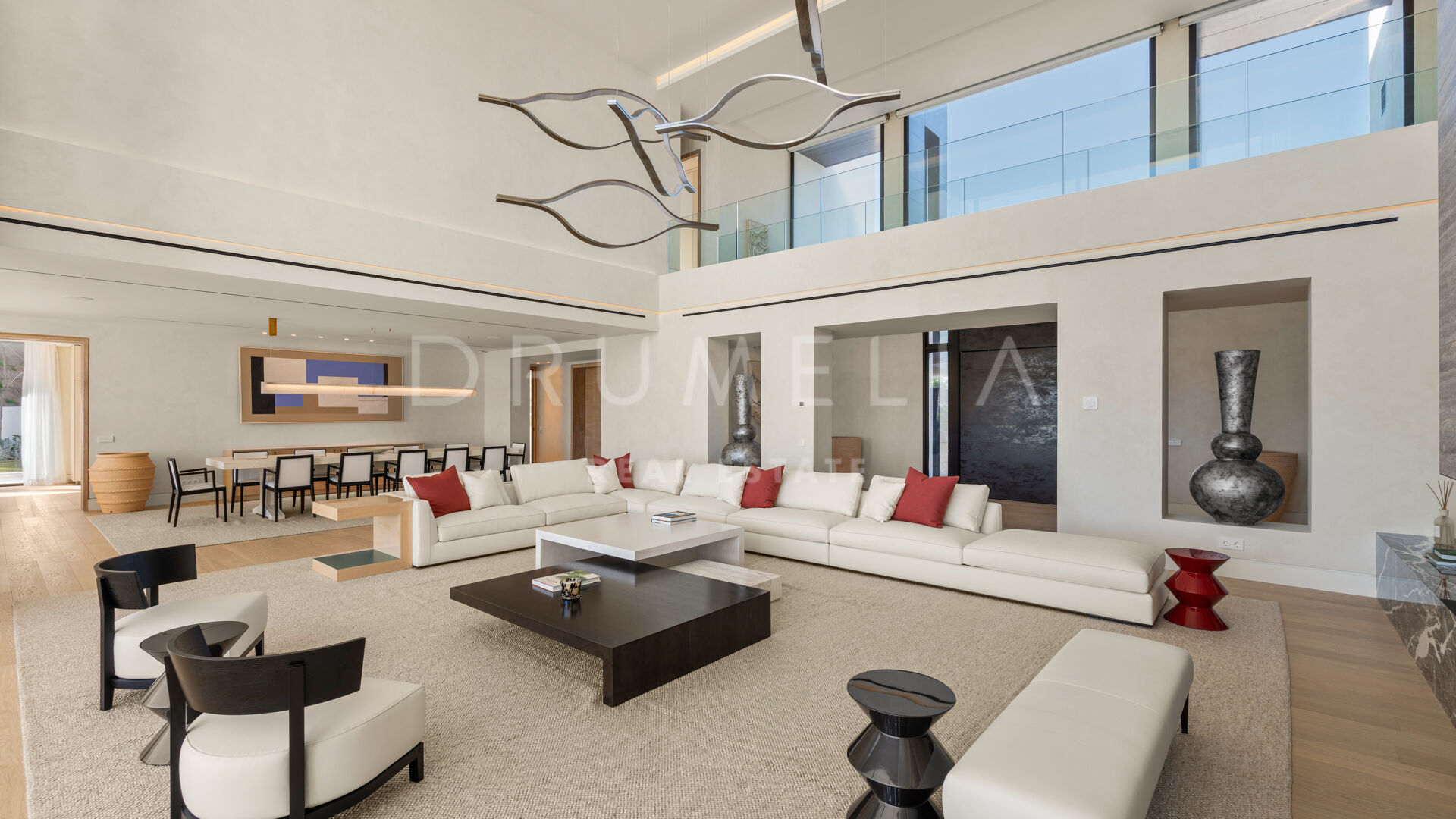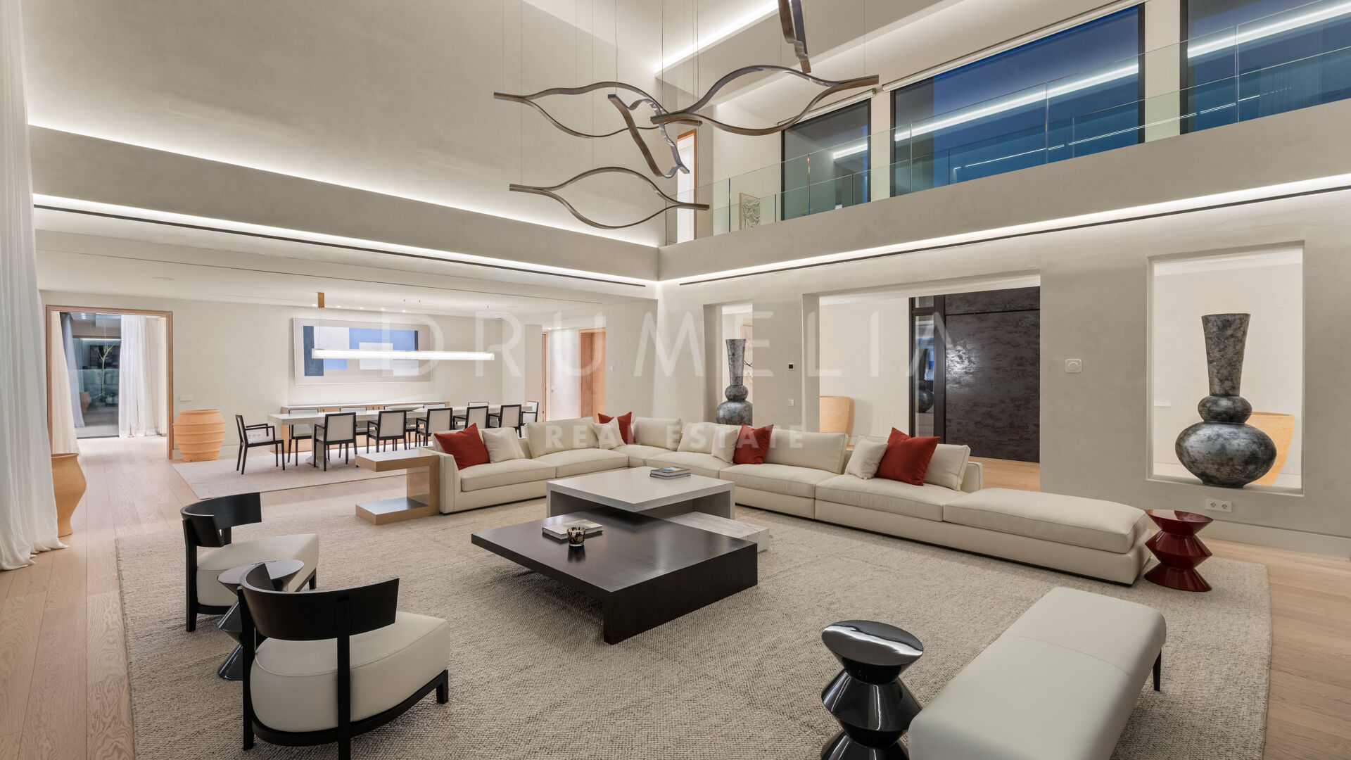 La maison comprend six chambres, sept salles de bains et des toilettes invités, réparties harmonieusement sur trois niveaux. Conçue pour le confort et le raffinement, elle dispose de plafonds à double hauteur dans les espaces de vie, le salon principal et les chambres étant en cours d’ameublement. Parmi ses nombreux équipements de luxe, on retrouve un spa privé avec sauna et hammam, une salle de sport, une salle de massage et un appartement pour invités au sous-sol. De vastes terrasses, des jardins paysagers et de grandes baies vitrées assurent une parfaite continuité entre intérieur et extérieur. Parmi ses nombreux atouts, la propriété comprend également une piscine chauffée et couverte, idéale pour en profiter tout au long de l’année.