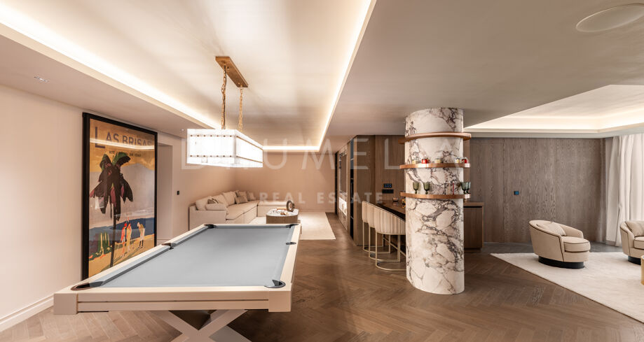 On y trouve notamment un garage spacieux équipé d’une plaque tournante, un luxueux espace spa avec sauna et hammam, une salle de sport intérieure ultramoderne et un home cinéma, le tout avec un accès direct au splendide jardin.