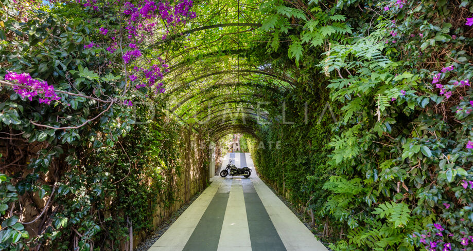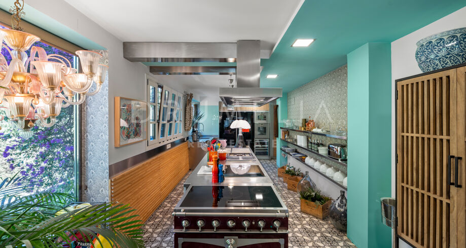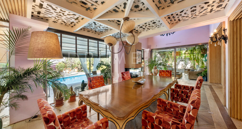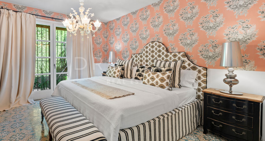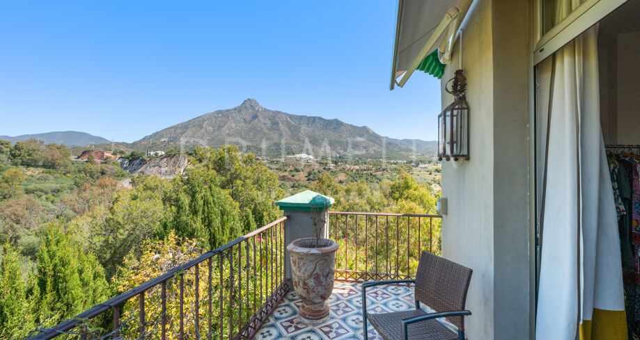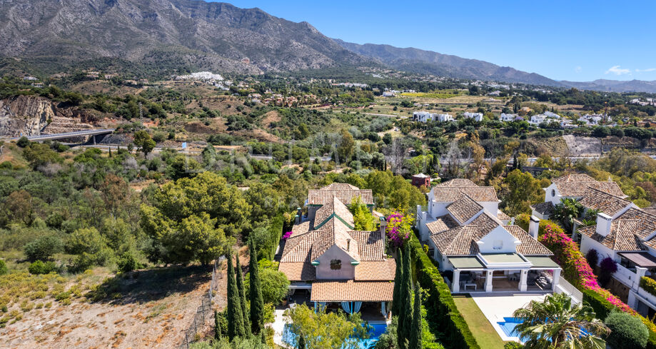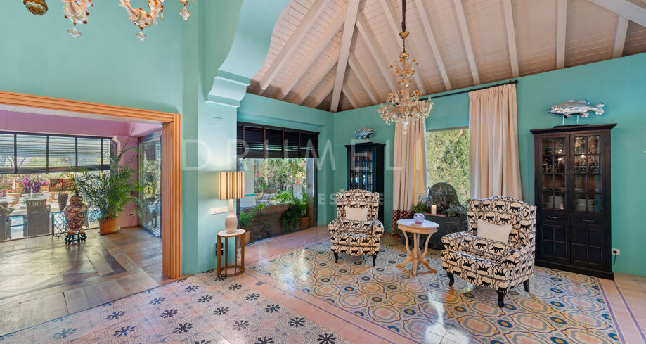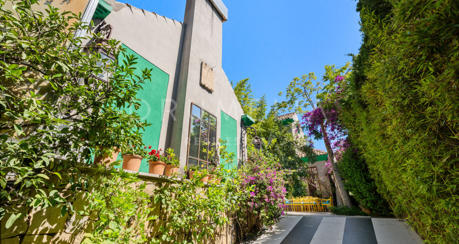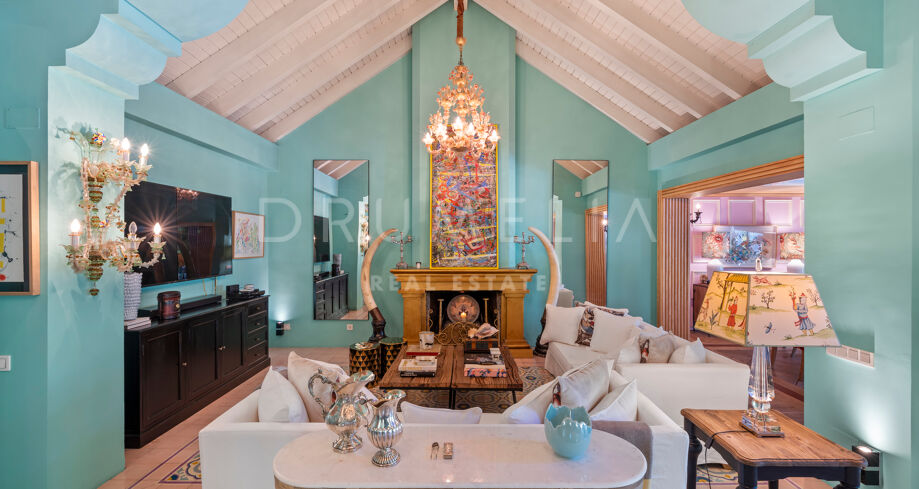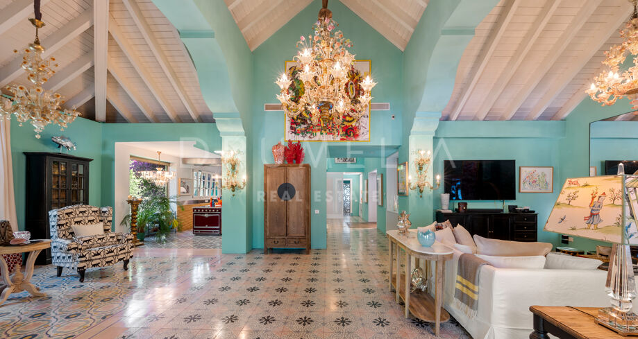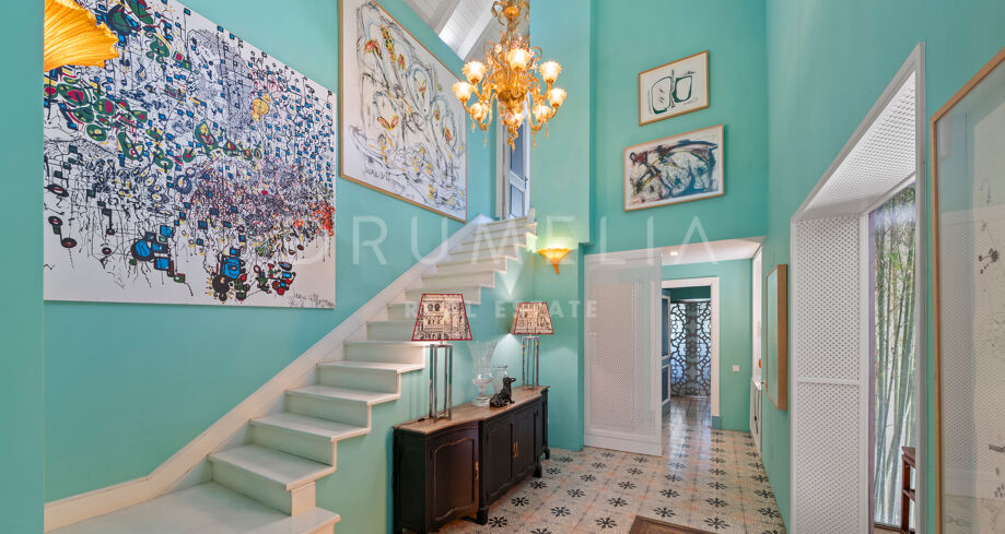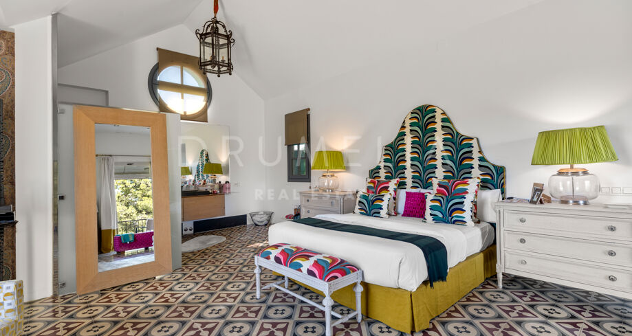 Cette maison méditerranéenne exceptionnelle à vendre sur le célèbre Golden Mile de Marbella a été conçue de manière experte pour maximiser tous les avantages de son superbe emplacement au sommet de la colline, avec le cadre parfait et la légendaire montagne La Concha en toile de fond. Située sur un terrain de 1 018 m², la villa de 586 m² orientée sud combine l’essence de l’architecture traditionnelle espagnole avec d’impressionnants éléments de design intérieur luxueux et le confort moderne de la maison, créant ainsi une ambiance très spéciale. Elle jouit d’une vue délicieuse sur les jardins subtropicaux luxuriants avec les jeux d’eau symétriques et les fontaines andalouses, les arbres matures, les pelouses vertes et les coins romantiques.