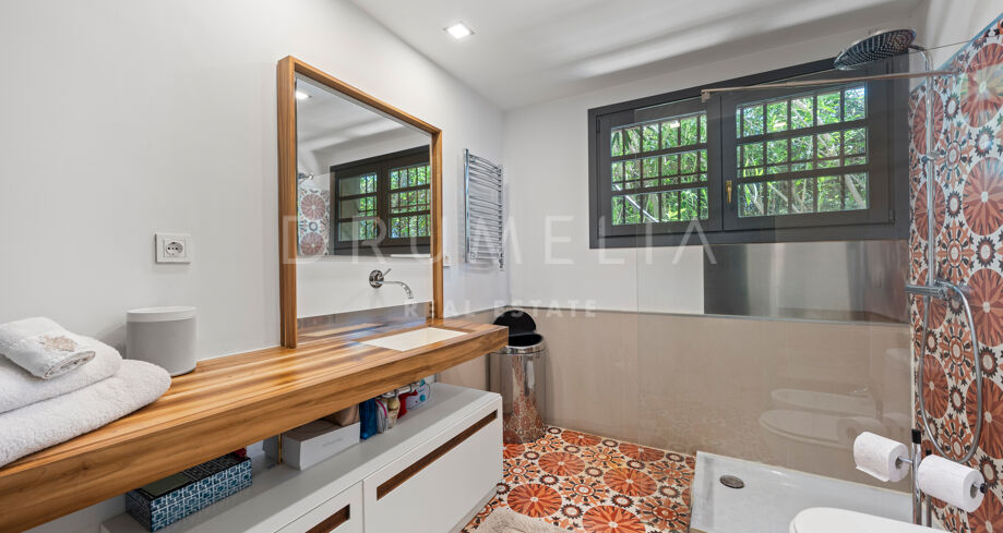 Un style de vie exceptionnel est garanti dans cette maison de luxe très privée. La palette de couleurs inspirée de la nature est pimentée de teintes vibrantes, de fabuleux murs d’accentuation et d’autres éléments architecturaux passionnants. Stylisée avec un grand souci du détail, la villa est lumineuse, colorée et a beaucoup de caractère. L’élégance royale et le chic ethnique sont au cœur de son design inhabituel. Cette propriété est proposée à la vente en excellent état, avec un garage pour 2 voitures, un solarium, un jacuzzi, la climatisation, le chauffage au sol, le double vitrage Quero, un système d’irrigation automatique, des stores électriques, des armoires encastrées, un système de sécurité Paradox haut de gamme à l’intérieur et à l’extérieur, etc.