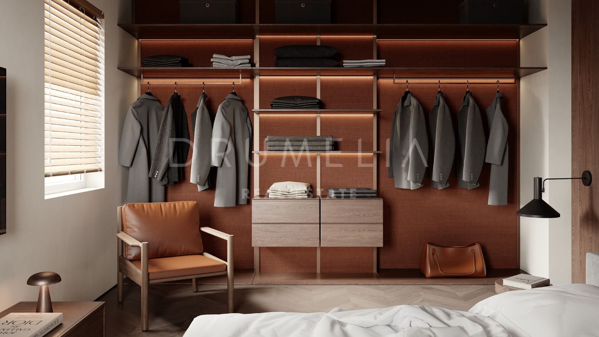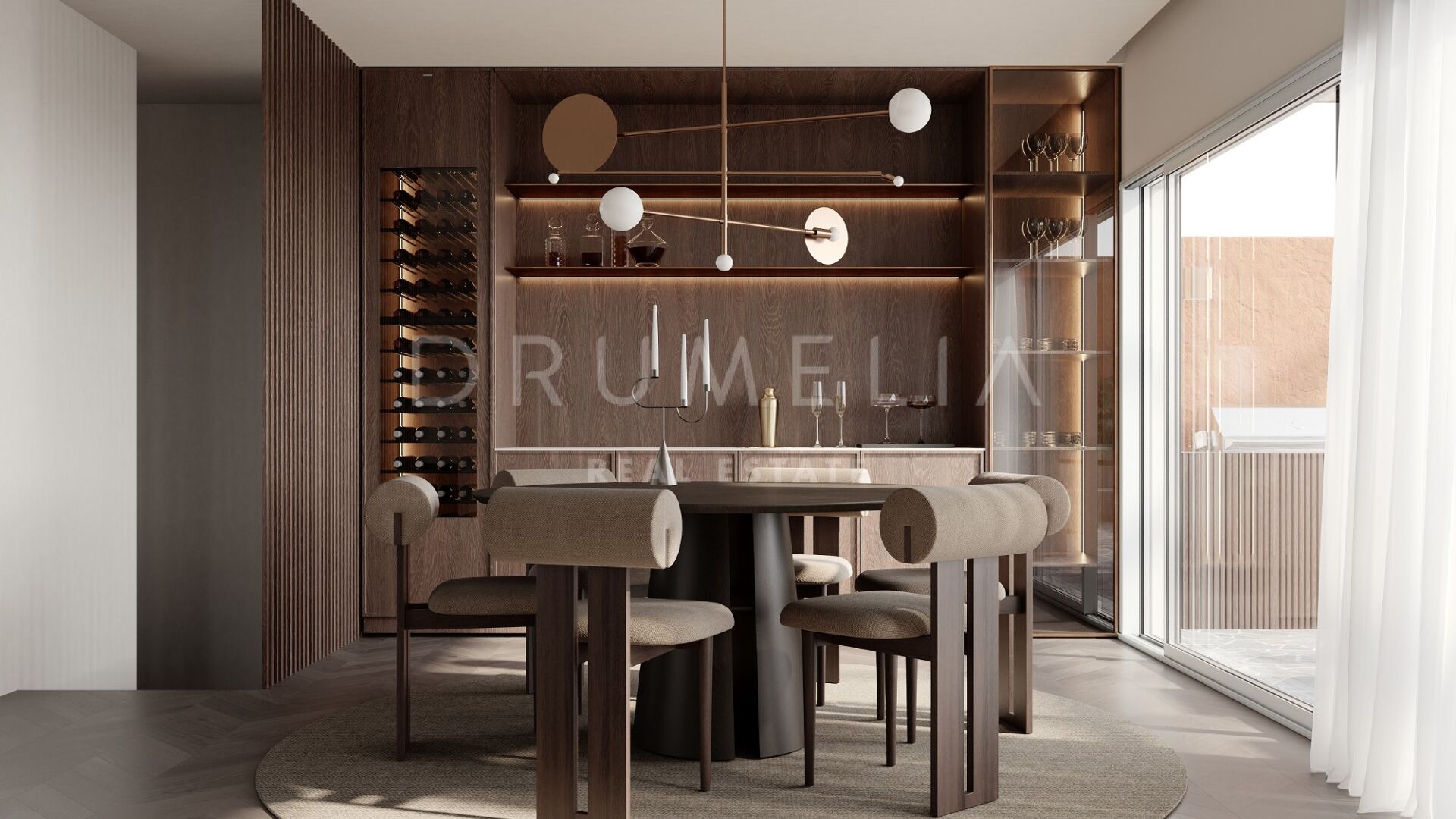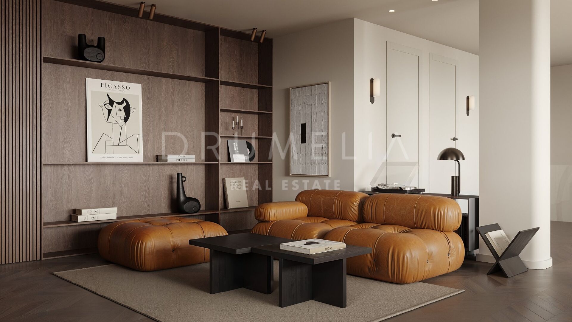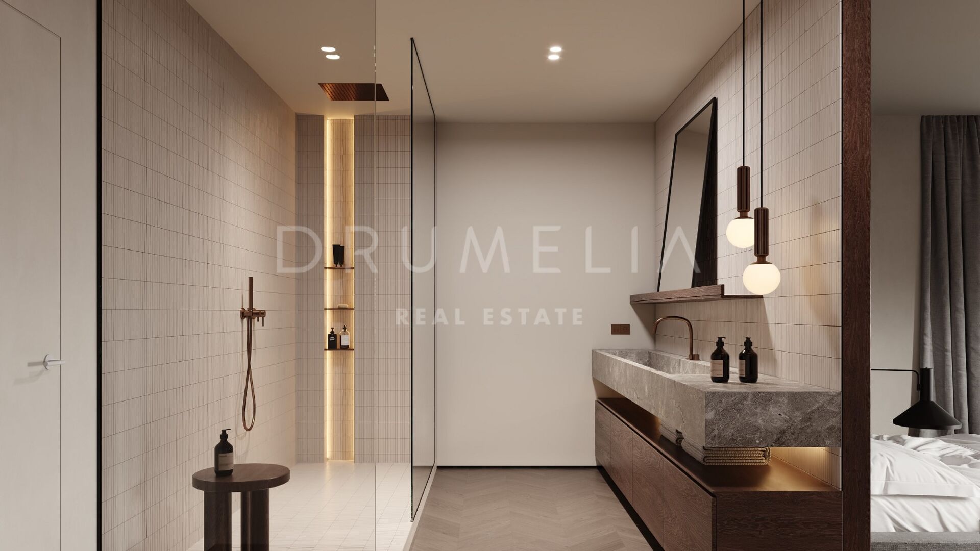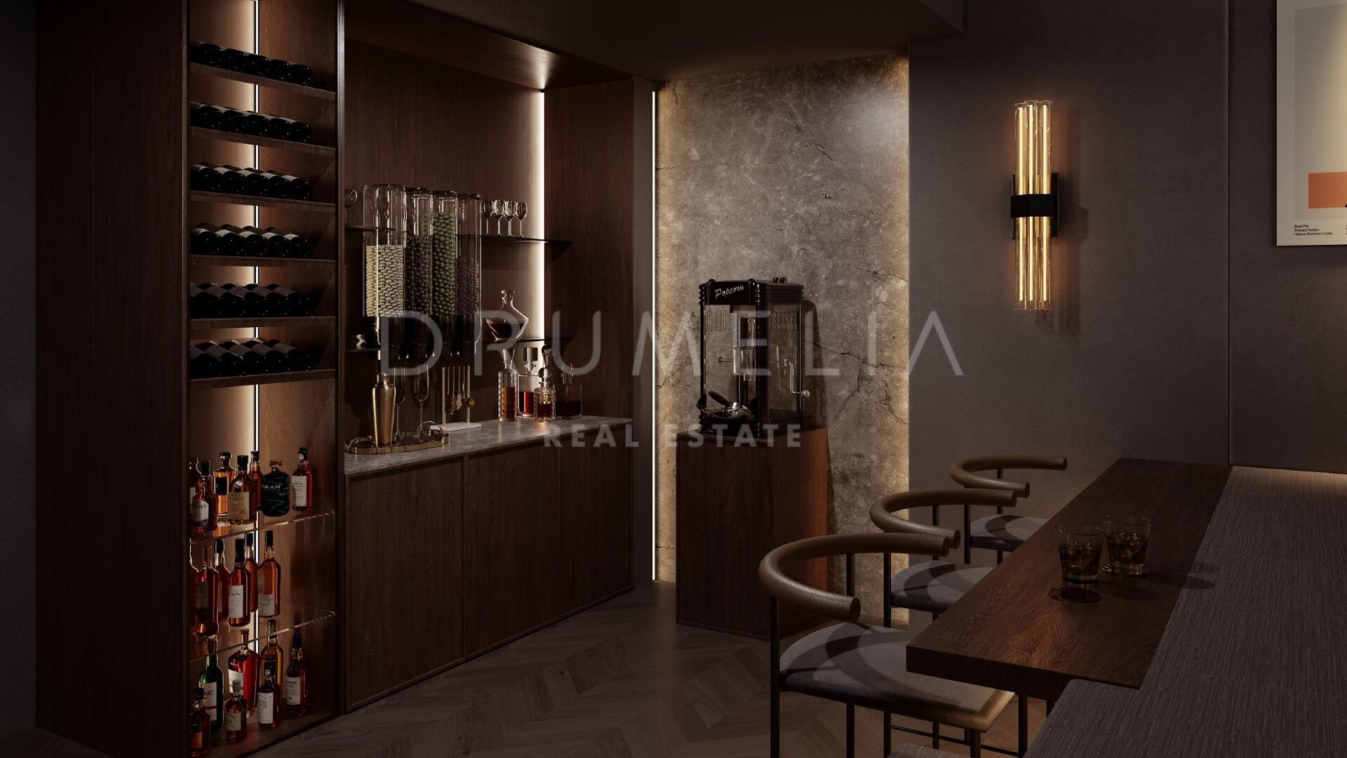 Les matériaux de haute qualité rehaussent l’espace, avec le charme riche du bois de chêne foncé, le parquet intemporel et les touches élégantes de vert olive et royal, complétées par des carreaux de petit format.
