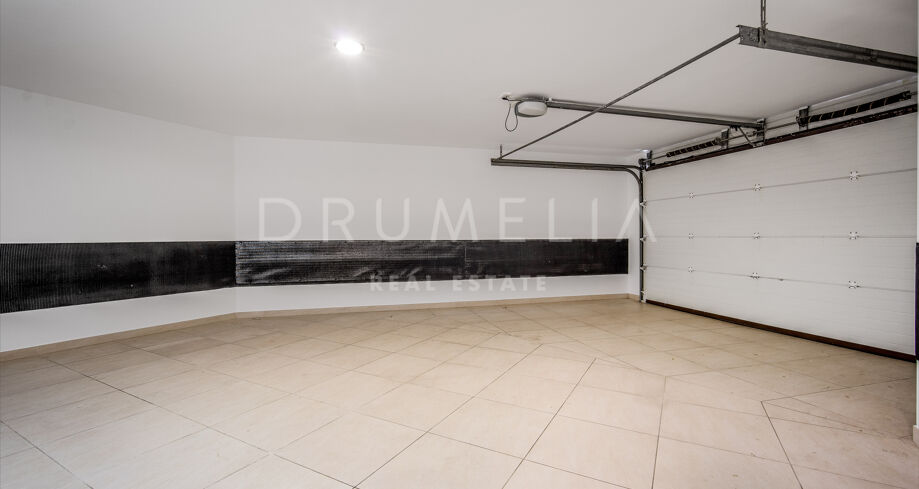 La maison s’étend sur trois niveaux et comprend un hall d’entrée lumineux, un salon ouvrant sur la terrasse et le jardin, une salle à manger et une cuisine entièrement équipée. Le rez-de-chaussée dispose également d’une chambre en suite et de toilettes invités. À l’étage supérieur se trouvent la suite parentale et une chambre d’amis, toutes deux avec accès à une grande terrasse offrant une vue partielle sur la mer. Le niveau inférieur abrite deux chambres supplémentaires, une salle de bain, une buanderie, une salle polyvalente et un accès direct au garage.