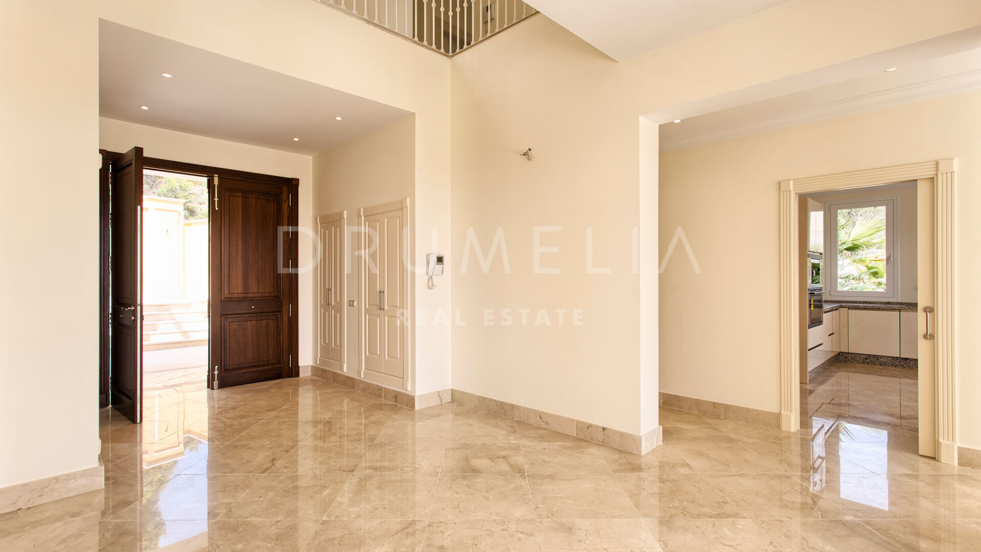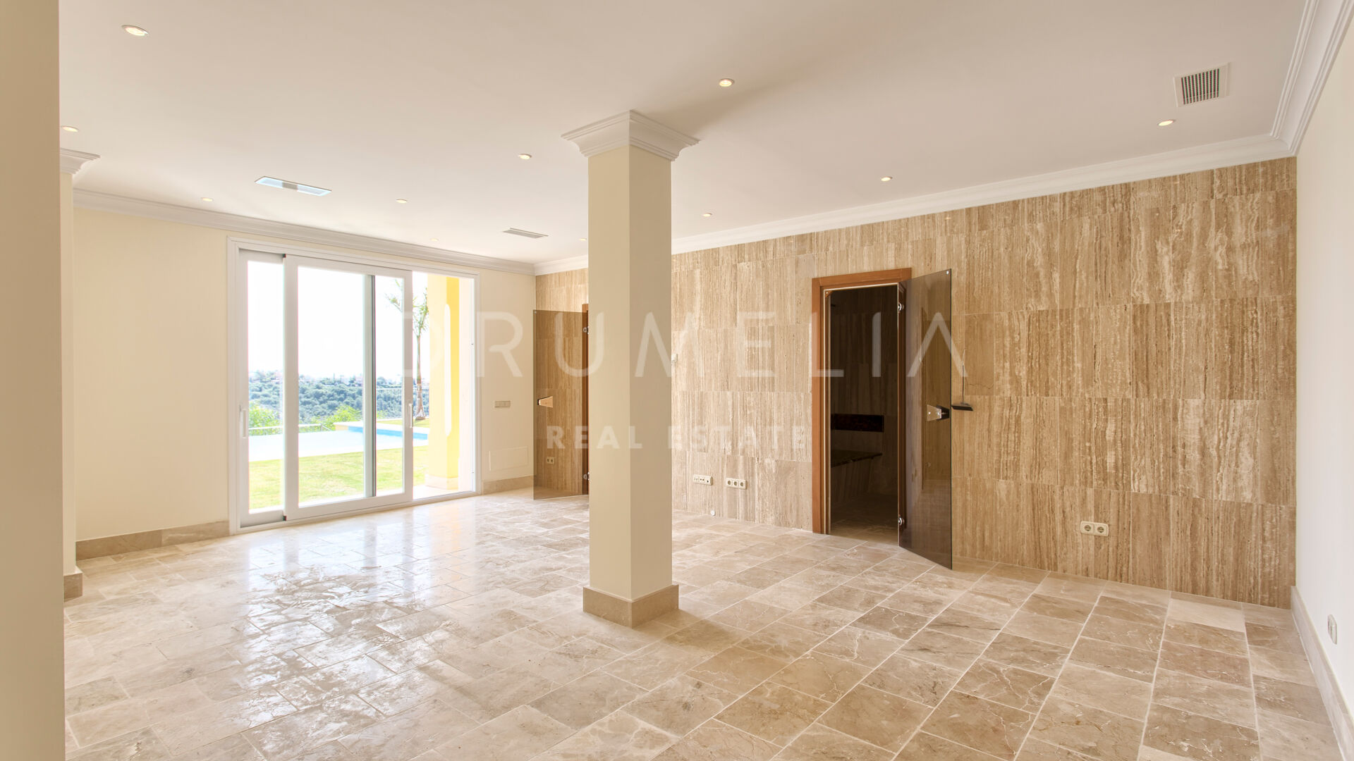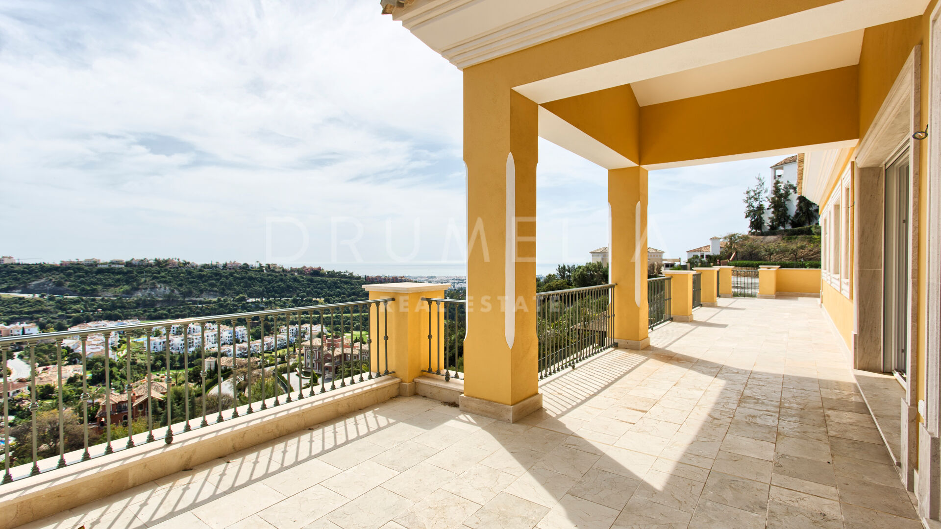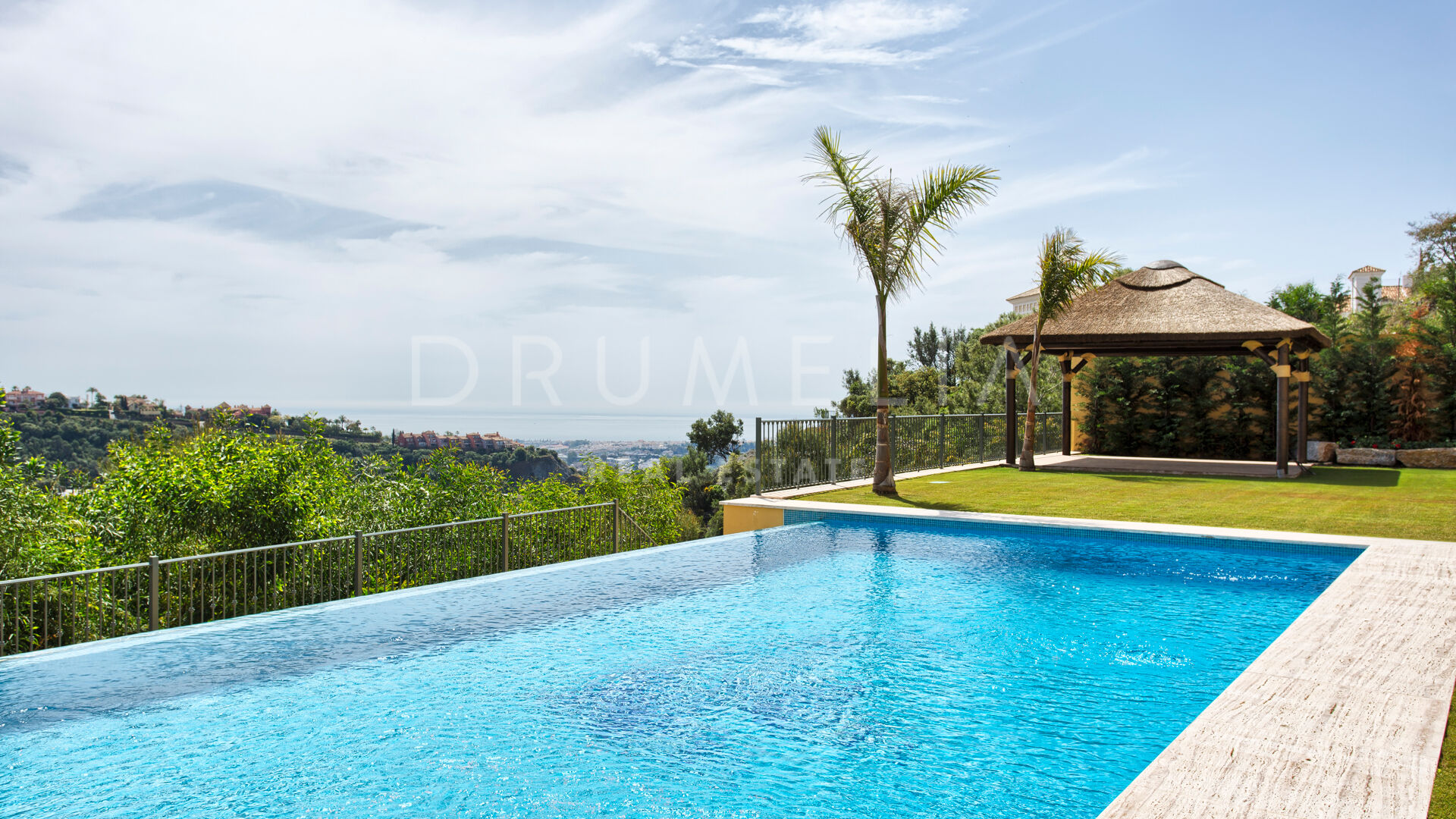 Grâce à sa position au sommet d’une colline et à son orientation sud-sud-est, la villa bénéficie d’une vue panoramique exceptionnelle sur la mer Méditerranée, Gibraltar et la côte africaine, la montagne emblématique de La Concha, les paisibles collines et vallées andalouses à la végétation luxuriante et les plantations d’oliviers. Beaucoup d’espace extérieur pour recevoir al fresco ou s’installer pour une soirée tranquille de repos, avec un livre ou un verre de bon vin espagnol en regardant les vues ou les célèbres couchers de soleil méditerranéens, une piscine de style moderne et un pavillon exotique avec toit africain idéal pour le barbecue doivent être mentionnés séparément. Les jardins paysagers bien entretenus attirent l’attention avec des pelouses vertes, des pins méditerranéens, des palmiers matures et des agrumes.