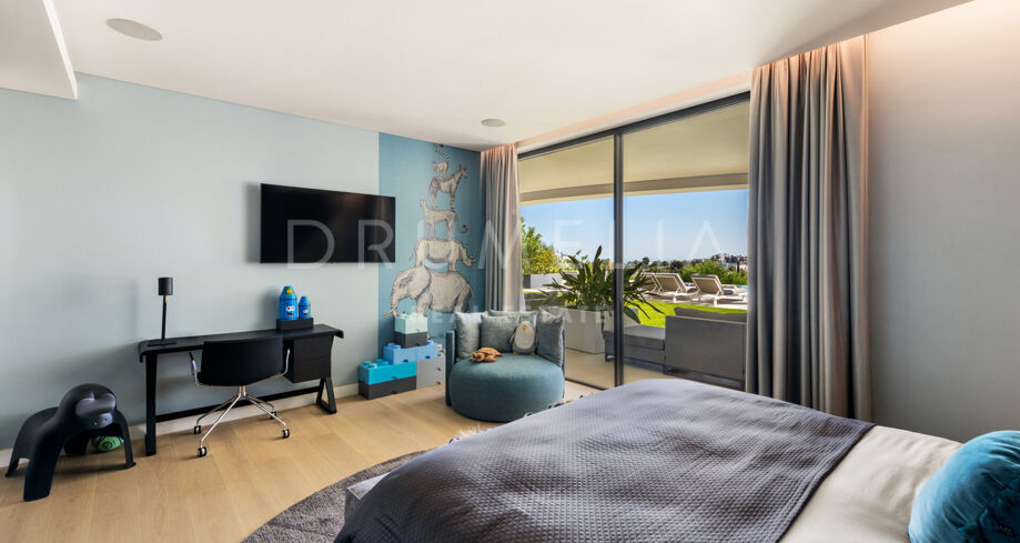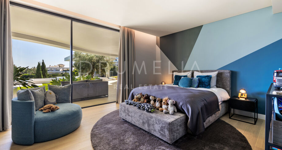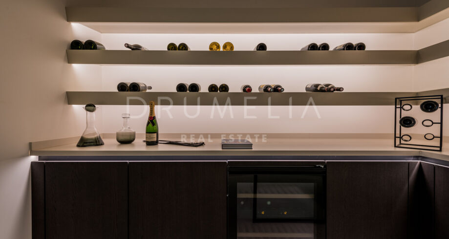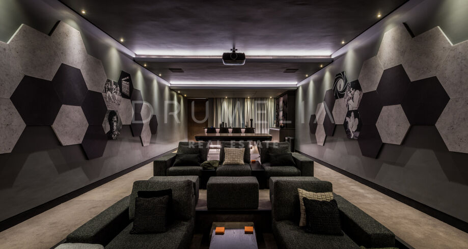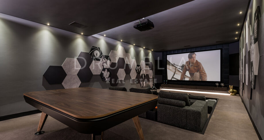 En descendant d’un niveau, vous trouverez 4 grandes chambres avec salles de bains attenantes, toutes avec un accès direct aux jardins luxuriants et à la piscine. Ce niveau abrite également un gymnase complet, un sauna, une bodega, un cinéma interne, une cuisine d’accueil et une aire de jeux. Le dernier niveau mène à une terrasse privée sur le toit, avec une cuisine extérieure, un jacuzzi, un foyer et un coin salon, parfaits pour profiter des couchers de soleil exquis.
