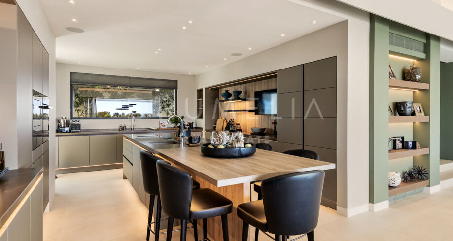 Les espaces extérieurs sont conçus pour la détente et le divertissement, avec une piscine à débordement, une cuisine extérieure et un barbecue Siematic, ainsi que deux aires de feu dans les jardins méticuleusement aménagés. La villa comprend également un garage fermé pour 4 voitures, une buanderie séparée et un parking privé pour les voiturettes de golf avec accès direct au terrain de golf.