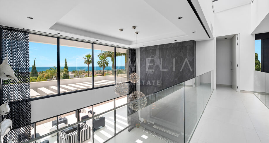 Cette villa de luxe de six chambres est répartie sur trois vastes niveaux et se situe dans le prestigieux domaine de Los Flamingos Golf, à Benahavís. Son architecture contemporaine s’allie à des vues panoramiques sur la mer Méditerranée et les parcours de golf environnants. L’entrée mène à un élégant hall qui organise harmonieusement les espaces, avec un salon principal remarquable par son plafond à double hauteur et son atmosphère lumineuse et ouverte.