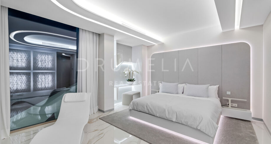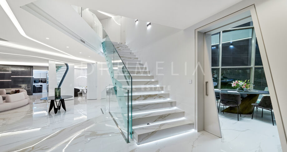 Cette villa design d’avant-garde est un chef-d’œuvre d’architecture contemporaine, offrant une élégance et une fonctionnalité inégalées. Située sur un terrain de 1 500 m² orienté au sud, cette villa écologique s’étend sur 1 229 m². De sa position privilégiée en deuxième ligne de plage, elle offre une vue panoramique à couper le souffle sur la mer Méditerranée, l’Afrique, Gibraltar et la baie de Marbella.