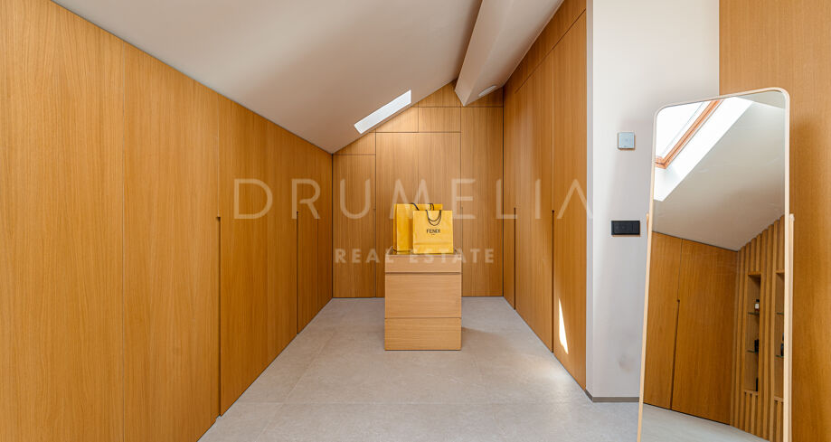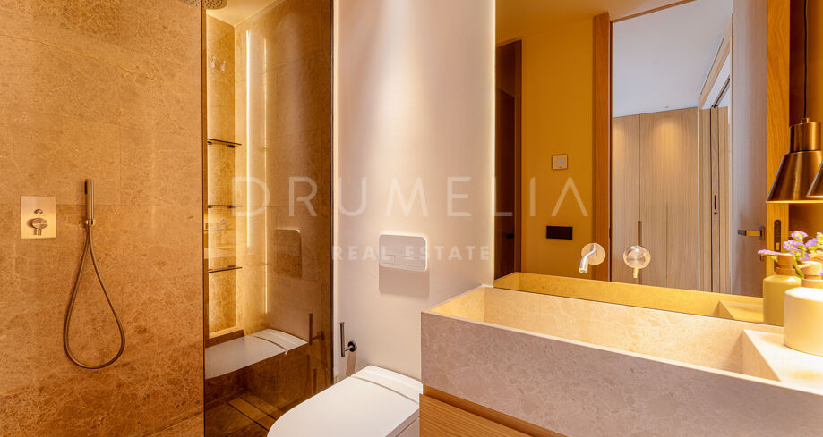 Réparti sur deux niveaux, le penthouse présente au niveau principal un vaste salon‑séjour, une cuisine moderne équipée des appareils Siemens, et deux chambres en suite, dont l’une est actuellement utilisée comme bureau. De ce niveau, on accède à une grande terrasse orientée plein sud, idéale pour se détendre ou prendre des repas en plein air. À l’étage supérieur, la suite principale offre intimité et accès direct à une terrasse de type balcon français, avec une salle de bains au style contemporain qui maintient la cohérence esthétique du reste de la propriété.