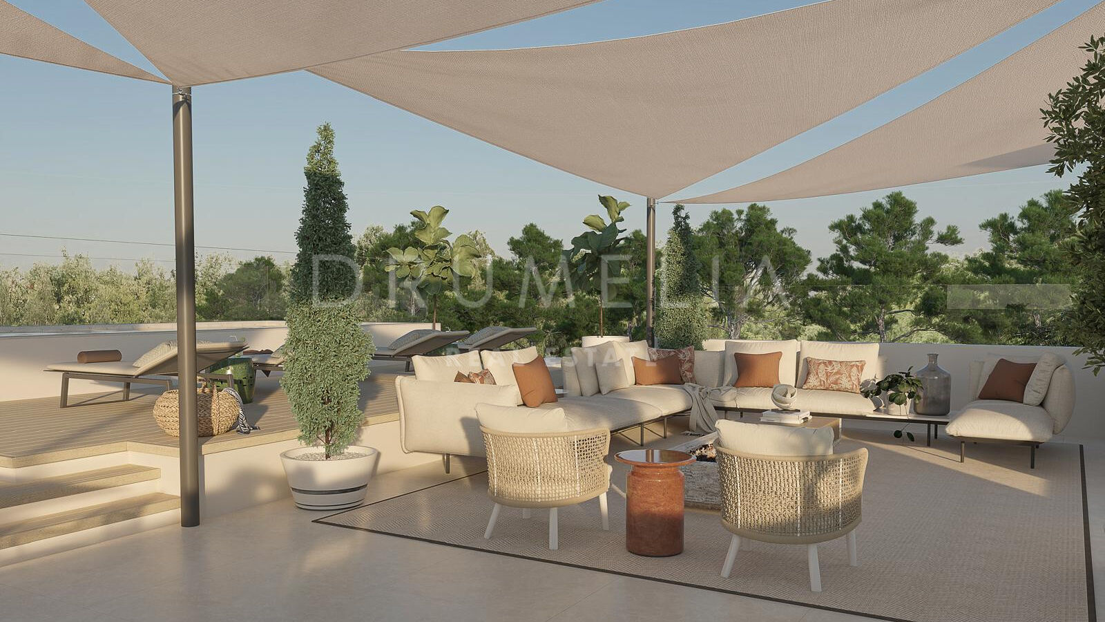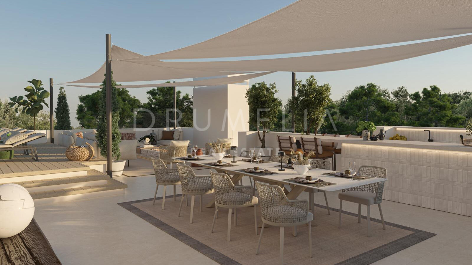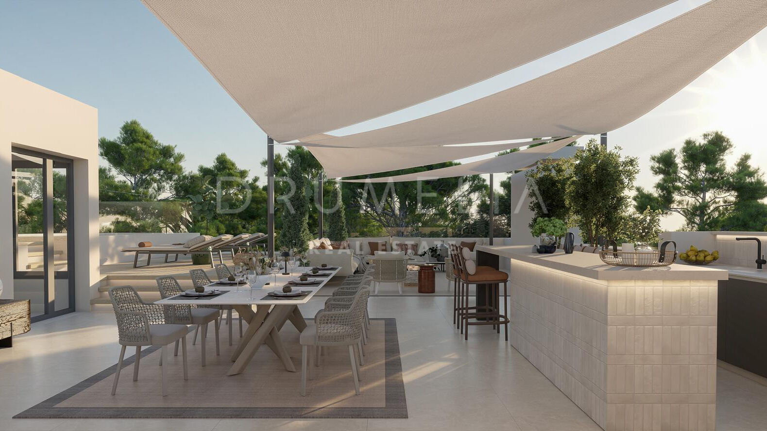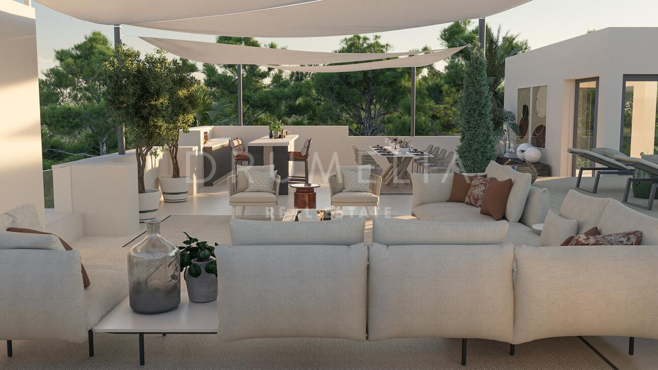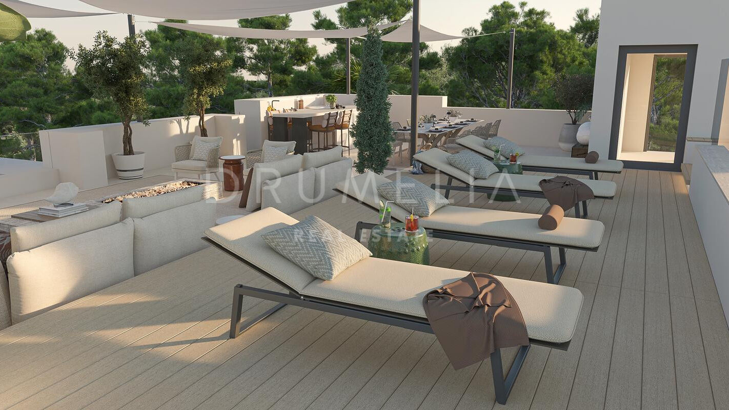 Les espaces extérieurs sont conçus pour profiter du style de vie méditerranéen, avec plusieurs zones de détente, une piscine privée et des vues dégagées sur la mer. Le solarium offre un espace supplémentaire avec une kitchenette extérieure, idéal pour se relaxer ou recevoir.