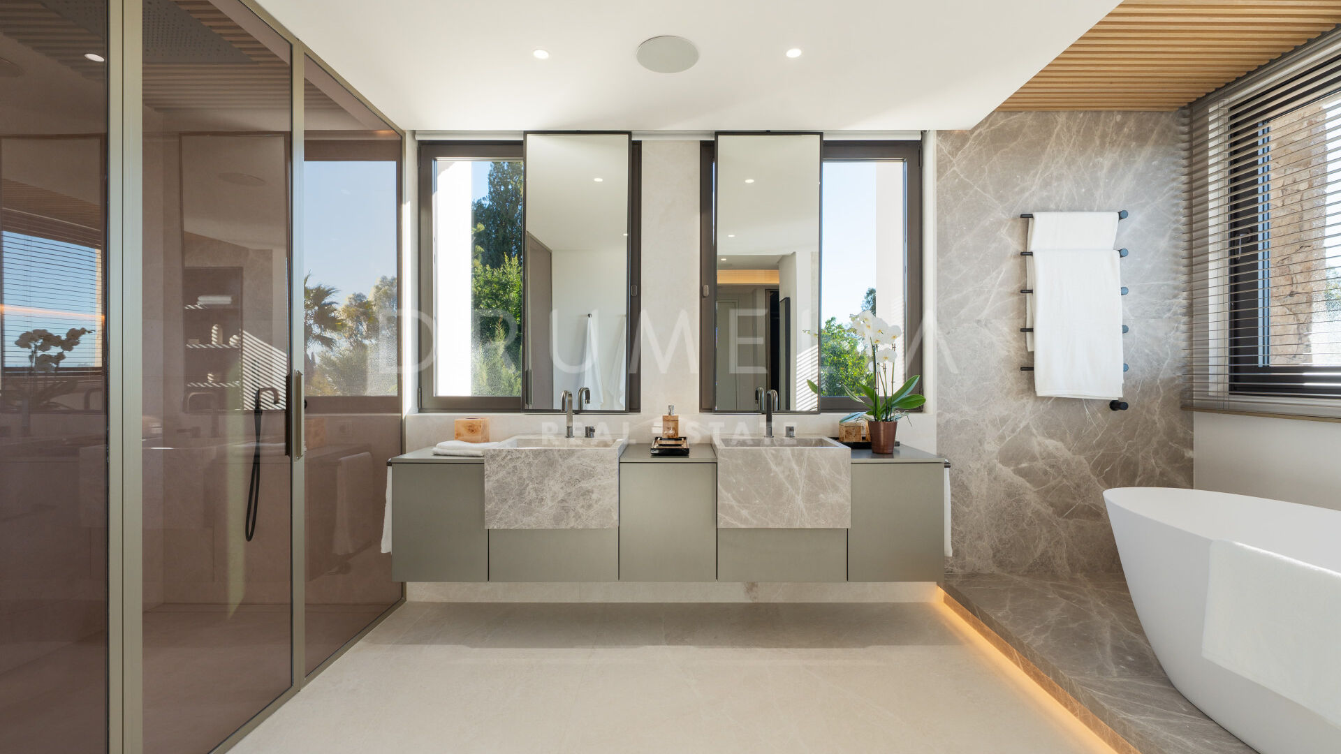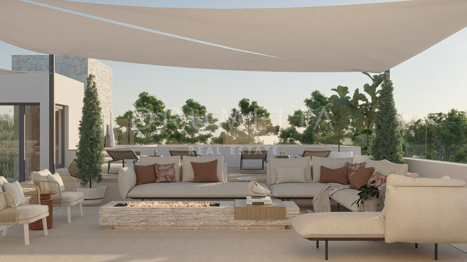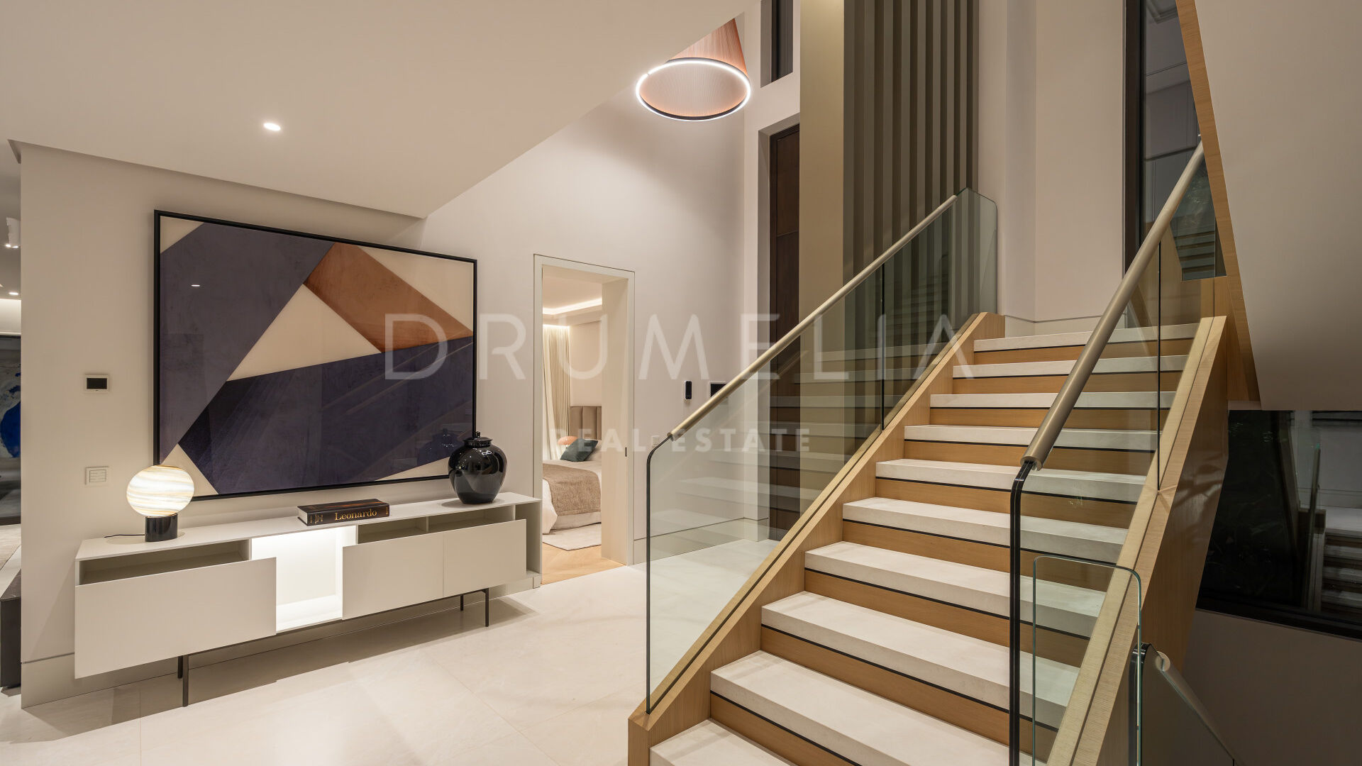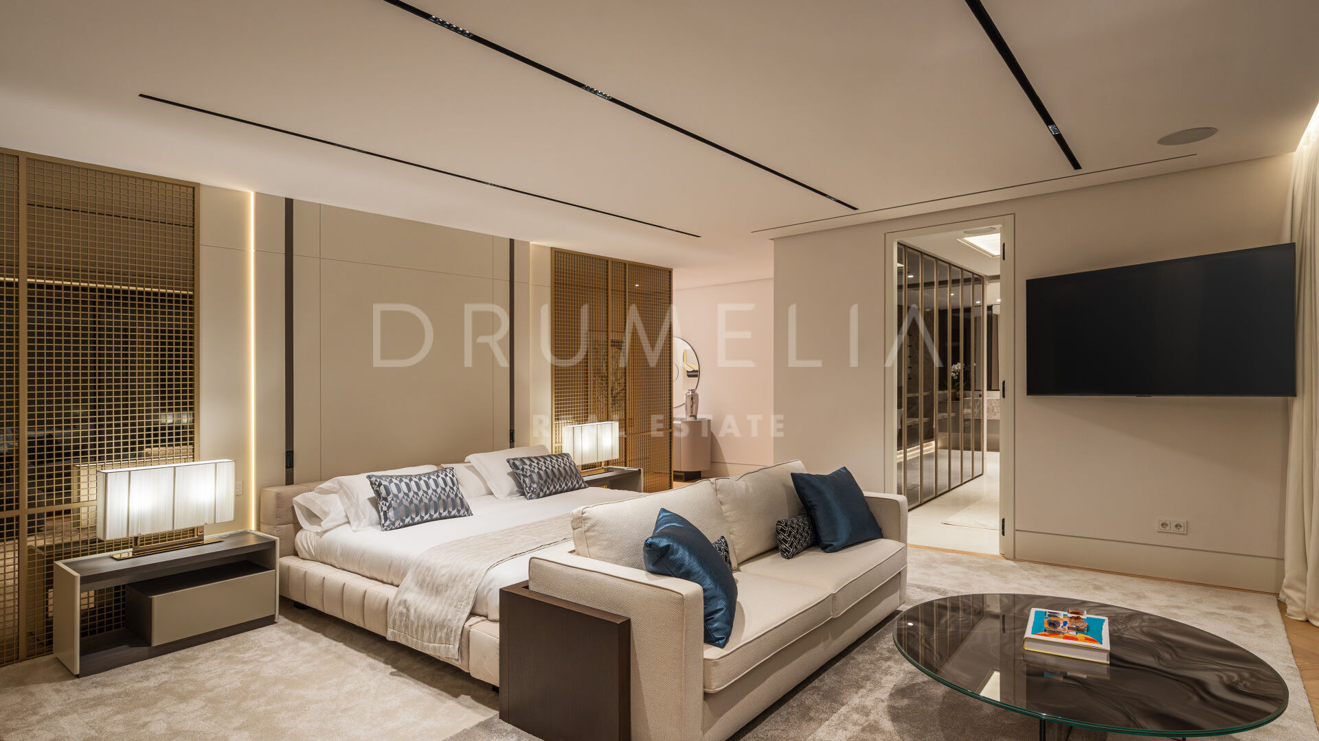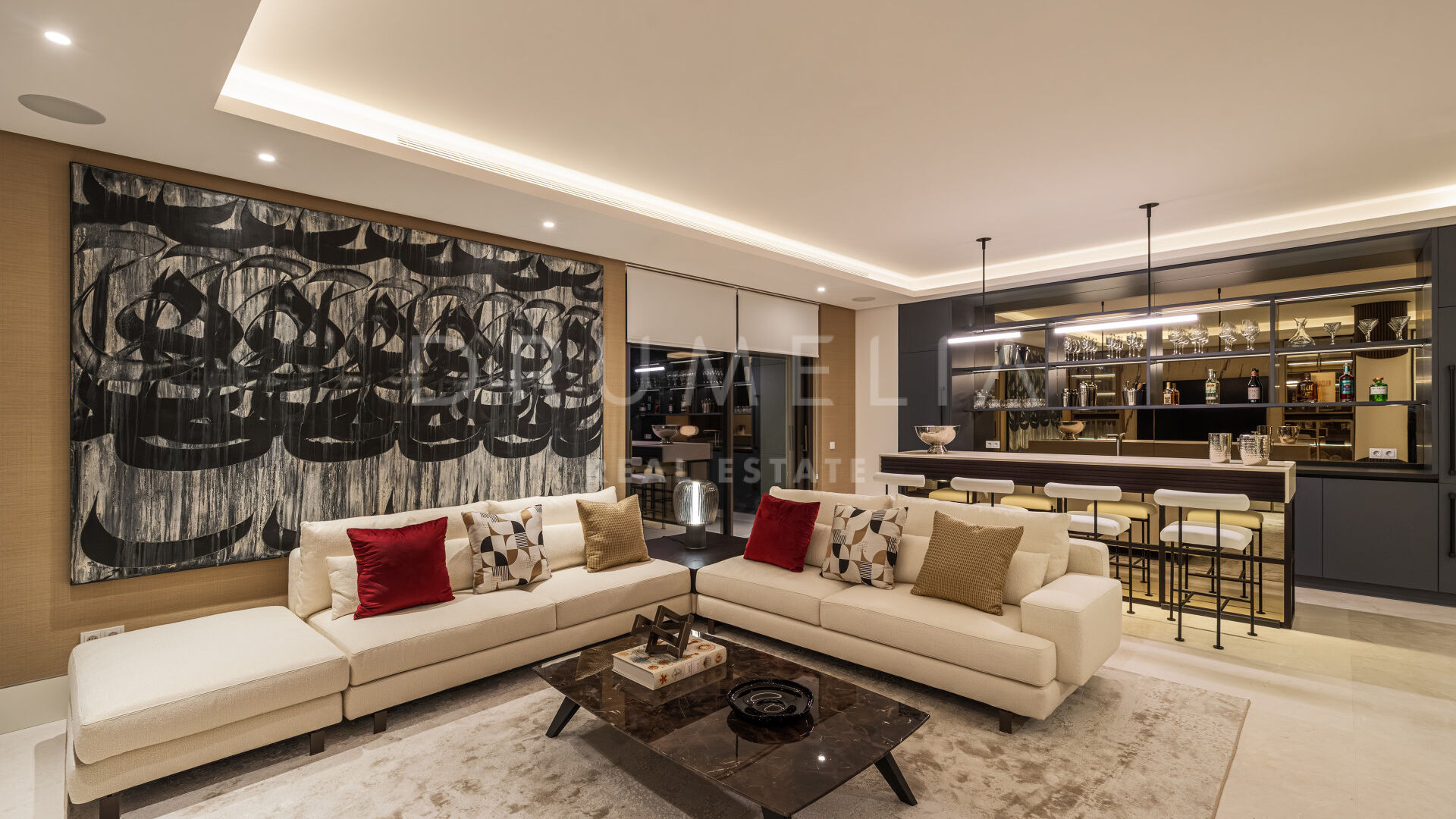 Les intérieurs, conçus par Pedro Peña, créent une atmosphère cohérente et raffinée dans toute la villa. Une palette de tons neutres, associée à des matériaux naturels tels que le bois et le marbre, apporte chaleur et équilibre aux espaces. Les pièces de vie adoptent une disposition ouverte, reliant le salon et la salle à manger tout en conservant des zones bien définies pour la vie quotidienne et la réception.