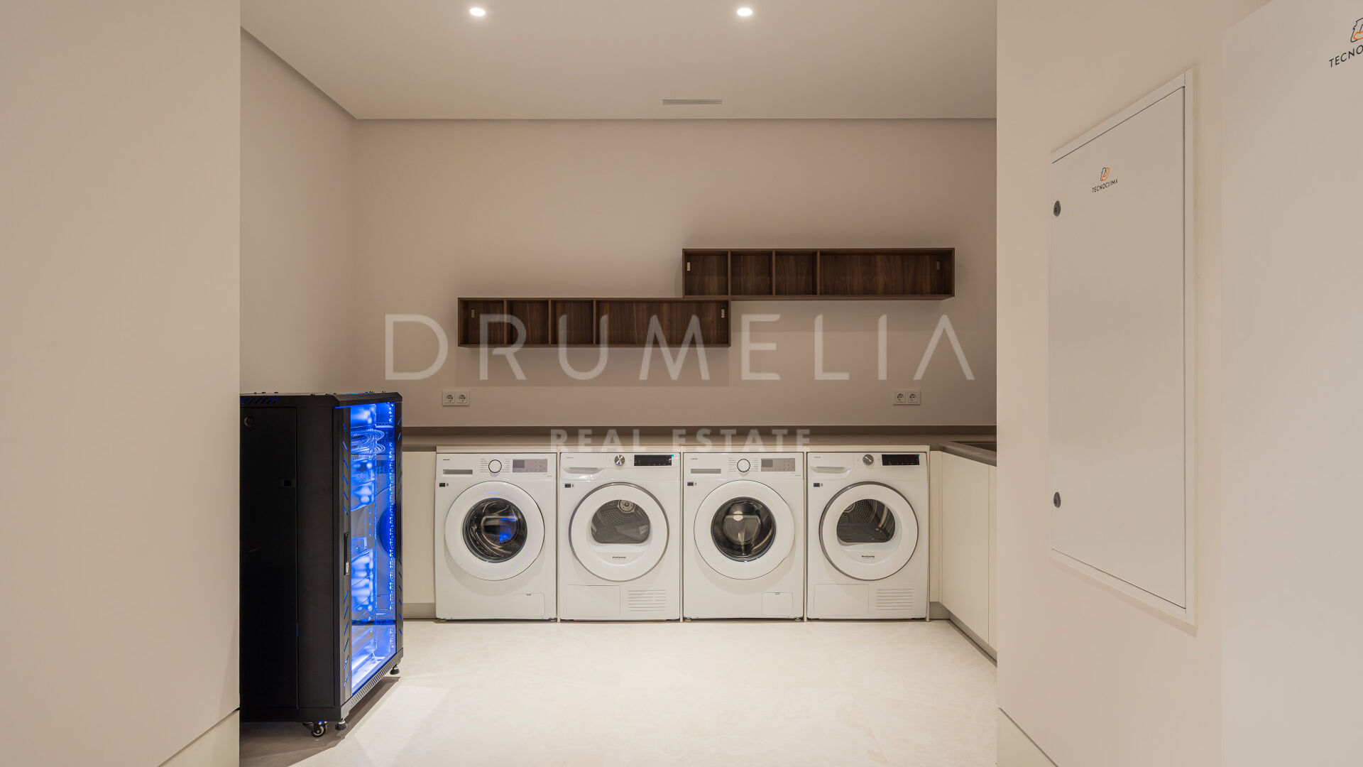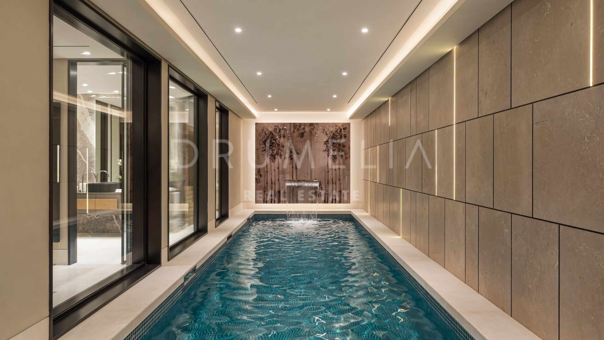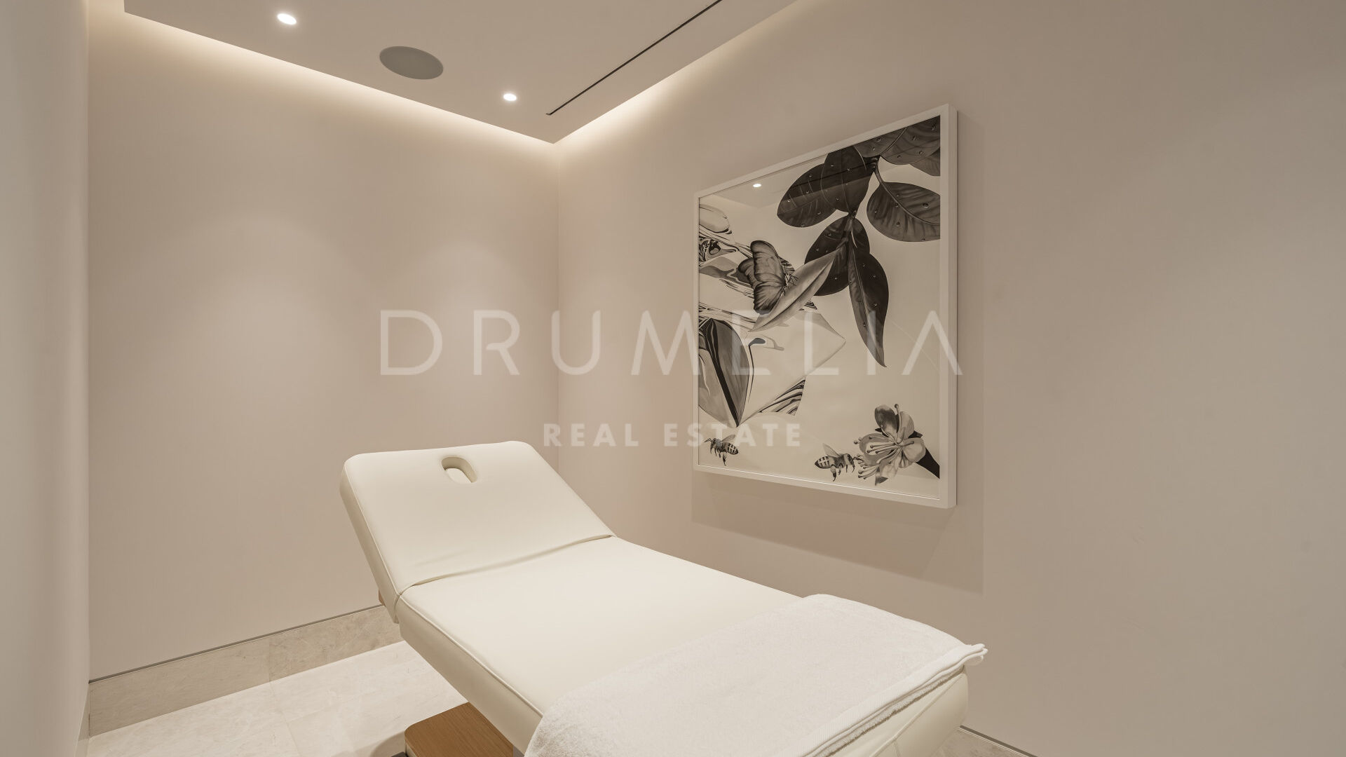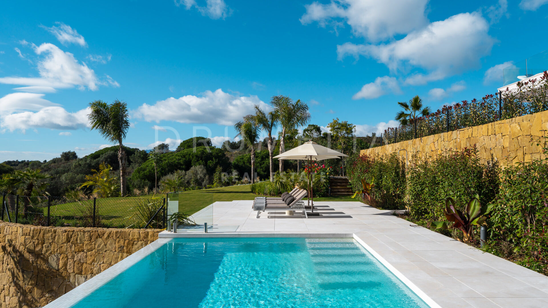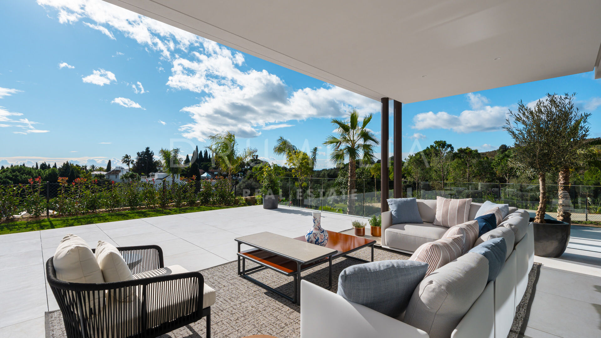 Les intérieurs, conçus par Pedro Peña, créent une atmosphère cohérente et raffinée dans toute la villa. Une palette de tons neutres, associée à des matériaux naturels tels que le bois et le marbre, apporte chaleur et équilibre aux espaces. Les pièces de vie adoptent une disposition ouverte, reliant le salon et la salle à manger tout en conservant des zones bien définies pour la vie quotidienne et la réception.