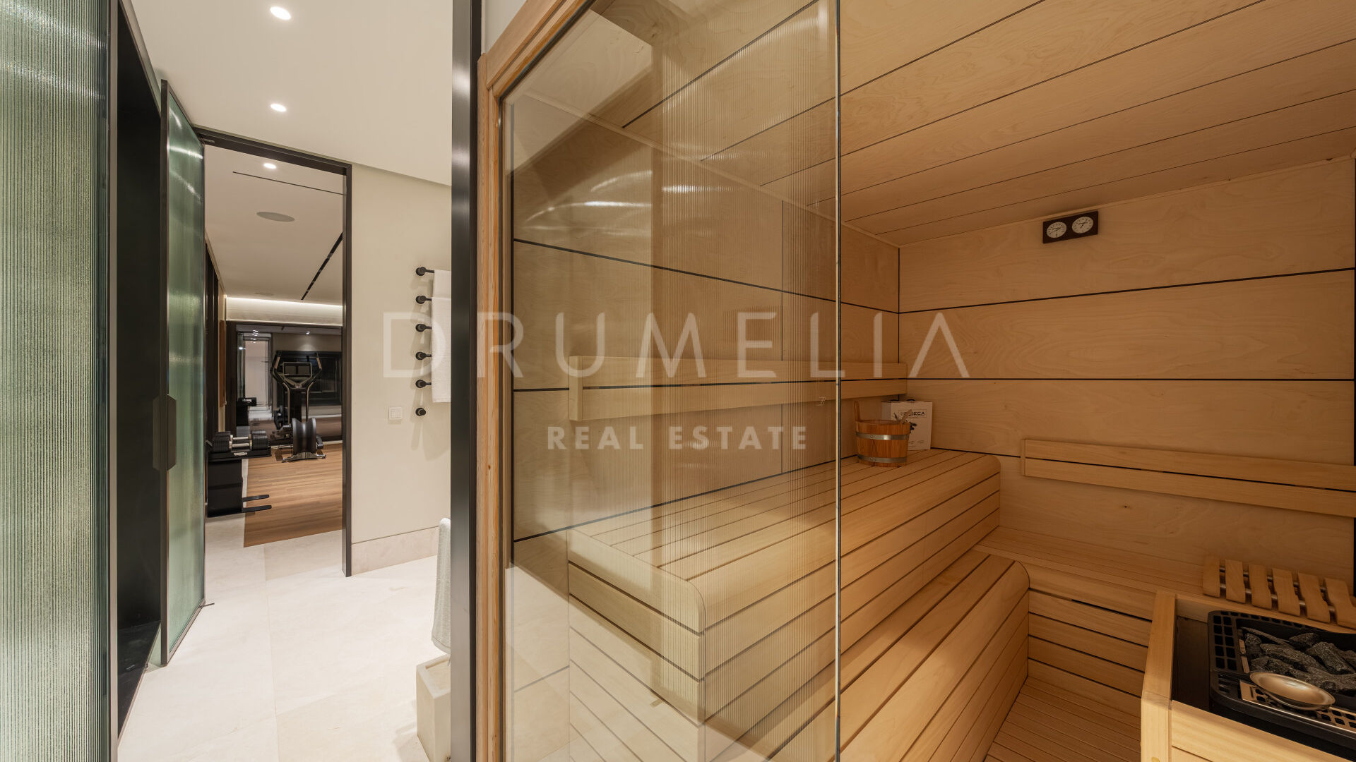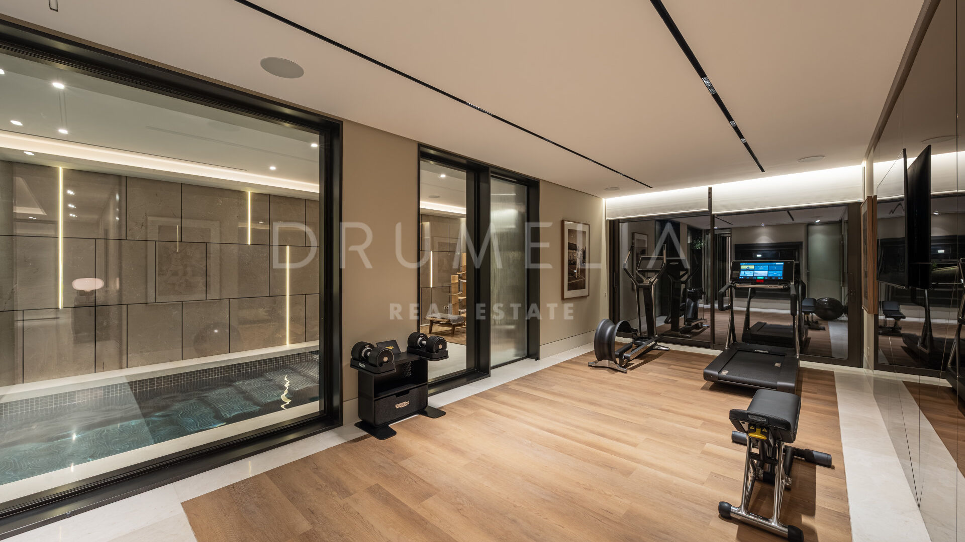 La villa propose également des espaces dédiés au bien-être et aux loisirs, incluant un bar privé, une salle de divertissement, une salle de sport entièrement équipée, un bain turc et une piscine intérieure, créant un véritable espace de détente au sein de la propriété.