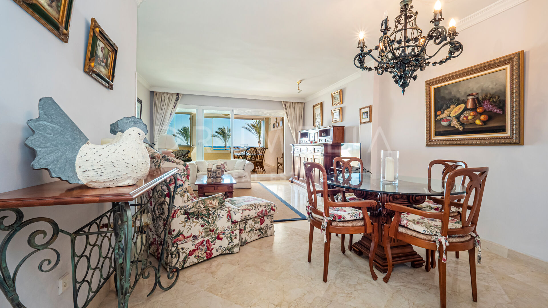 L’appartement propose 124 m² intérieurs et une terrasse couverte de 35 m² avec des fermetures vitrées pour un usage toute l’année. Il comprend un salon-salle à manger, une cuisine entièrement équipée, une suite parentale et une chambre d’amis avec salle de bain séparée.