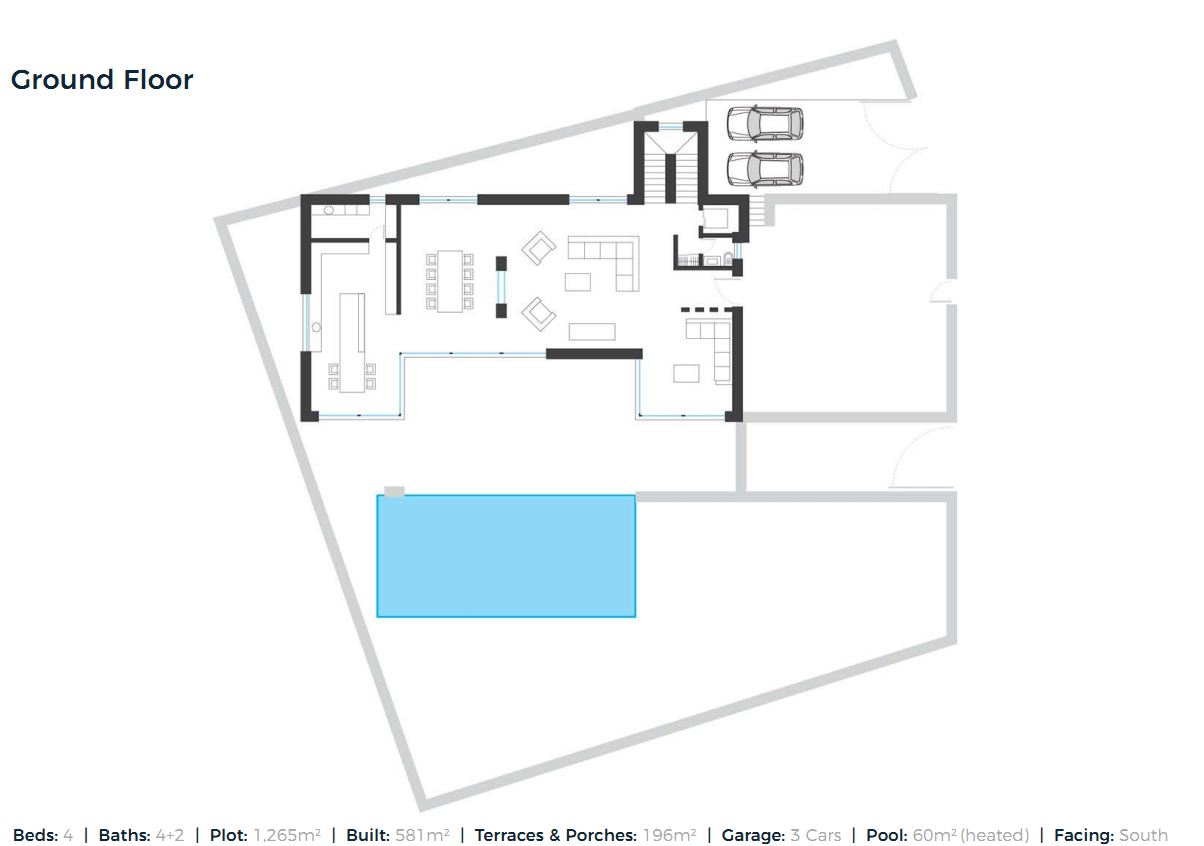 Le concept ouvert réunit un salon avec une double hauteur de plafond et une cheminée biologique à deux faces, une salle à manger et une cuisine moderne et élégante équipée d’appareils de haute qualité et reliée à la terrasse. Elle comprend 5 chambres sereines et 4 salles de bains superbement équipées (dont une baignoire ovale autoportante), une salle familiale, des espaces de divertissement, un garage pour 3 voitures. Le solarium et les terrasses spacieuses offrent une vue panoramique sur la mer jusqu’en Afrique.