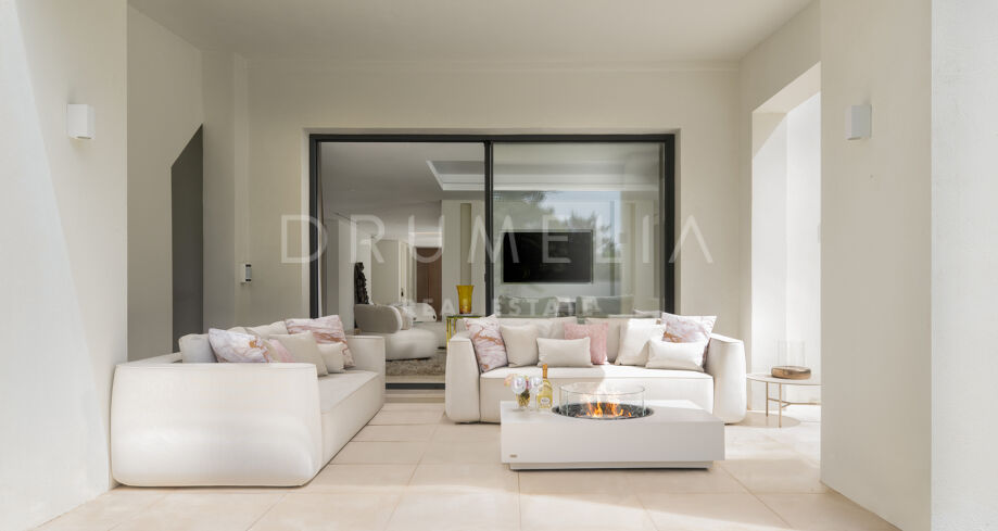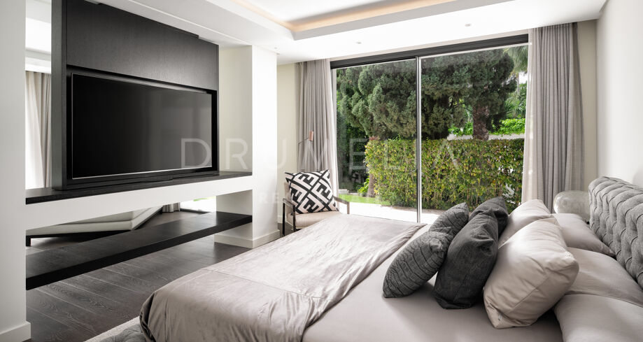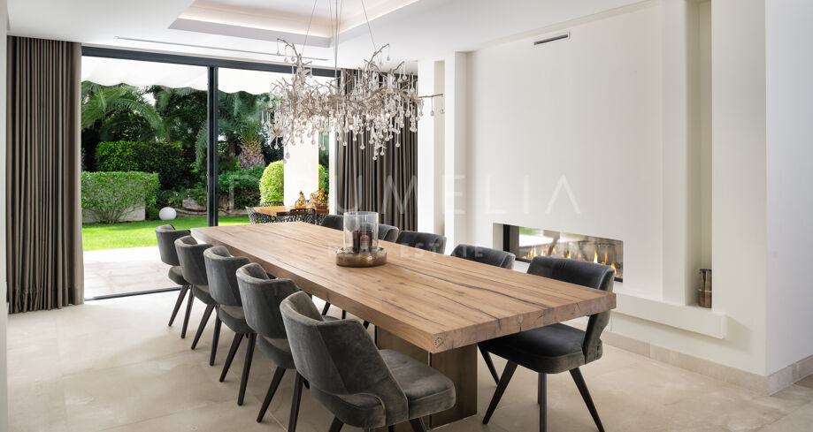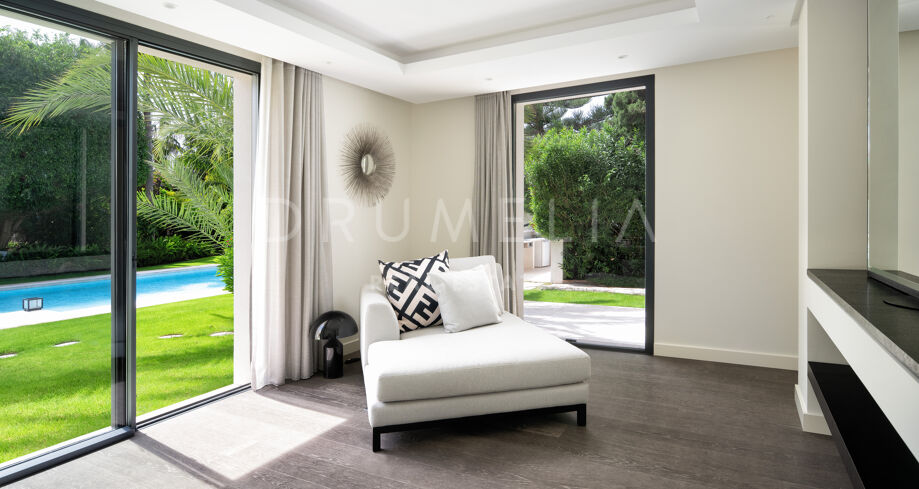 Cette villa de 5 chambres est disponible à la vente à Marbesa, un quartier recherché de Marbella situé à quelques mètres de la plage. Cette villa de plain-pied a fait l’objet d’une rénovation complète en 2020 et dispose d’une grande piscine, de plusieurs espaces de détente extérieurs, d’un bar de piscine et d’un paysage soigné. La propriété comprend cinq chambres luxueuses avec salle de bains, une salle à manger séparée, un salon chic avec une cheminée contemporaine et un hall d’entrée impressionnant. Deux des chambres offrent des espaces séparés pour s’habiller et se détendre, avec vue sur le jardin.