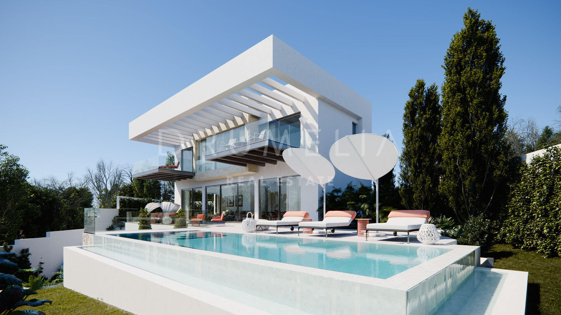 Regardons de plus près cette villa blanche de style contemporain avec l’élément de design Avant Gard construit avec des matériaux de haute qualité. Les nuances de blanc font paraître tout plus grand, d’autant plus que l’espace est baigné de lumière naturelle grâce à l’abondance de verre. La maison lumineuse, orientée sud/ouest, profitera du soleil toute la journée. Les finitions et les éléments architecturaux de couleur coquille d’œuf et crème contribuent à refléter la lumière, créant l’impression d’un espace encore plus grand.