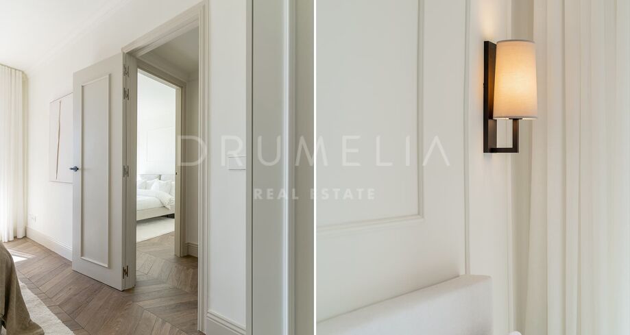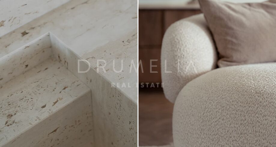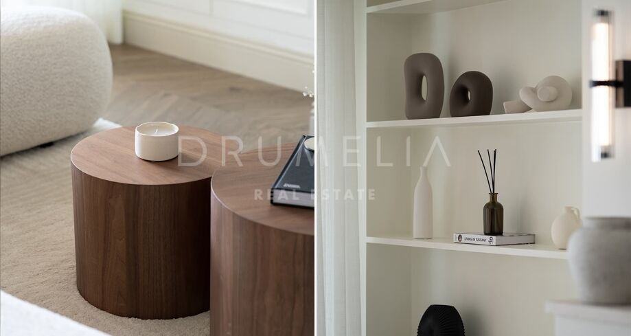 La propriété dégage luminosité et espace grâce à ses grandes baies vitrées, qui inondent chaque pièce de lumière naturelle et créent une atmosphère chaleureuse, accueillante et sophistiquée. Les détails en bois naturel, l’escalier en microciment et les moulures en stuc d’inspiration nordique apportent un caractère intemporel et élégant.