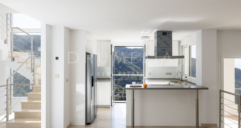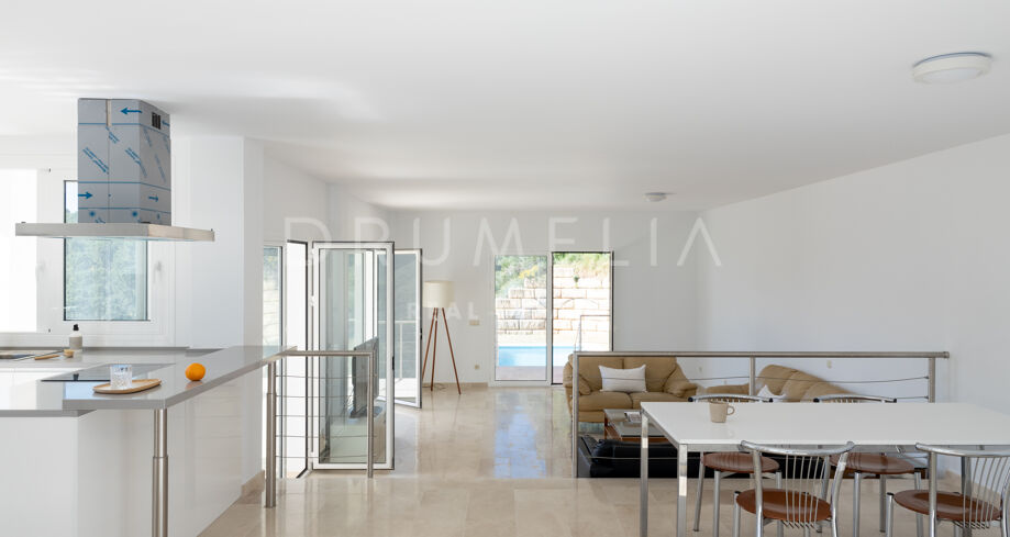 Entourée par les propriétés haut de gamme et la belle nature de Benahavis, cette propriété moderne de style méditerranéen de 551 m² se trouve sur un grand et pittoresque terrain de 1.852 m². Orientée au sud, elle offre des vues spectaculaires sur la mer et les montagnes depuis presque toutes les pièces. L’espace de vie est réparti sur 3 étages reliés par un escalier caractéristique, avec 2 chambres au premier étage lorsque vous entrez, et le reste de l’espace de vie au rez-de-chaussée. La maison comprend 5 chambres sereines, 4 salles de bains modernes et des toilettes pour les invités. Toutes les pièces sont spacieuses et les chambres principales sont dotées d’une salle de bains et de placards intégrés. L’espace de vie ouvert à deux niveaux comprend un salon et une salle à manger, et mène à une terrasse et à la piscine privée, parfaite pour se reposer et recevoir en plein air. La cuisine épurée de style minimaliste est entièrement équipée, dispose d’un comptoir de bar/coin repas et d’un balcon offrant une vue imprenable sur la verdure. Le niveau inférieur de la villa offre un grand potentiel avec d’autres pièces de tailles différentes et la possibilité de transformer l’espace en salle de cinéma, en espace de divertissement, en cave à vin ou en salle de sport.