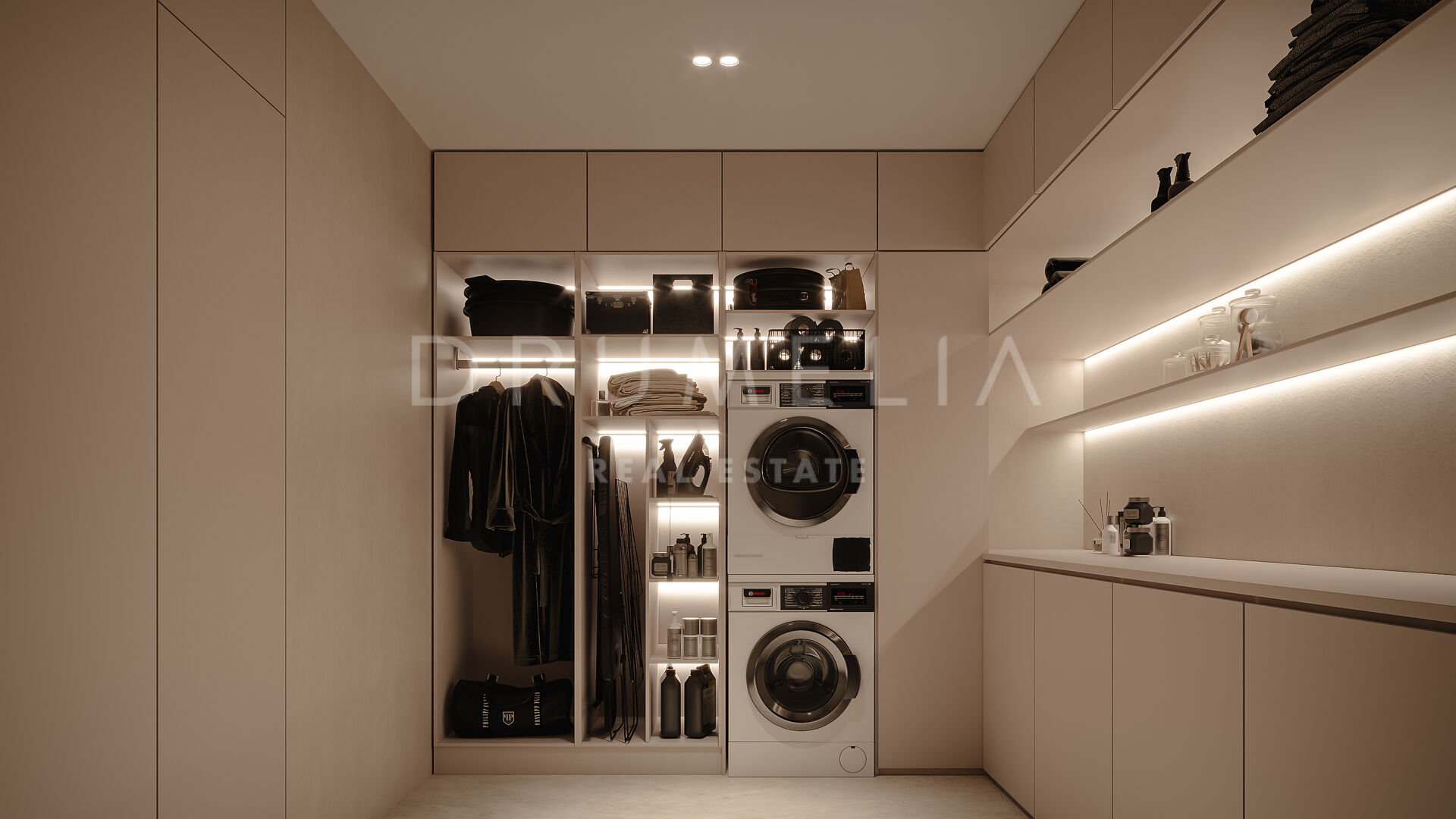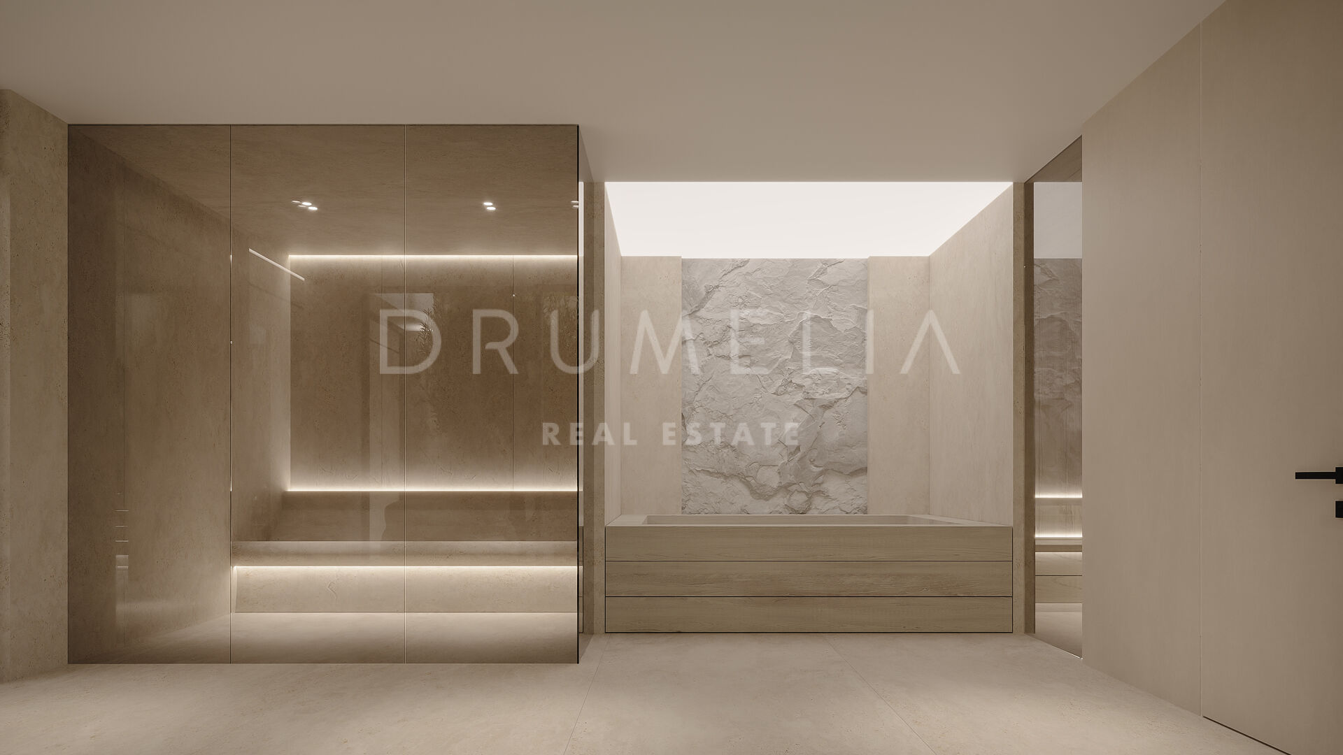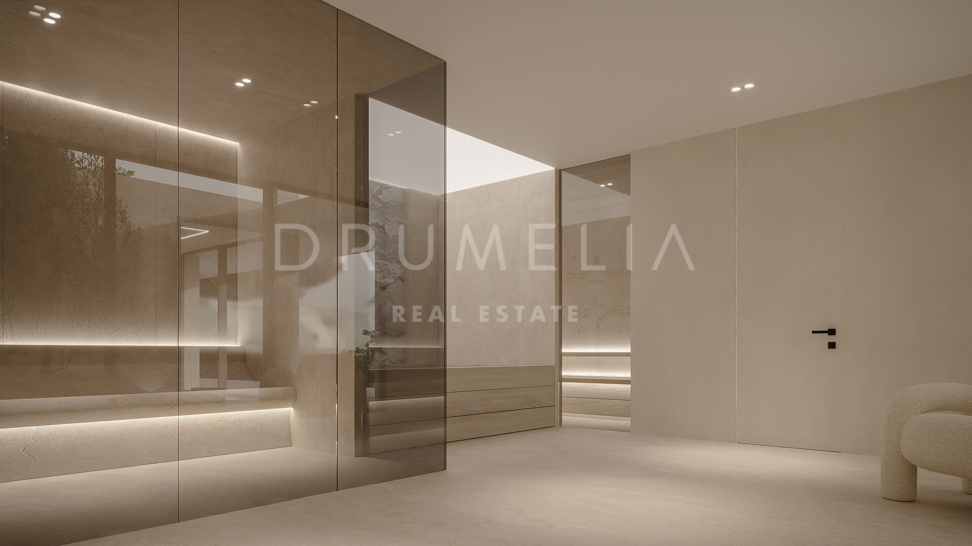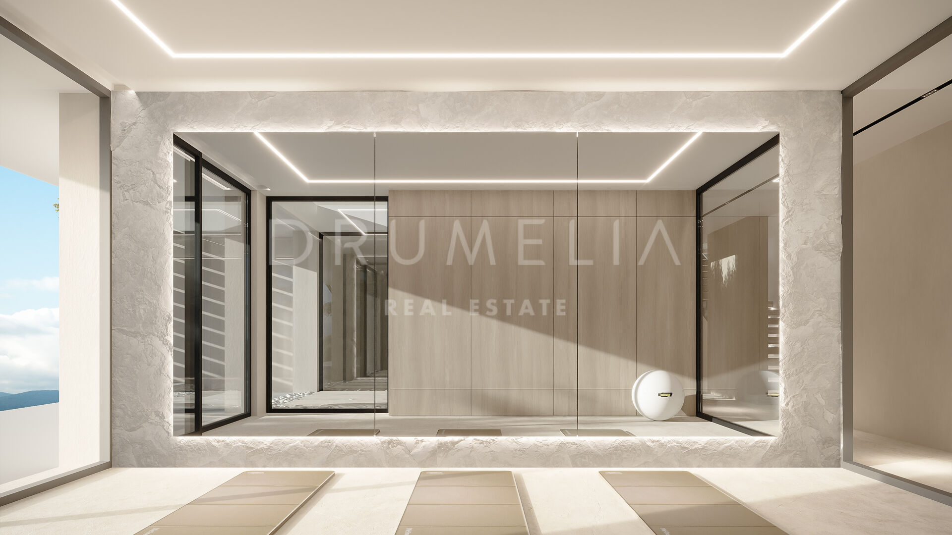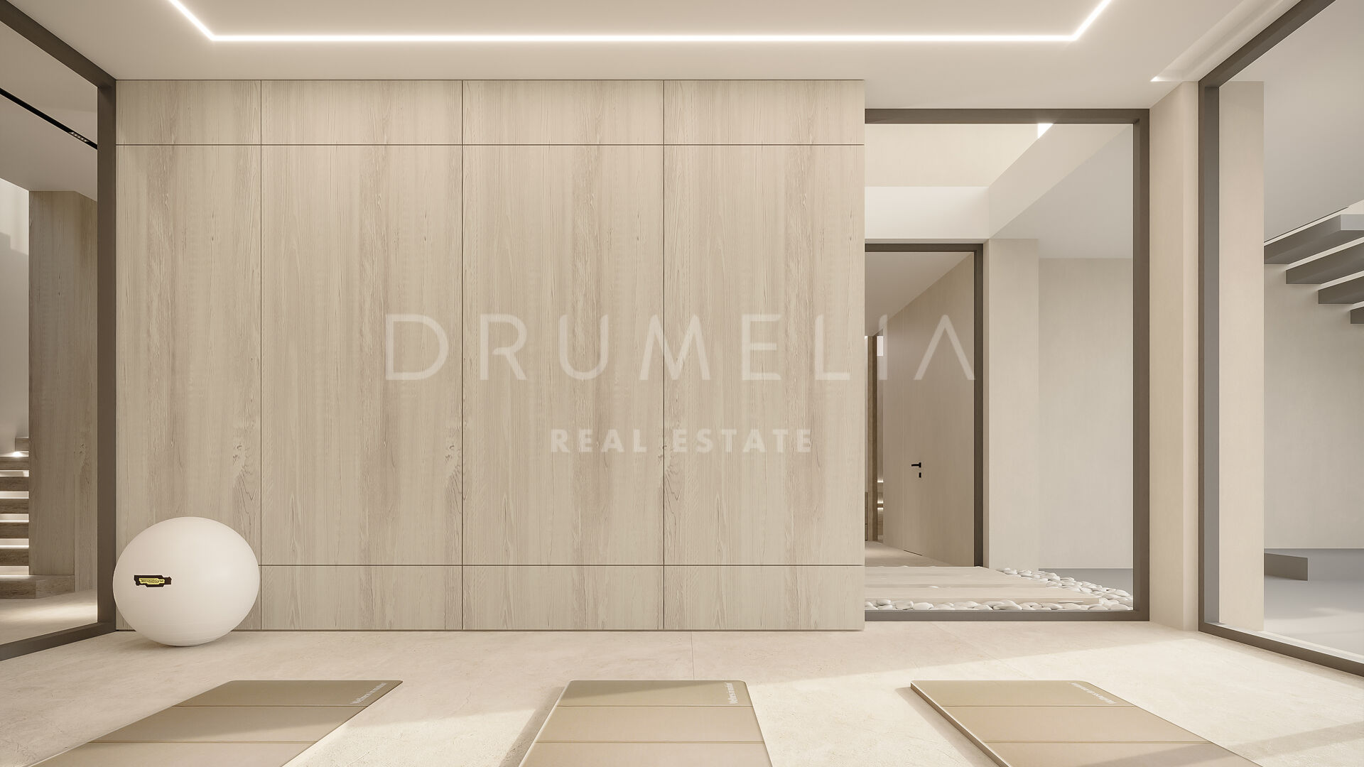 Le design architectural propose un agencement spacieux avec de généreux volumes intérieurs et d’excellentes installations de loisirs. Le sous-sol est conçu comme un espace de bien-être complet comprenant une salle de sport, un spa avec sauna, une salle de sel et une salle de bain de spa, ainsi qu’une buanderie, un cellier, une salle technique et un espace pour le personnel avec chambre et salle de bain indépendantes. Trois chambres en suite avec dressings privés complètent ce niveau, offrant intimité et fonctionnalité.