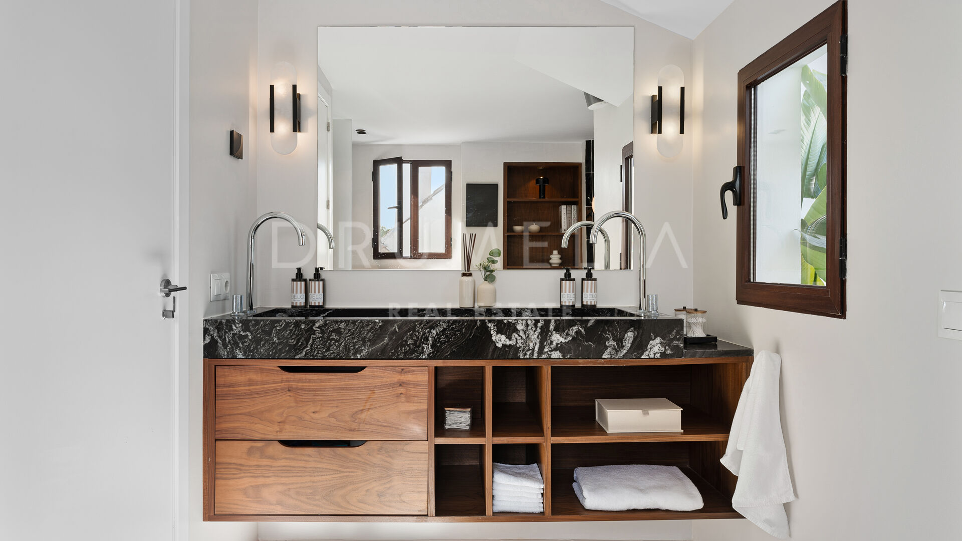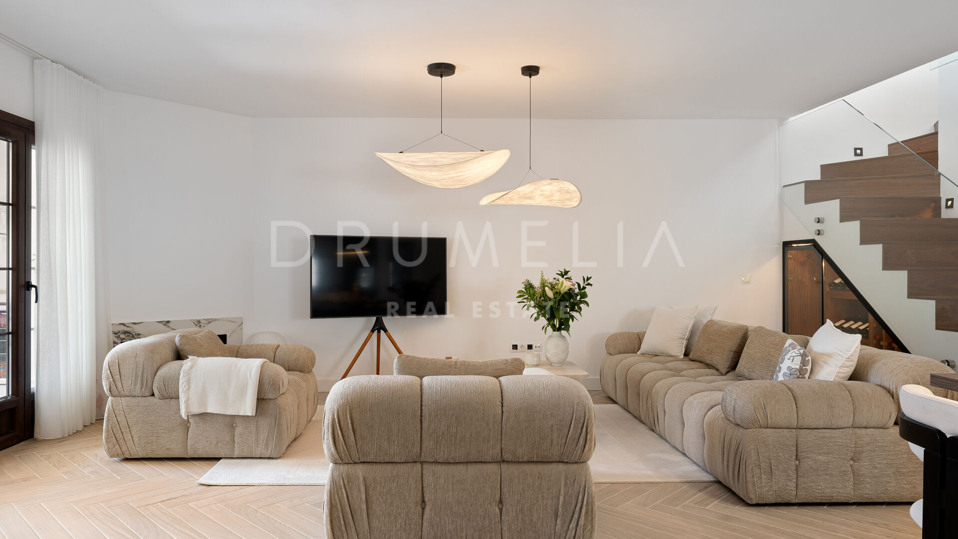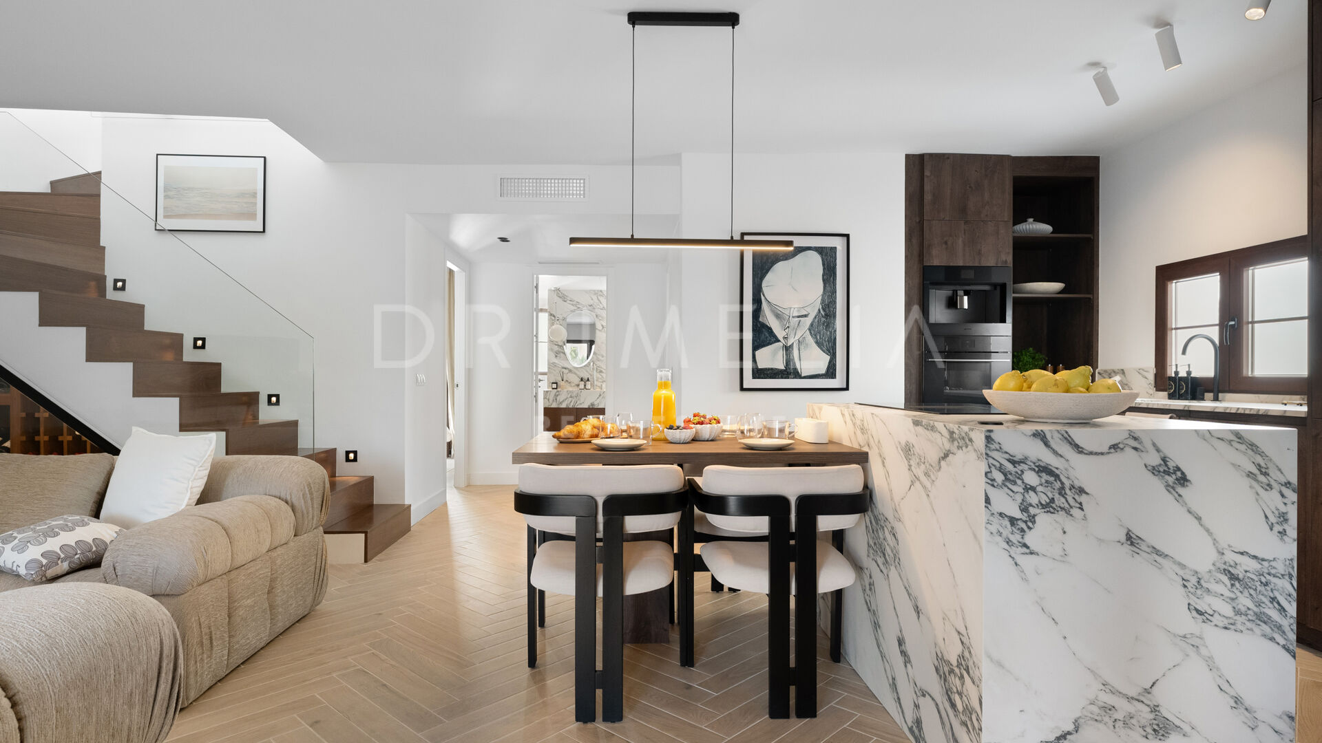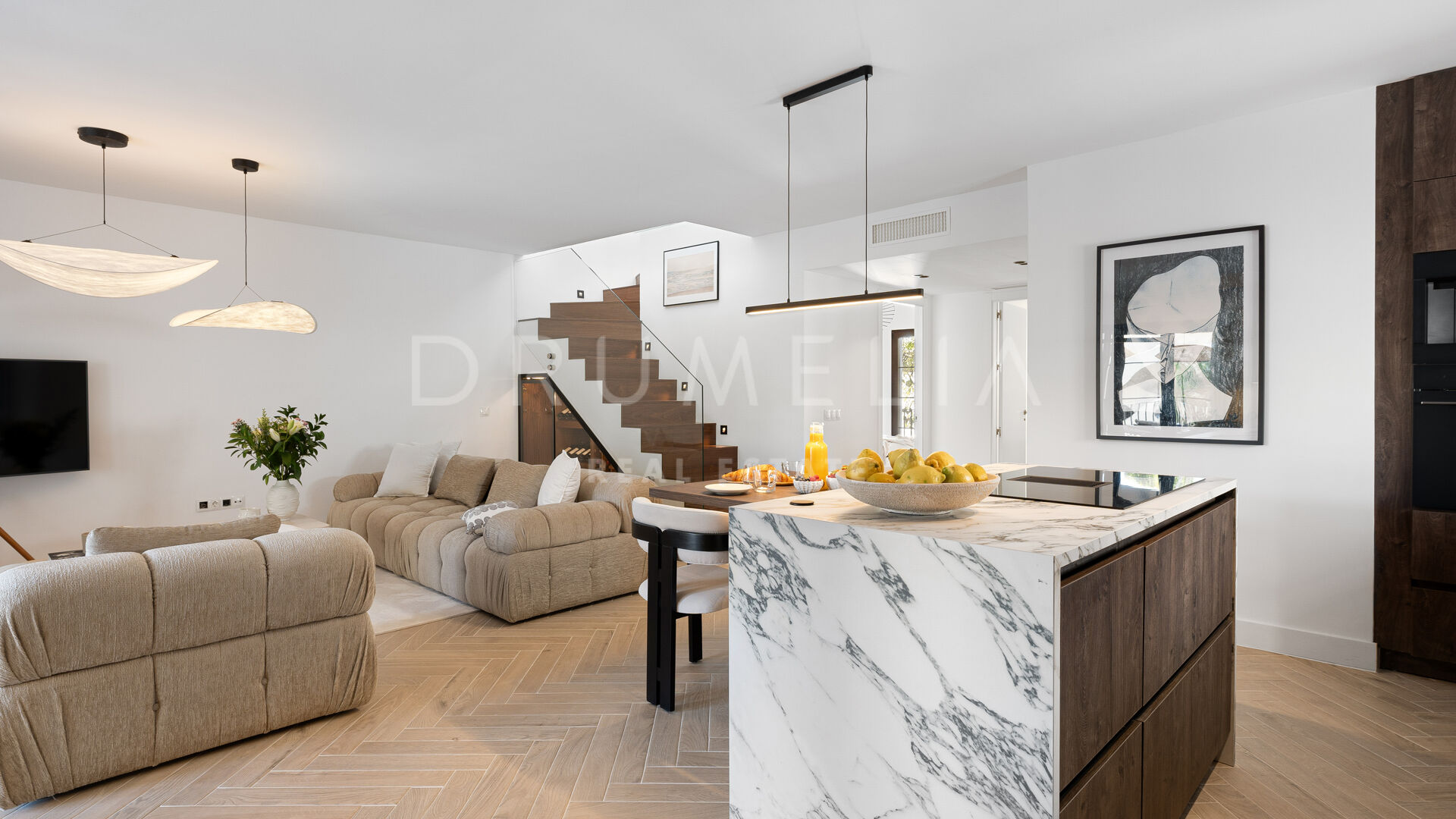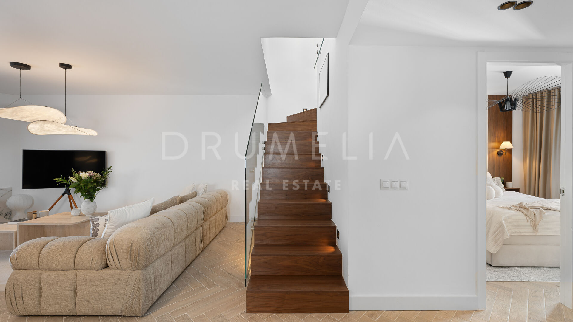 Nichée dans le prestigieux Golden Mile, l’urbanisation Montepiedra offre un mélange exceptionnel d’opulence et de praticité. Cette propriété entièrement rénovée, mise à jour en 2024, s’étend sur 169m². L’espace intérieur de 129 m² est réparti sur deux étages, offrant un agencement optimal pour une vie contemporaine. L’orientation sud assure une lumière naturelle abondante tout au long de la journée, mettant en valeur l’élégance de l’ameublement moderne.