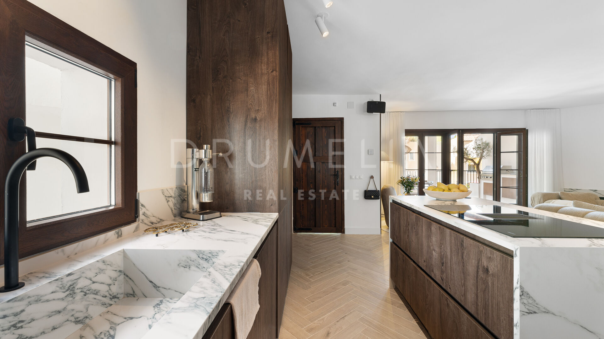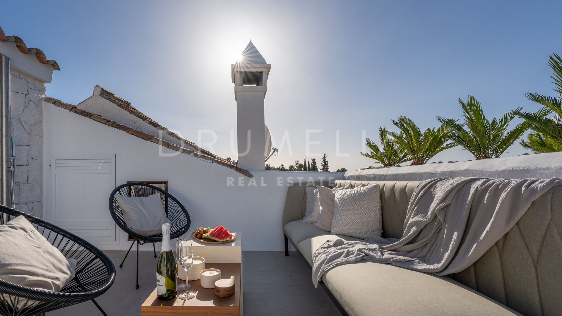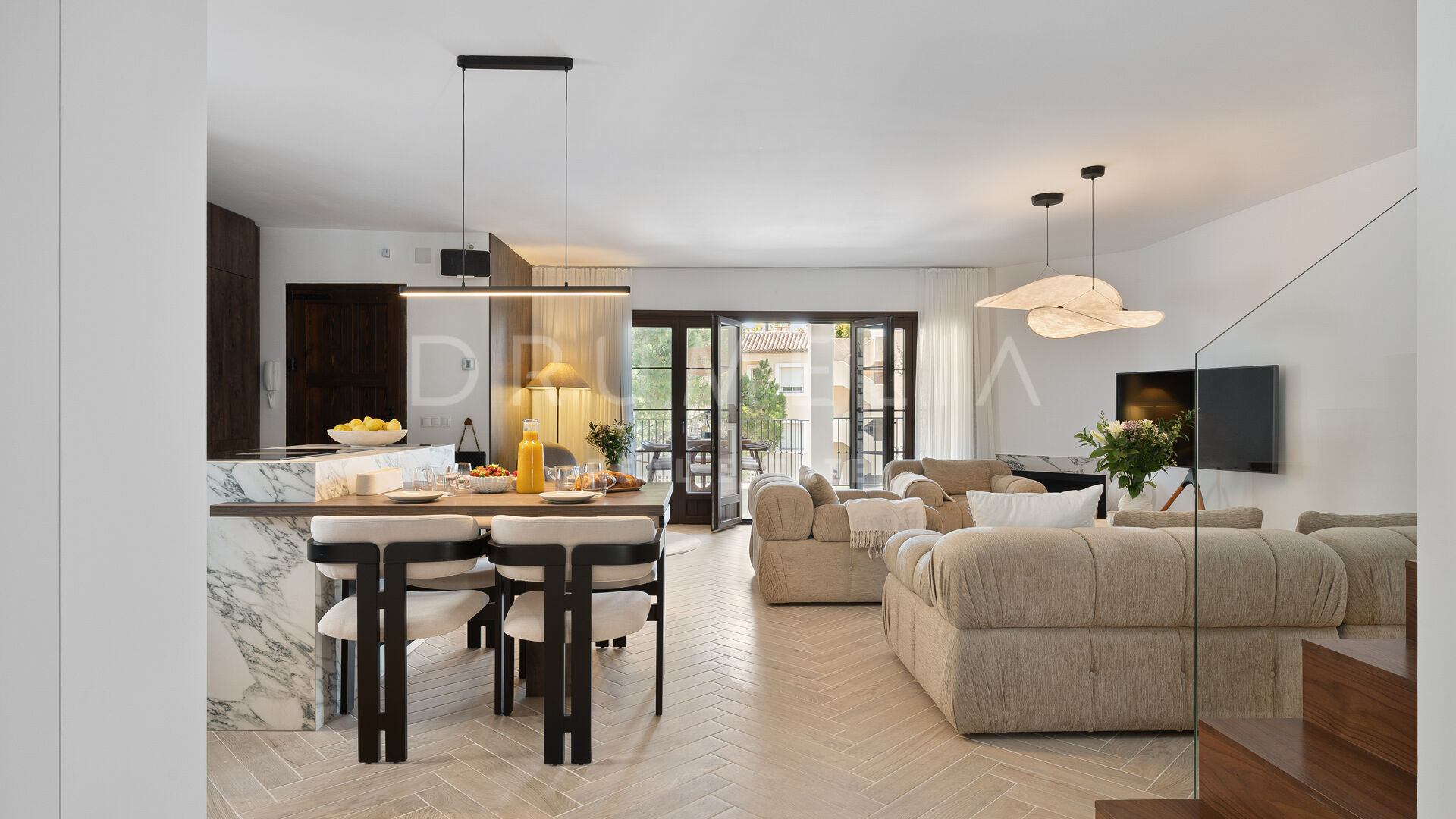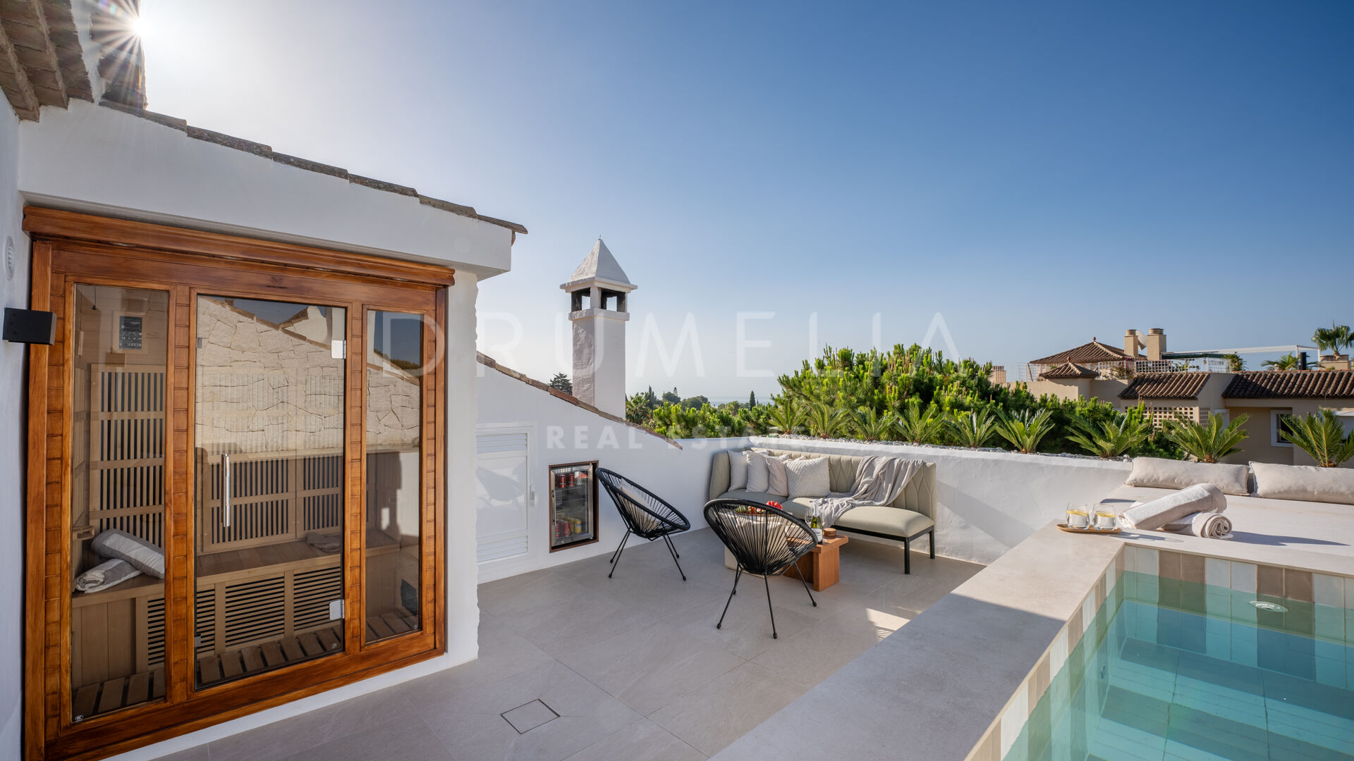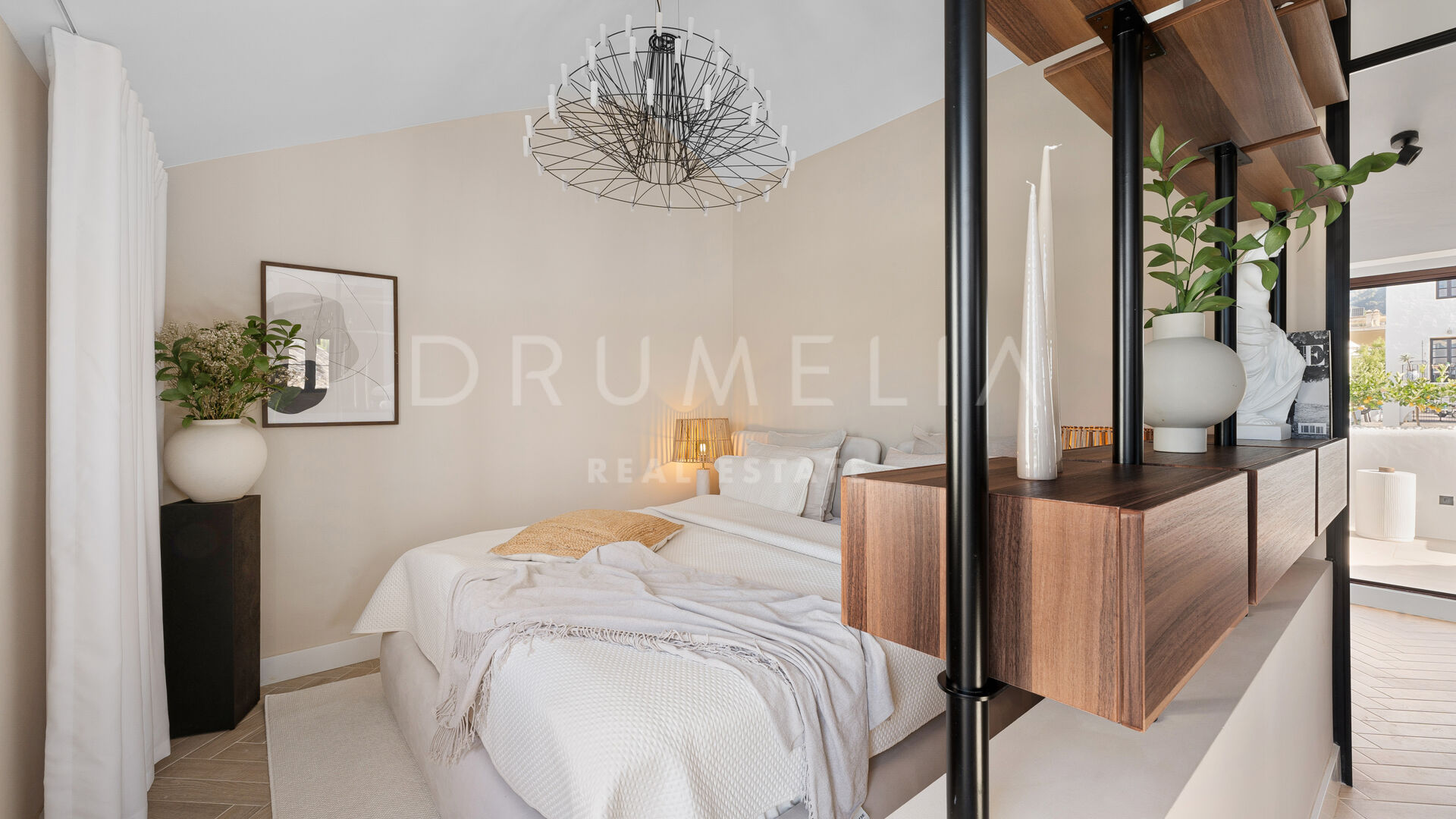 Nichée dans le prestigieux Golden Mile, l’urbanisation Montepiedra offre un mélange exceptionnel d’opulence et de praticité. Cette propriété entièrement rénovée, mise à jour en 2024, s’étend sur 169m². L’espace intérieur de 129 m² est réparti sur deux étages, offrant un agencement optimal pour une vie contemporaine. L’orientation sud assure une lumière naturelle abondante tout au long de la journée, mettant en valeur l’élégance de l’ameublement moderne.