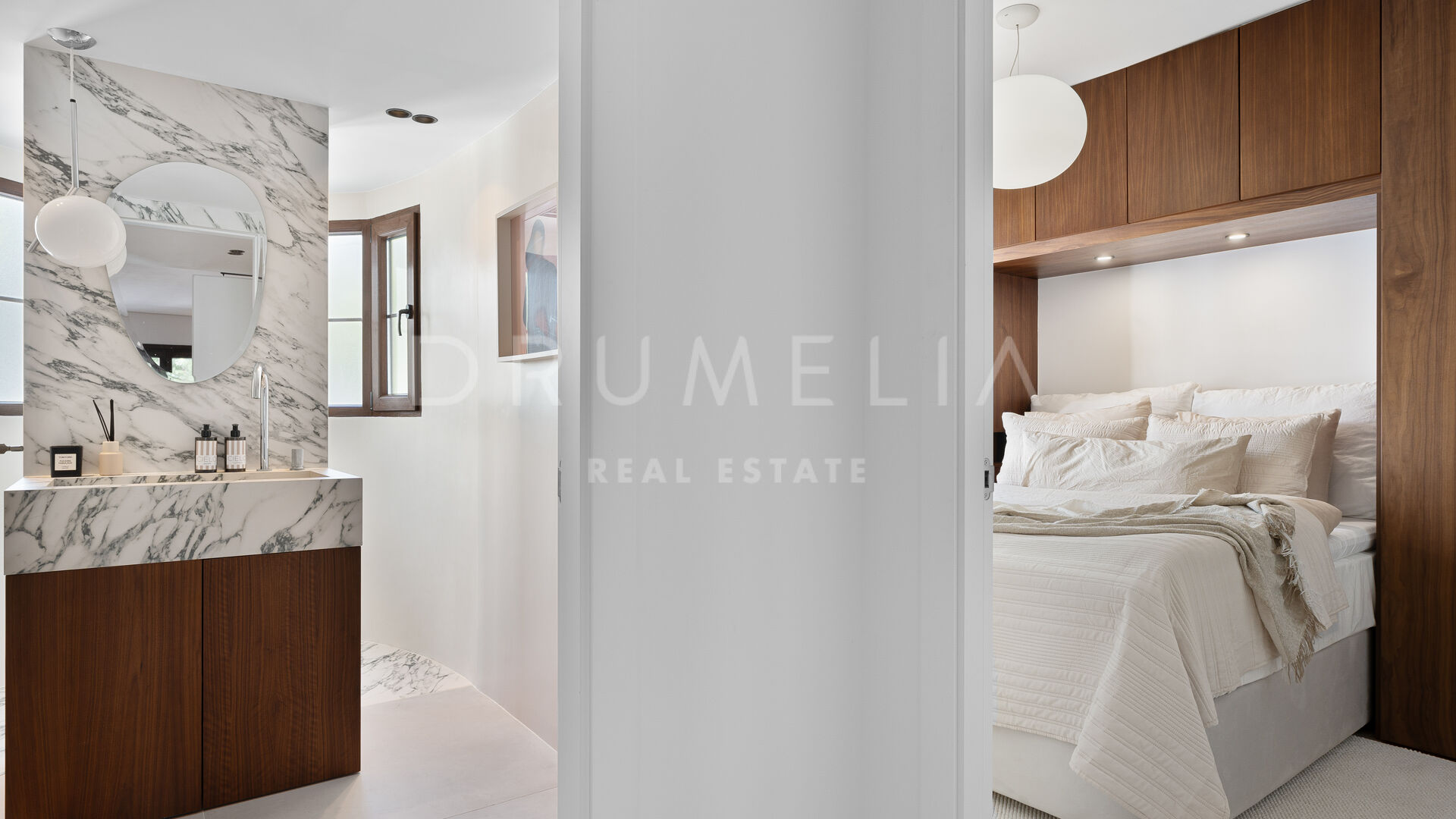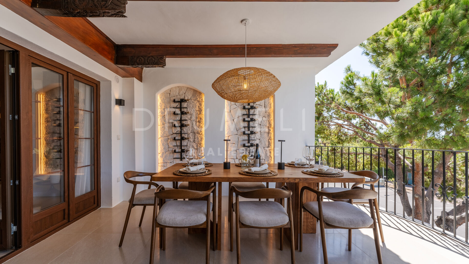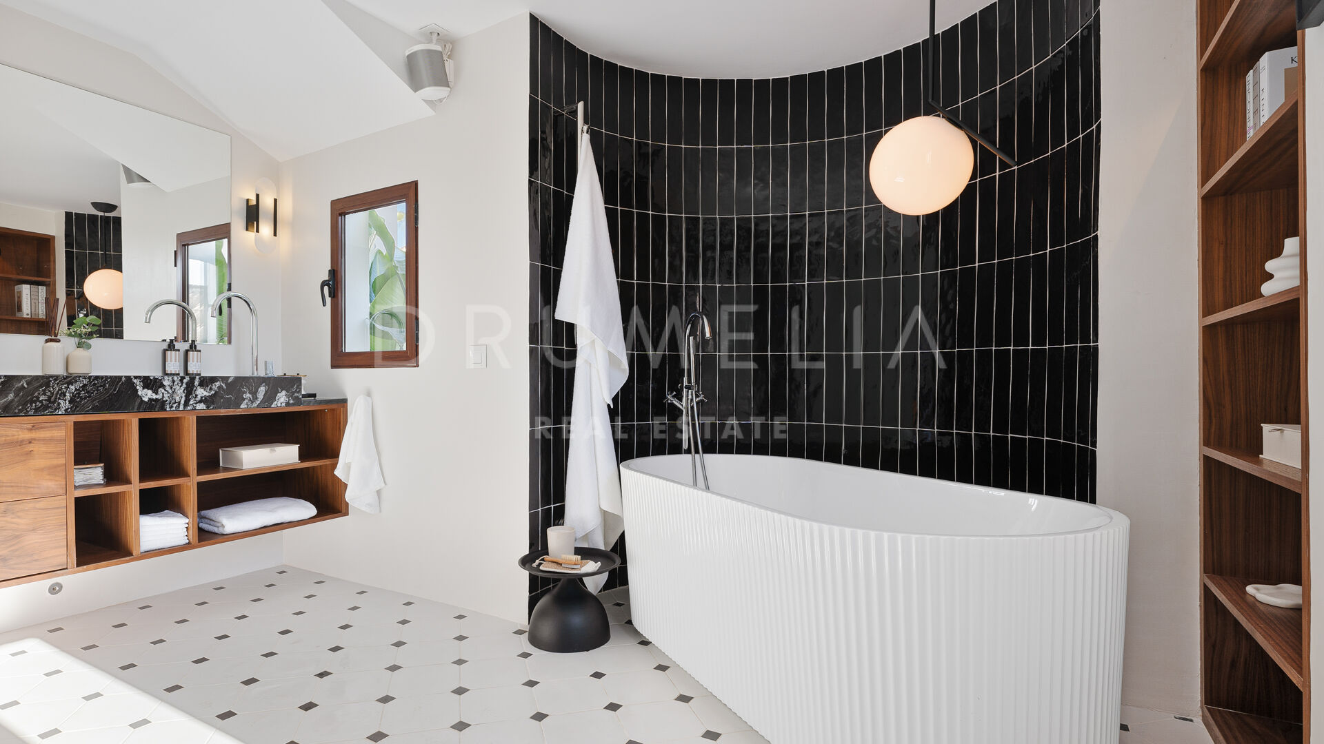 La résidence dispose de trois chambres généreuses et de deux salles de bains élégantes, dont une salle de bains attenante dans la chambre principale. Des toilettes pour les invités se trouvent au rez-de-chaussée. Des matériaux de haute qualité, tels que le bois, le microciment et des papiers peints chics, confèrent une grande sophistication aux espaces de vie. Entièrement meublée de pièces modernes et raffinées, la maison est prête à être occupée immédiatement. Le solarium est équipé d’une piscine à débordement qui permet de se détendre tout au long de la journée.
