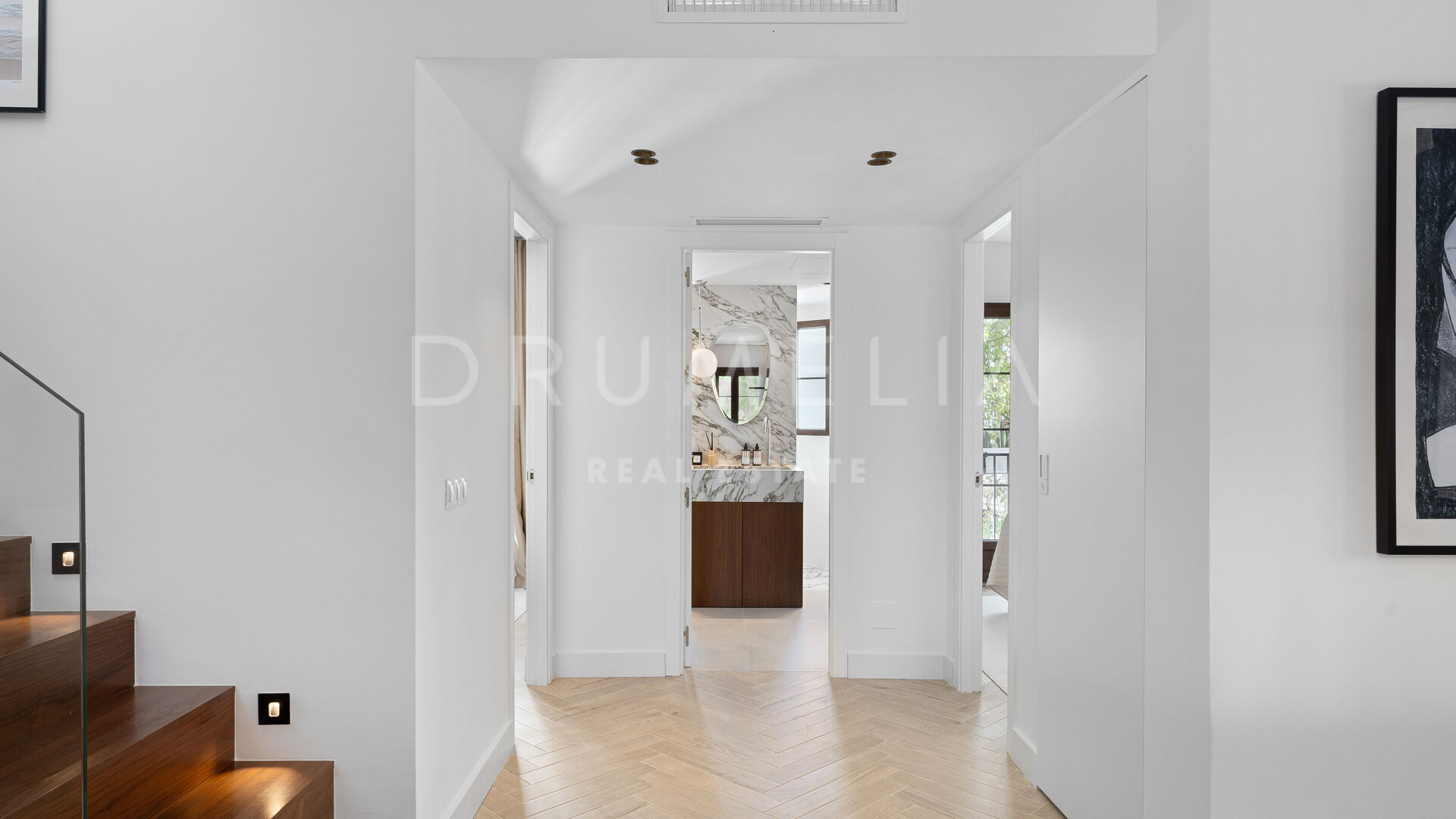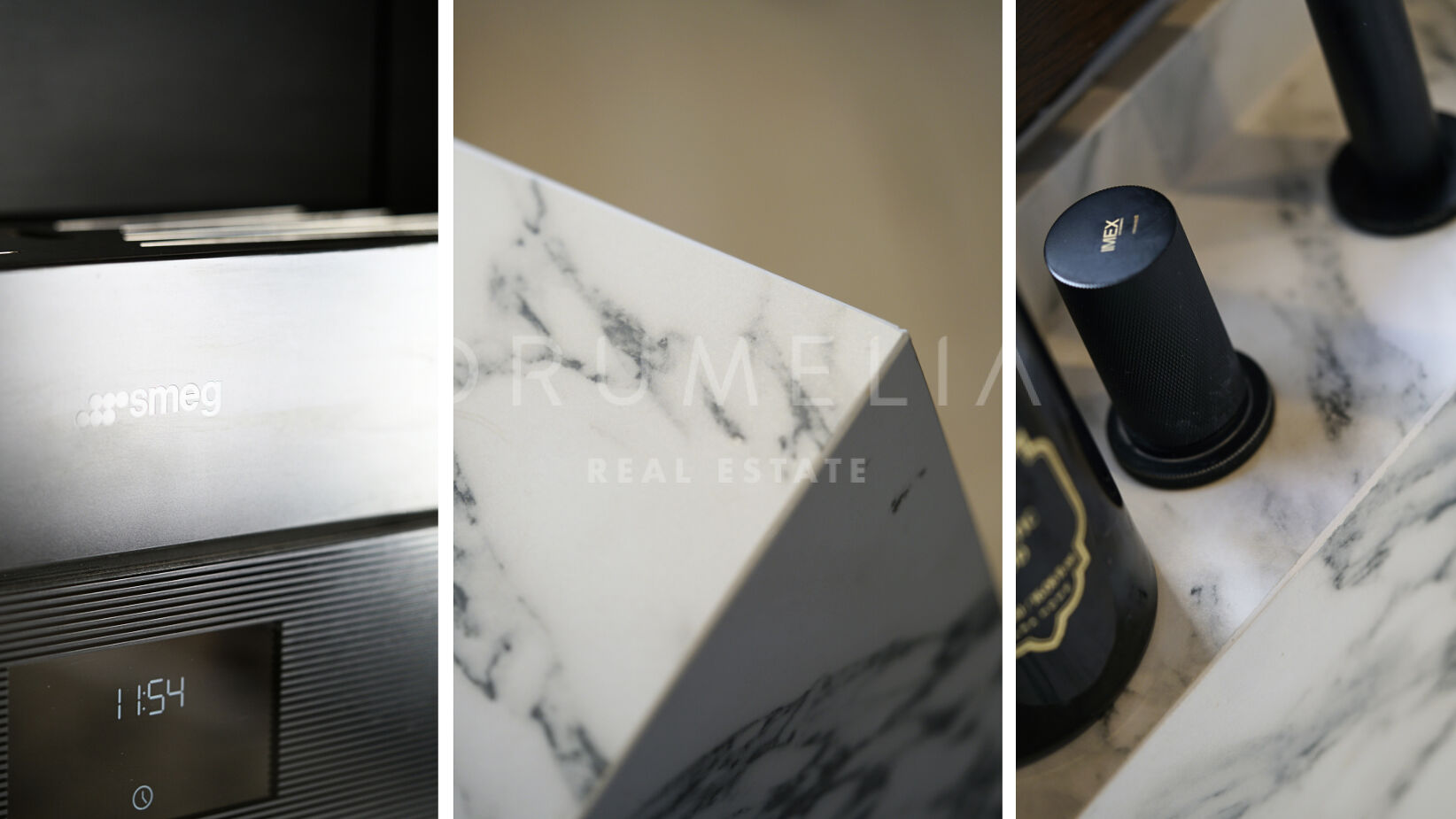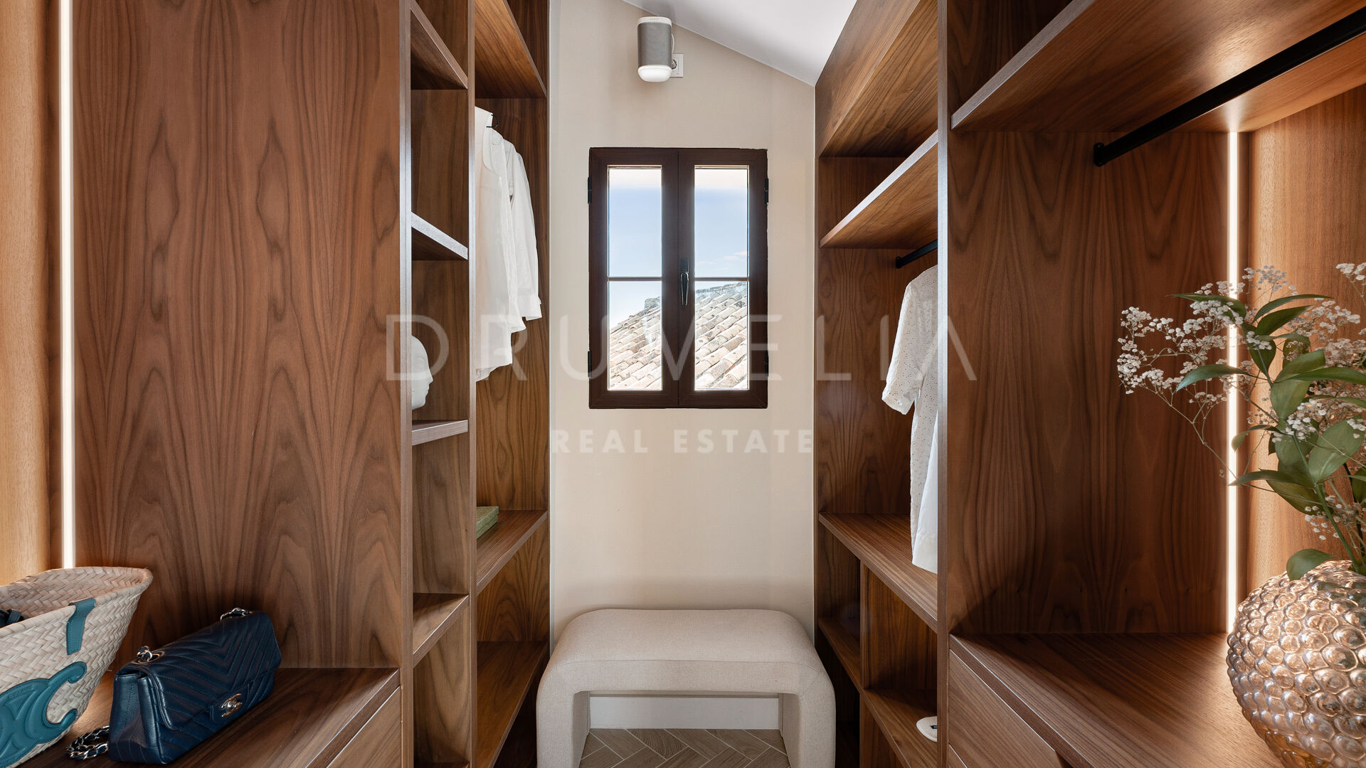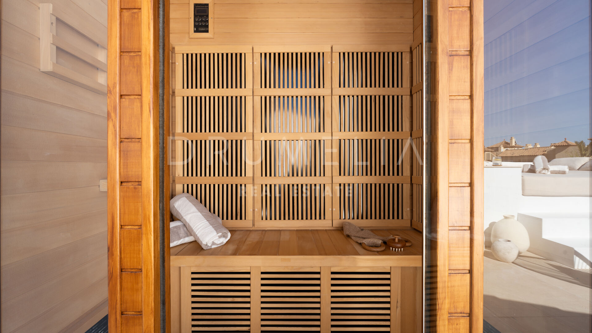 La résidence dispose de trois chambres généreuses et de deux salles de bains élégantes, dont une salle de bains attenante dans la chambre principale. Des toilettes pour les invités se trouvent au rez-de-chaussée. Des matériaux de haute qualité, tels que le bois, le microciment et des papiers peints chics, confèrent une grande sophistication aux espaces de vie. Entièrement meublée de pièces modernes et raffinées, la maison est prête à être occupée immédiatement. Le solarium est équipé d’une piscine à débordement qui permet de se détendre tout au long de la journée.