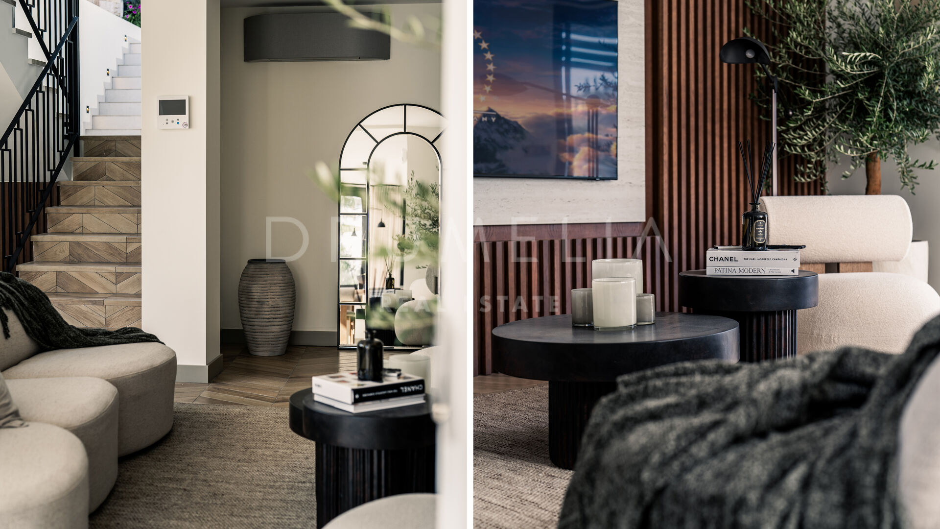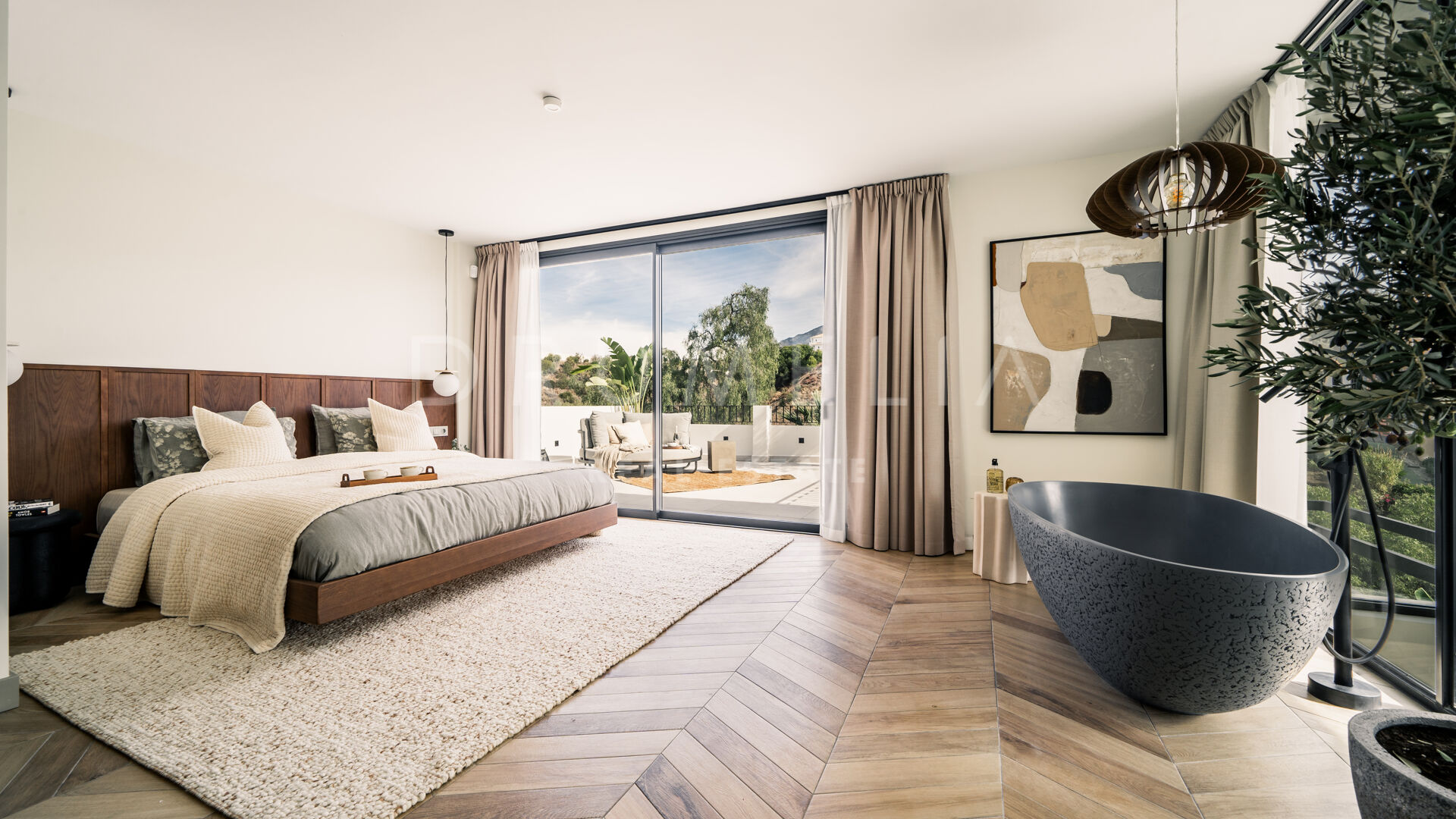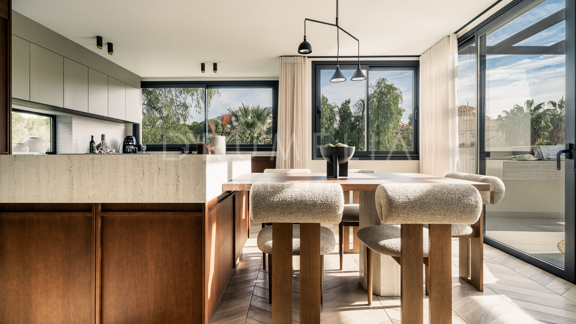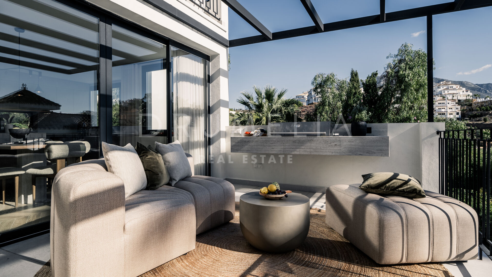 Entourée d’une végétation luxuriante et de propriétés de luxe similaires en Nouvelle Andalousie, cette élégante maison de 320 m² avec 235 m² de terrasses est située sur un terrain de 920 m². Elle est en parfaite harmonie avec son environnement, alliant modernité et caractéristiques méditerranéennes traditionnelles. La spectaculaire villa blanche au toit de terre cuite et aux accents de pierre et de bois est orientée sud/est. Vous serez fasciné par les vues époustouflantes sur la mer et les montagnes. Vivre dans la maison la plus moderne avec une vue idyllique sur la nature – il y a toujours quelque chose de spécial à ce sujet ! Grâce aux grandes fenêtres et au concept de plan ouvert, la maison est pleine de lumière et d’air. La palette de couleurs agréable à l’œil est dictée par la nature elle-même.